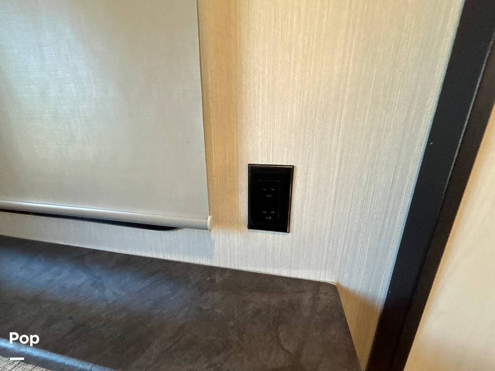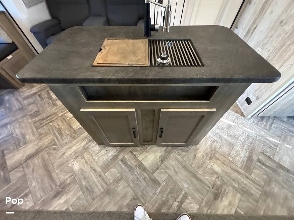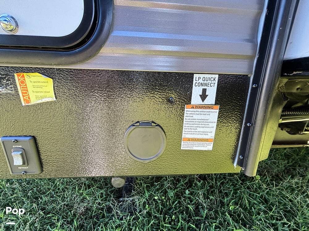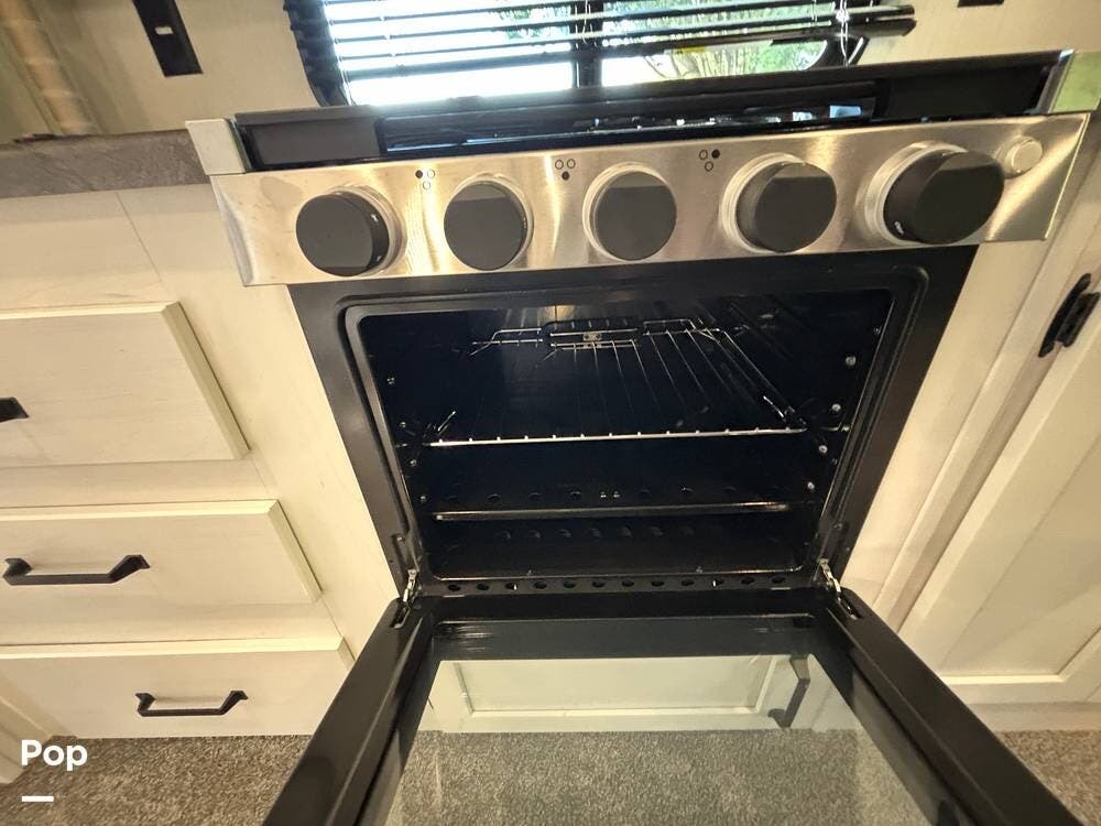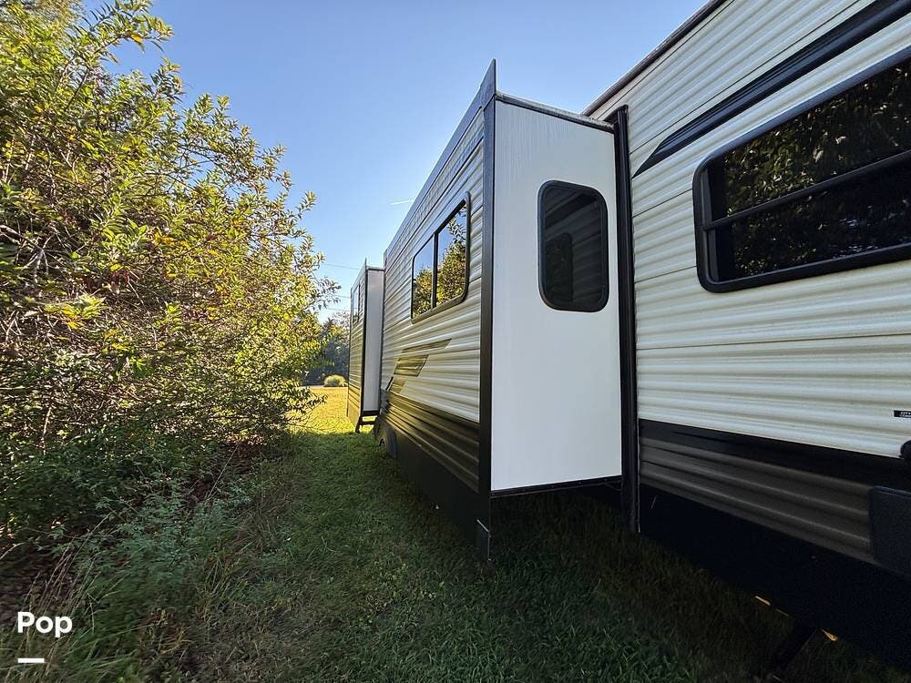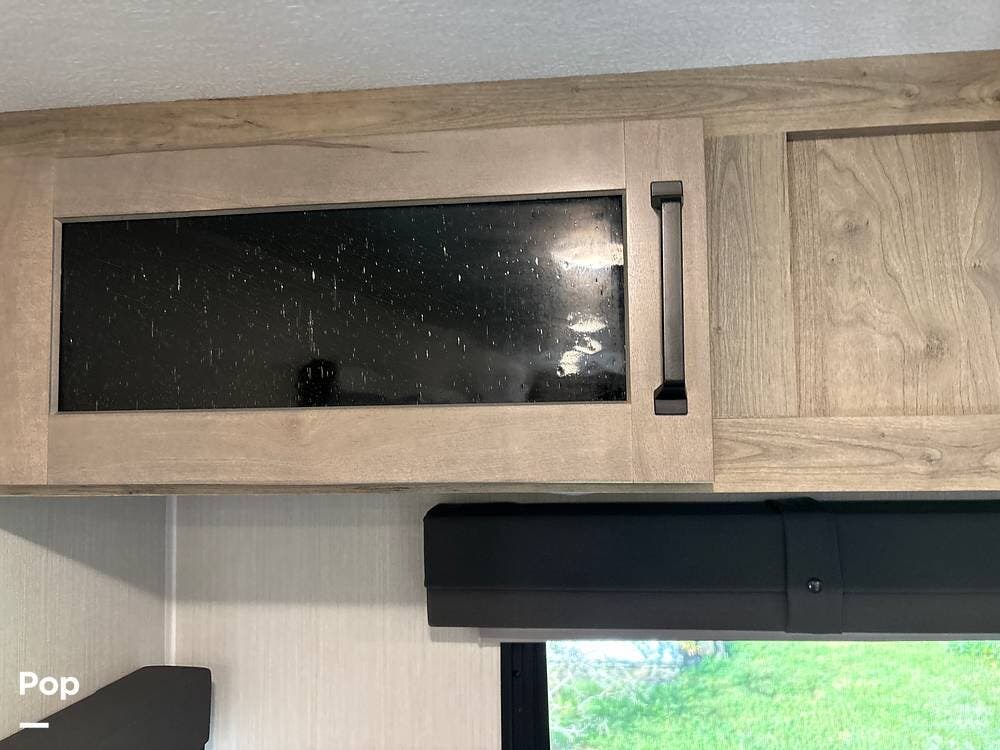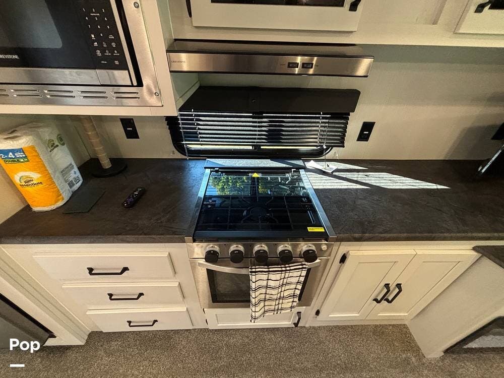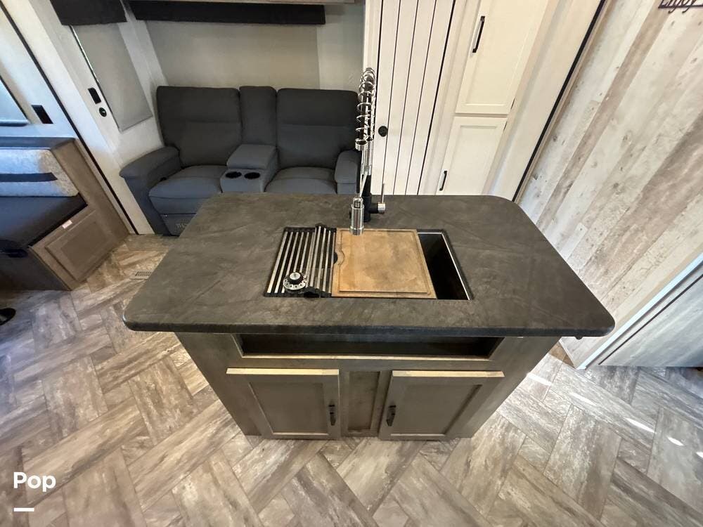 On the exterior, you'll find a sturdy construction with a fiberglass front cap, a large power awning, and pass-through storage for all your gear. The unit is equipped with multiple slide-outs, giving you expanded interior space once you're parked, and an outdoor kitchen that allows you to cook and enjoy meals under the open sky. Easy-to-use electric stabilizer jacks and an enclosed underbelly add both convenience and protection for year-round camping.
