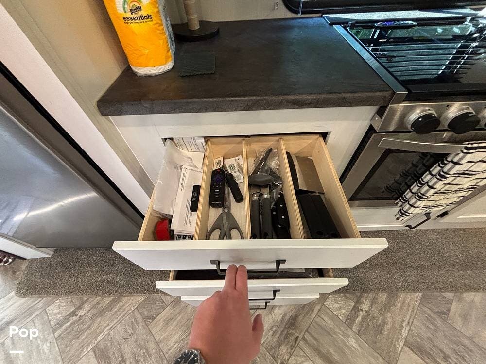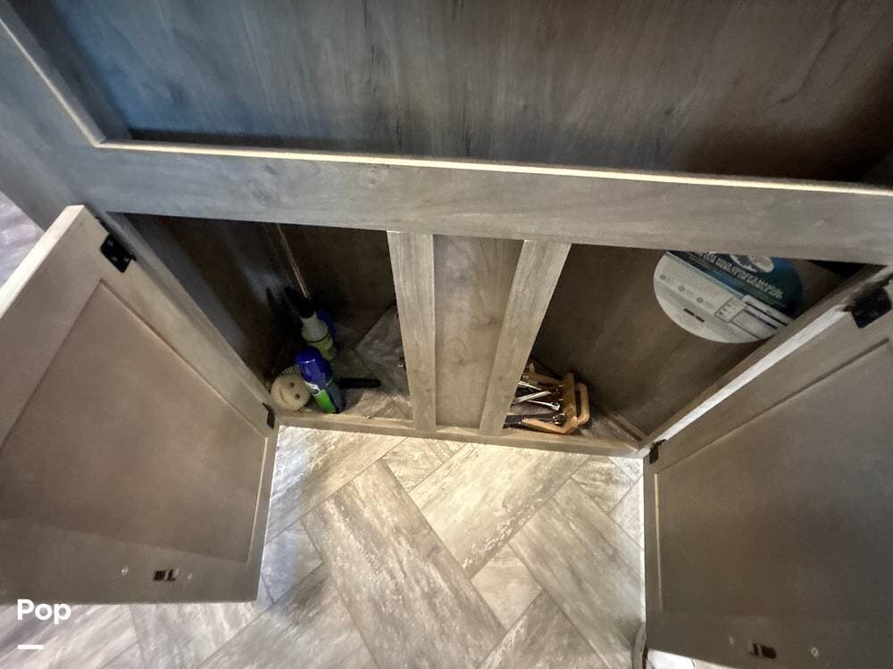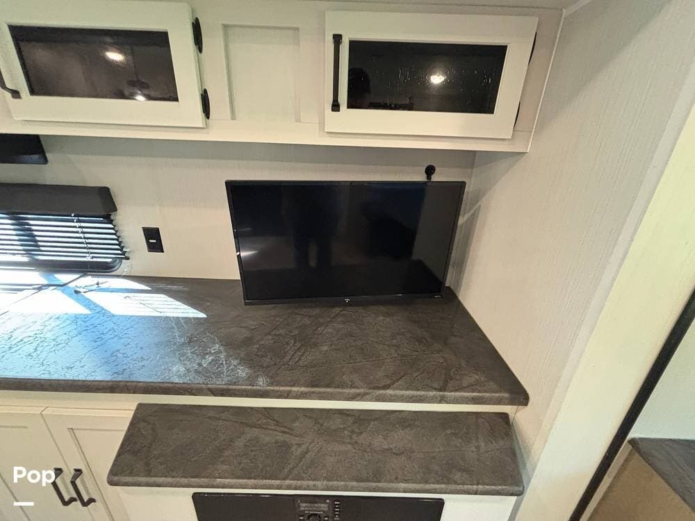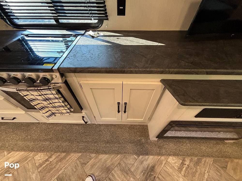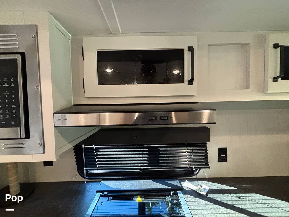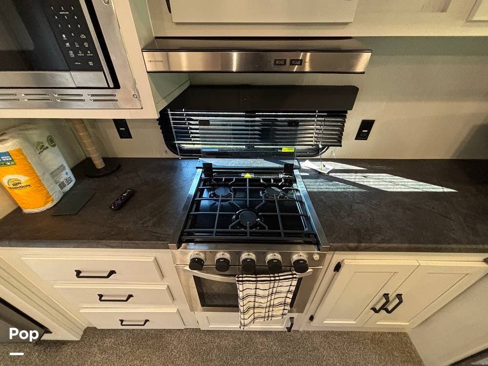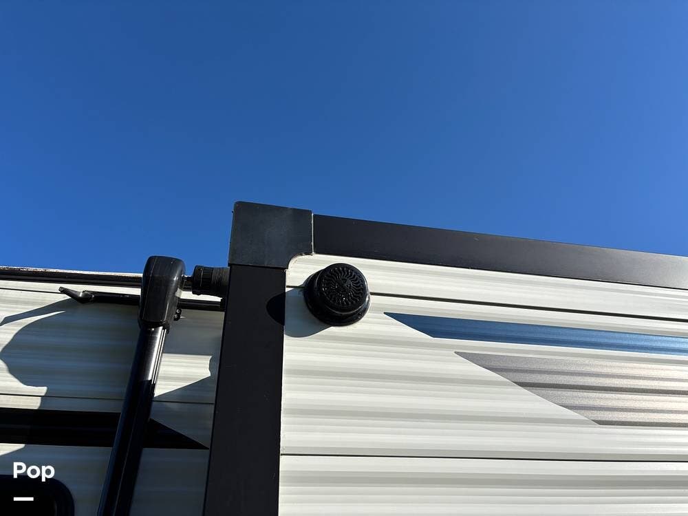 On the exterior, you'll find a sturdy construction with a fiberglass front cap, a large power awning, and pass-through storage for all your gear. The unit is equipped with multiple slide-outs, giving you expanded interior space once you're parked, and an outdoor kitchen that allows you to cook and enjoy meals under the open sky. Easy-to-use electric stabilizer jacks and an enclosed underbelly add both convenience and protection for year-round camping.