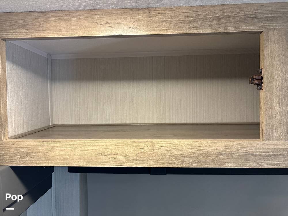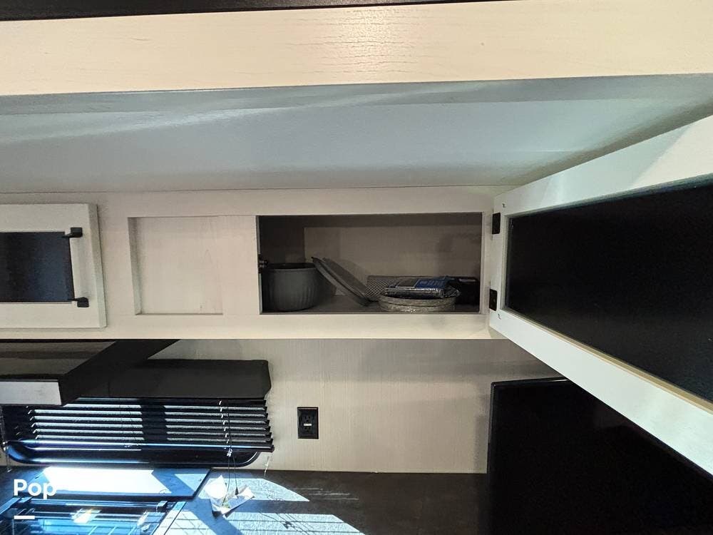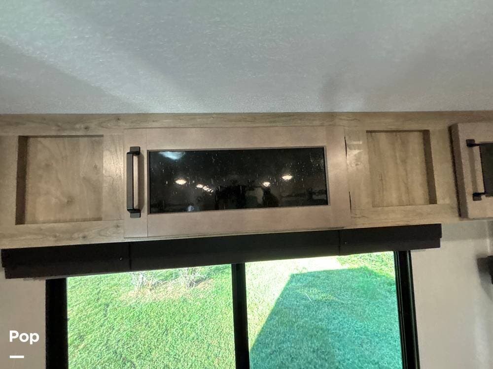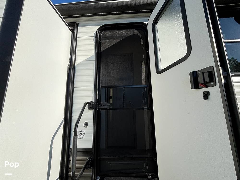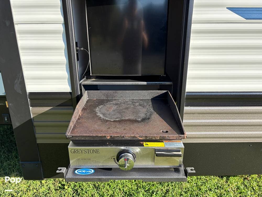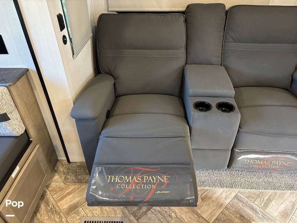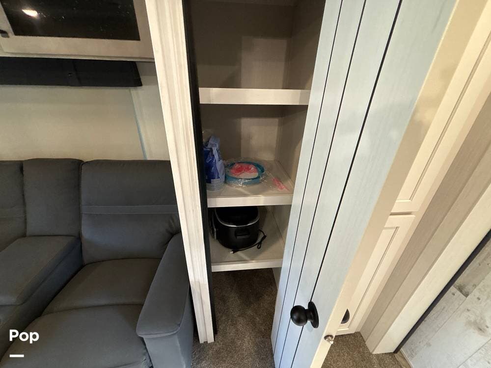 On the exterior, you'll find a sturdy construction with a fiberglass front cap, a large power awning, and pass-through storage for all your gear. The unit is equipped with multiple slide-outs, giving you expanded interior space once you're parked, and an outdoor kitchen that allows you to cook and enjoy meals under the open sky. Easy-to-use electric stabilizer jacks and an enclosed underbelly add both convenience and protection for year-round camping.