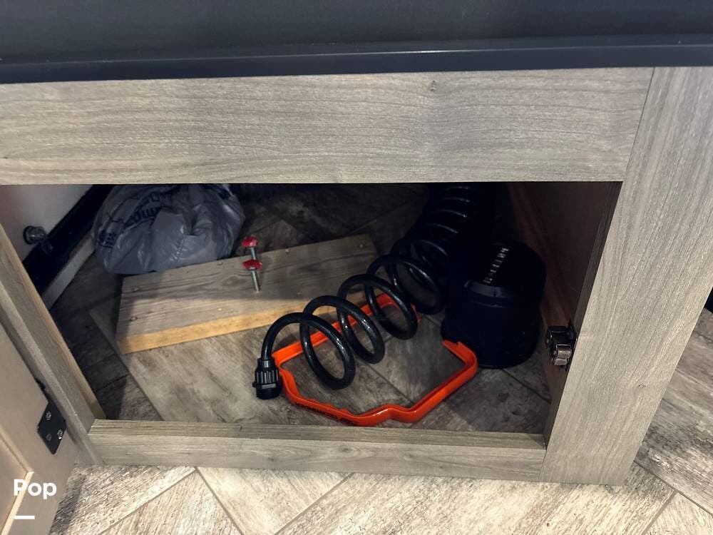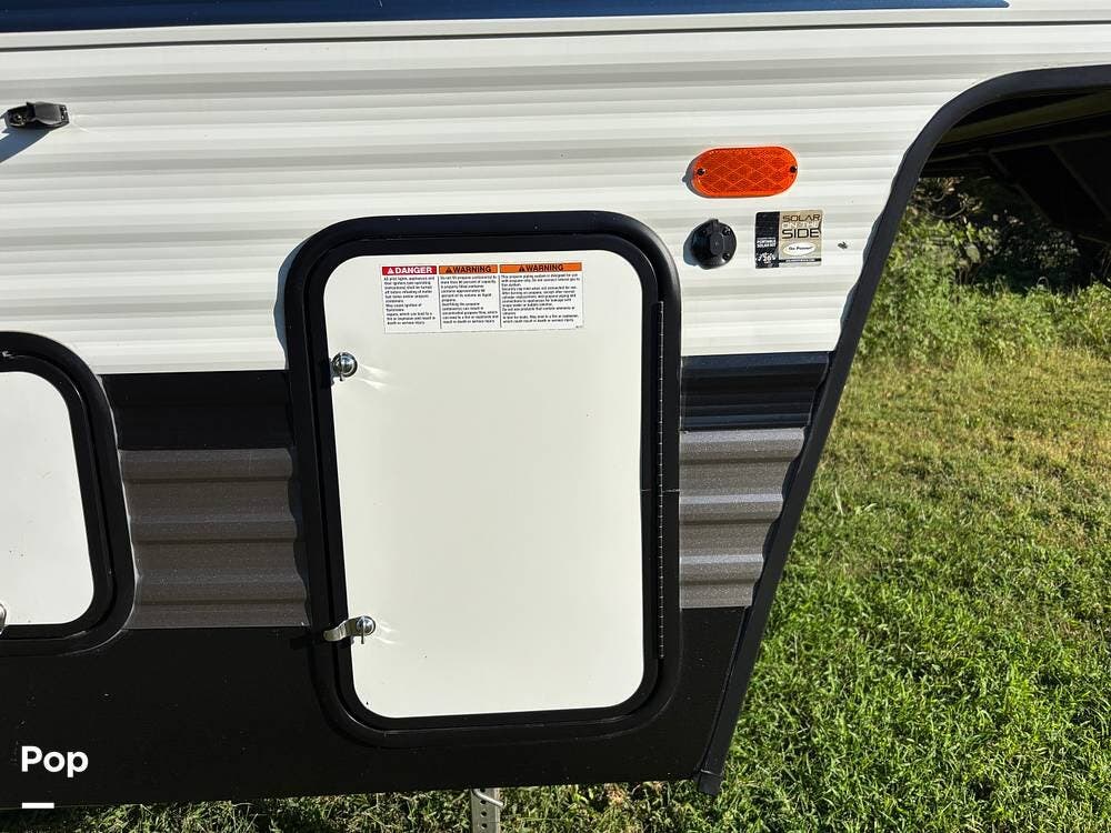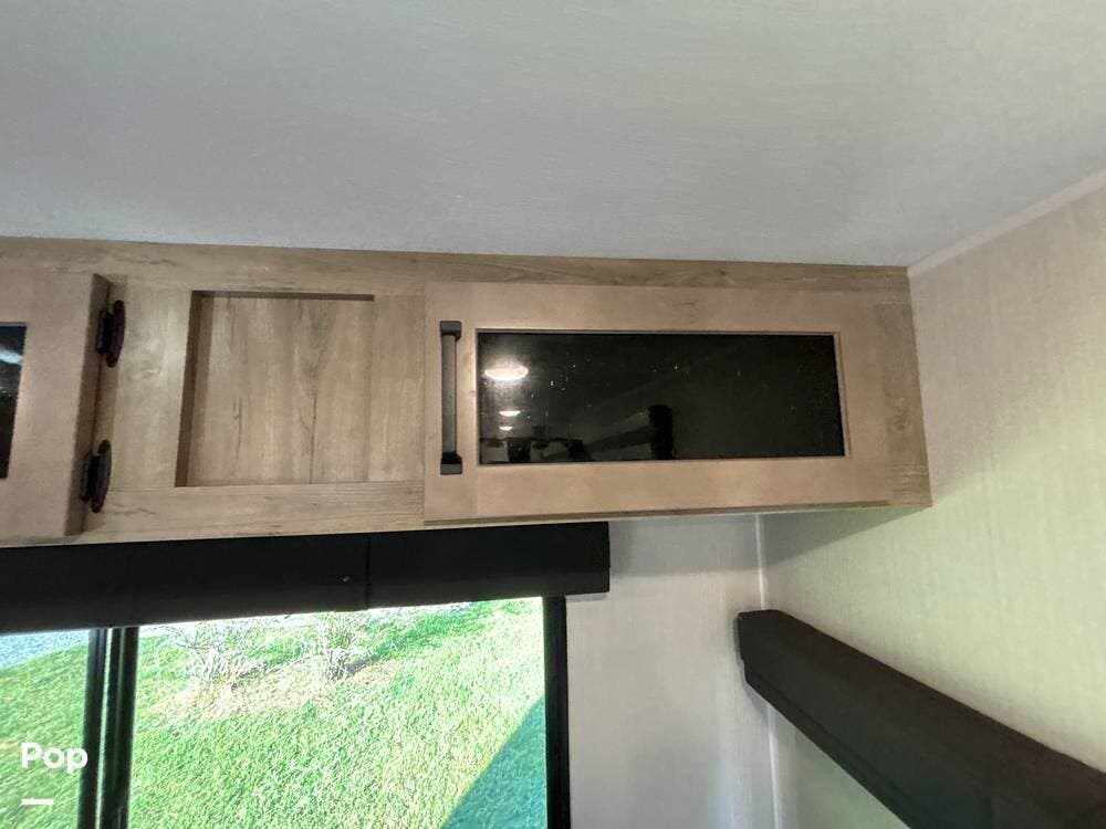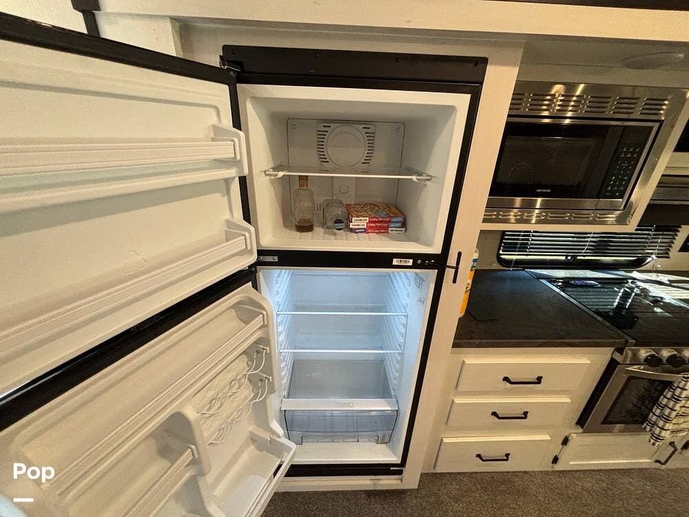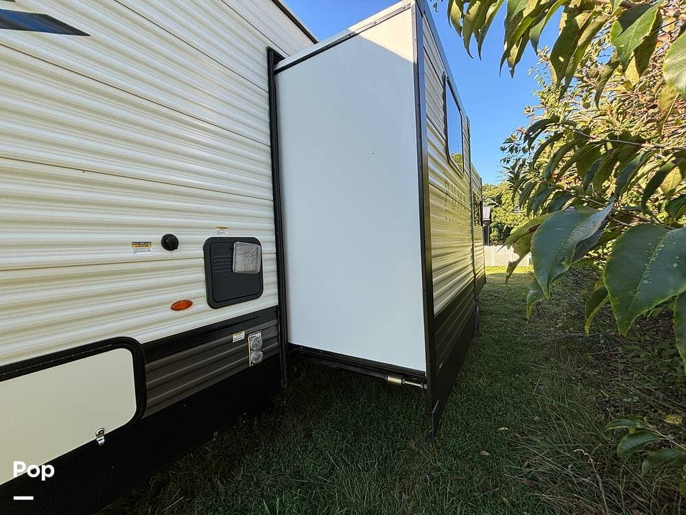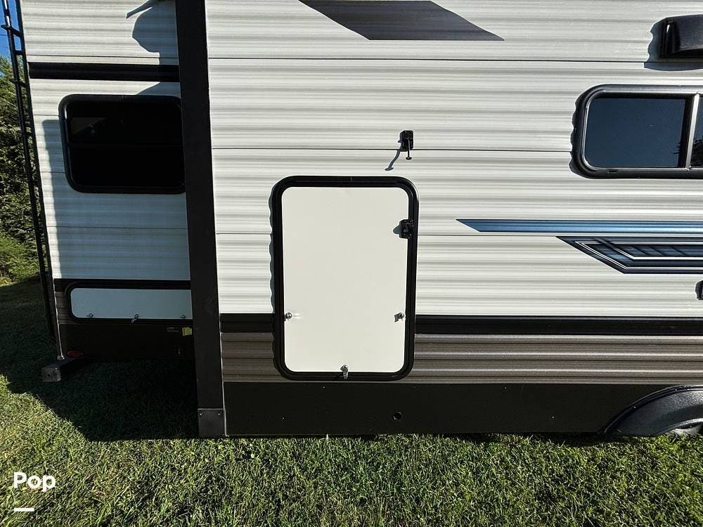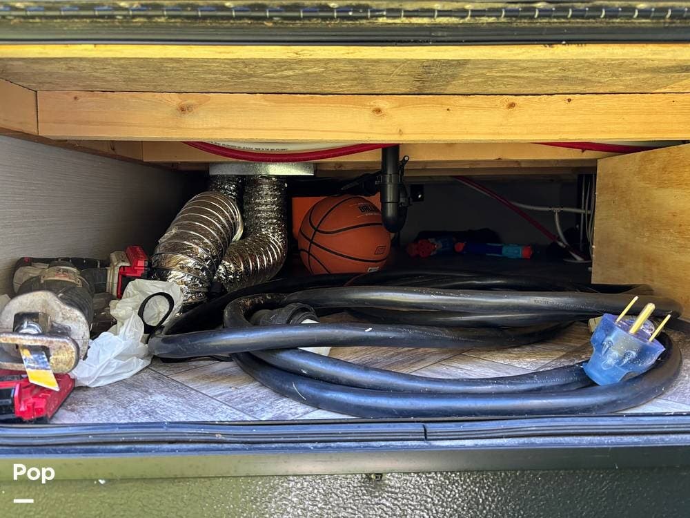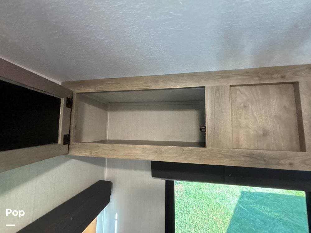 On the exterior, you'll find a sturdy construction with a fiberglass front cap, a large power awning, and pass-through storage for all your gear. The unit is equipped with multiple slide-outs, giving you expanded interior space once you're parked, and an outdoor kitchen that allows you to cook and enjoy meals under the open sky. Easy-to-use electric stabilizer jacks and an enclosed underbelly add both convenience and protection for year-round camping.