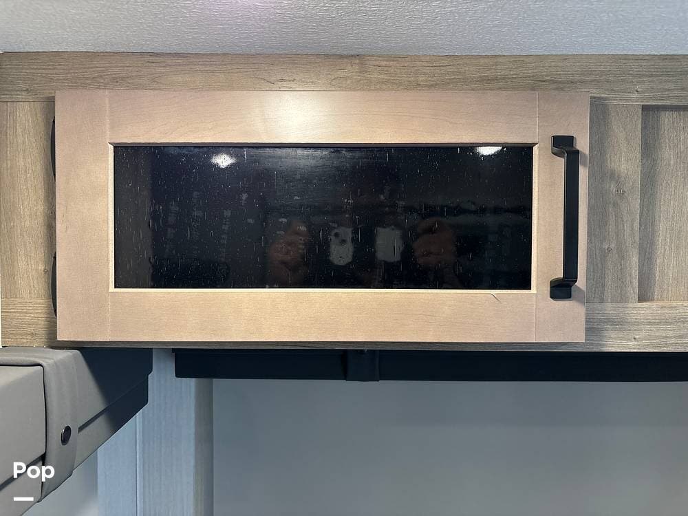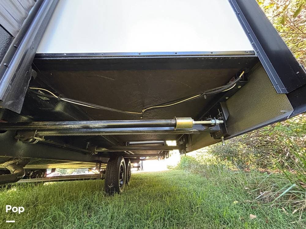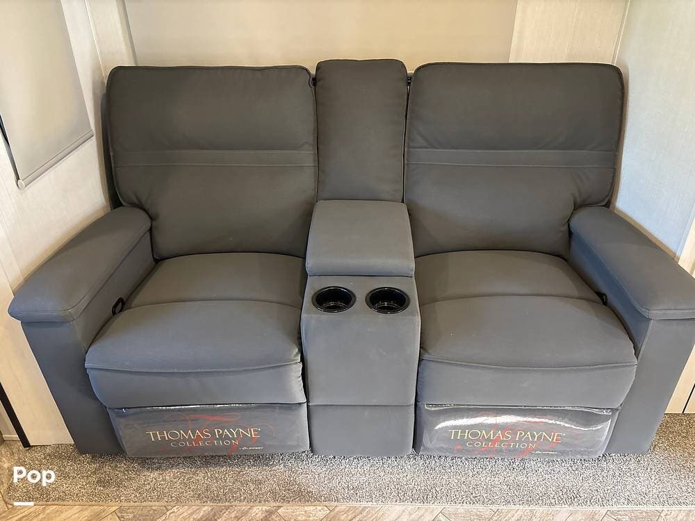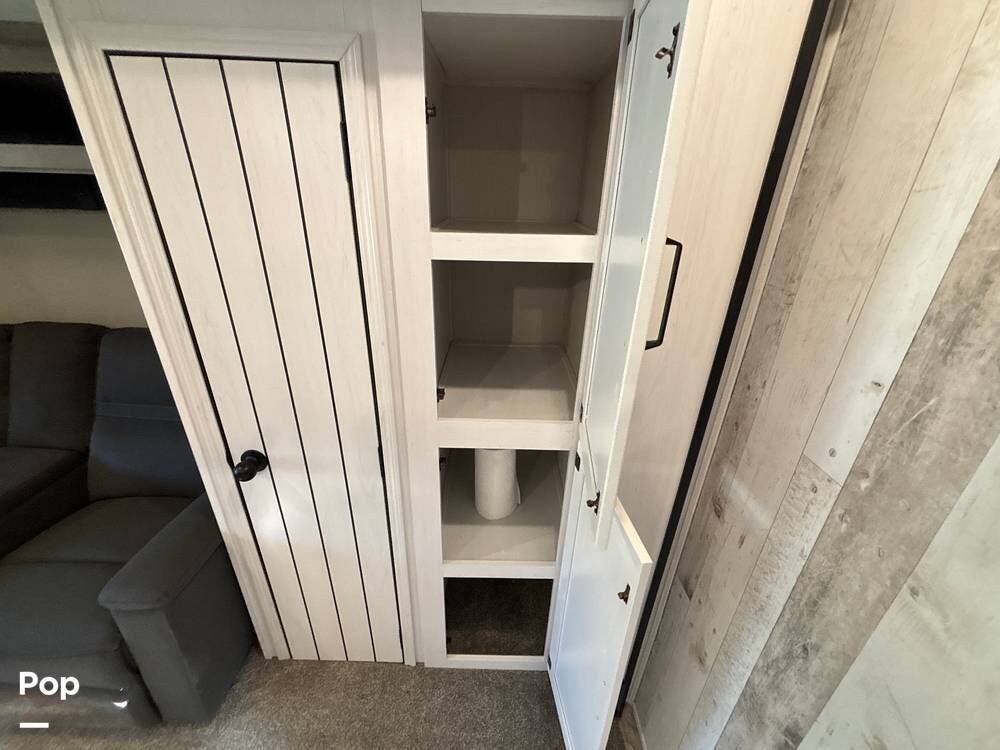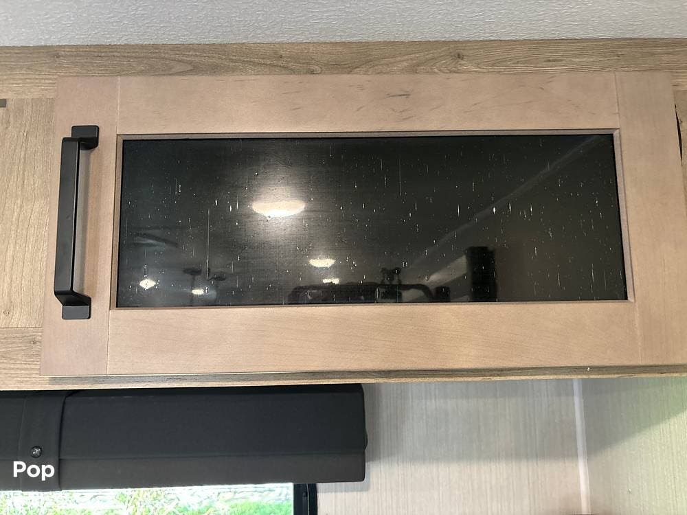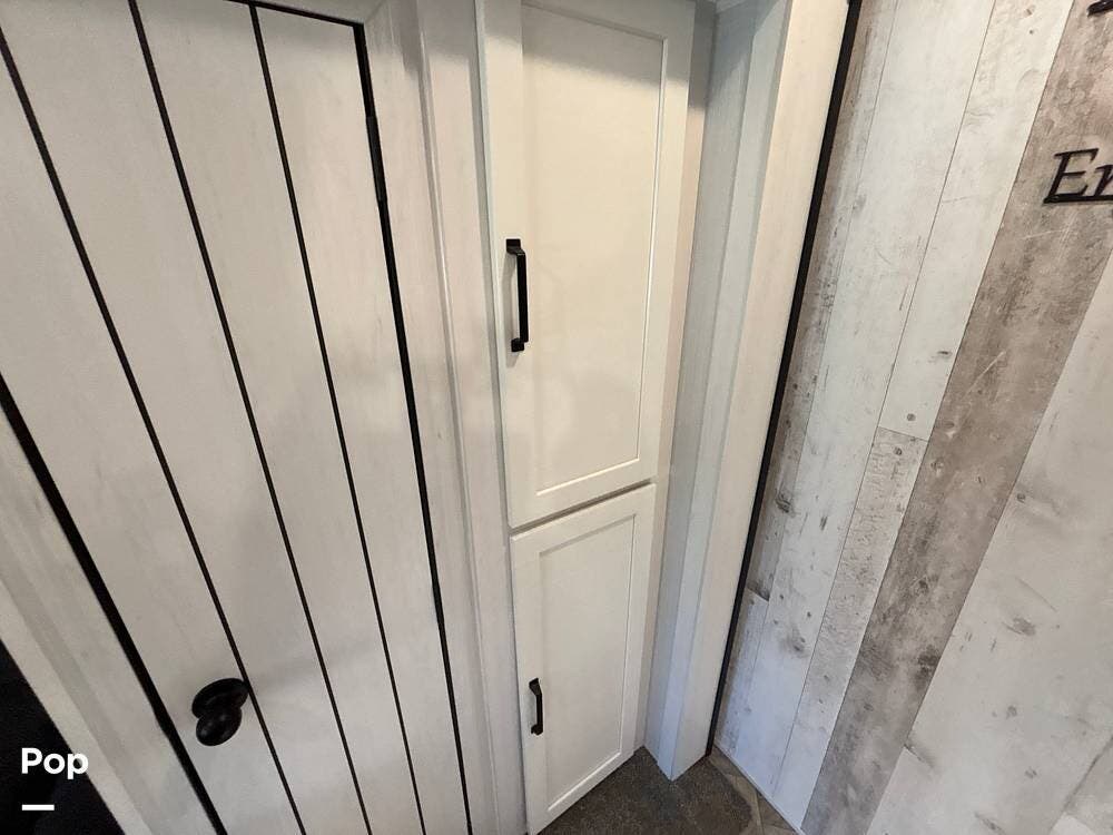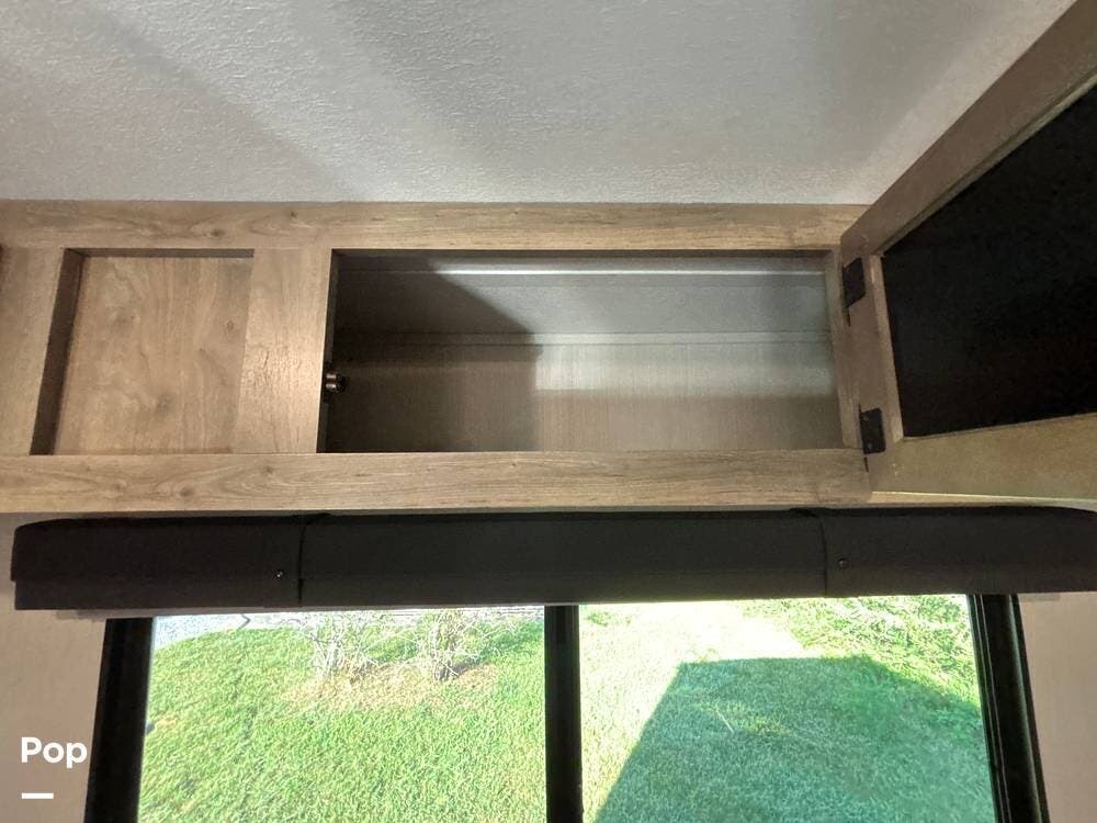 On the exterior, you'll find a sturdy construction with a fiberglass front cap, a large power awning, and pass-through storage for all your gear. The unit is equipped with multiple slide-outs, giving you expanded interior space once you're parked, and an outdoor kitchen that allows you to cook and enjoy meals under the open sky. Easy-to-use electric stabilizer jacks and an enclosed underbelly add both convenience and protection for year-round camping.