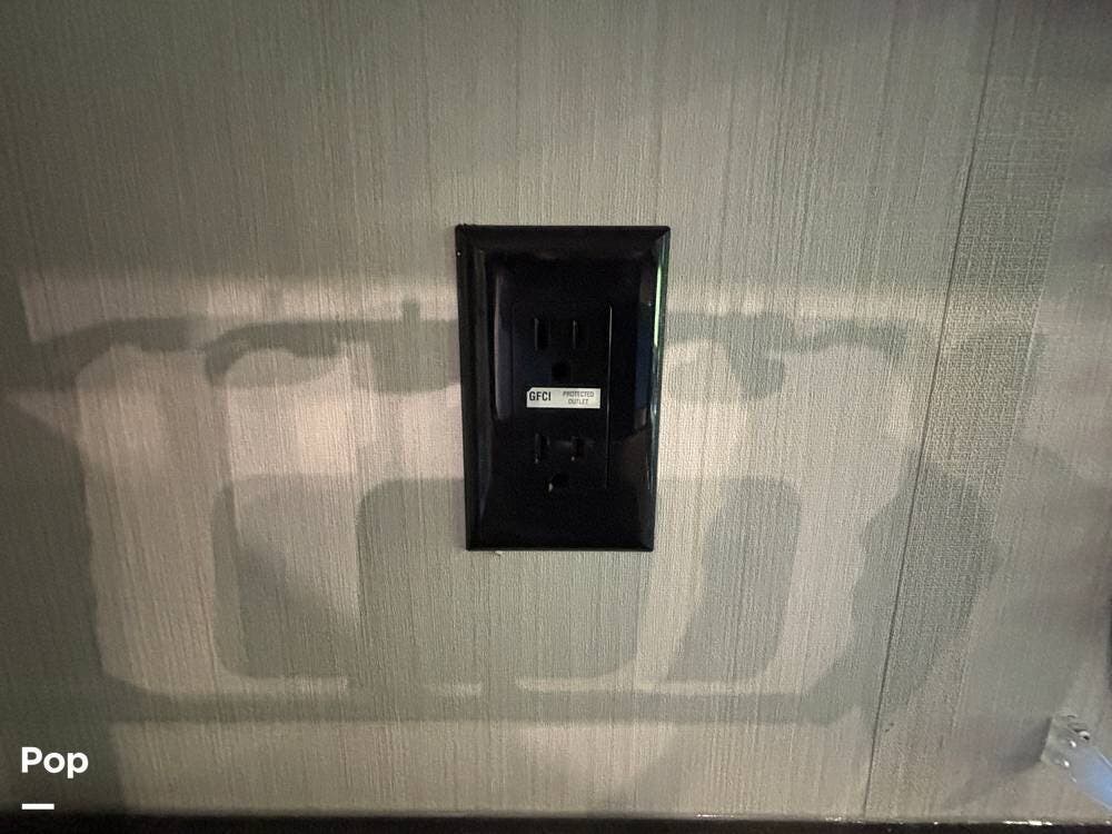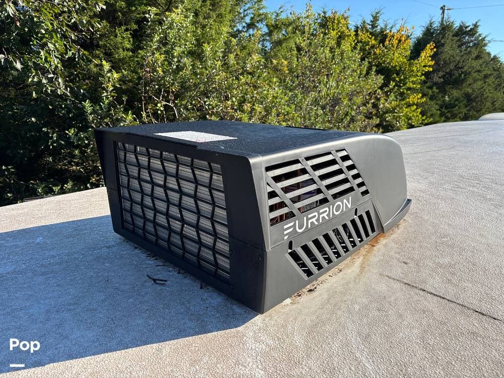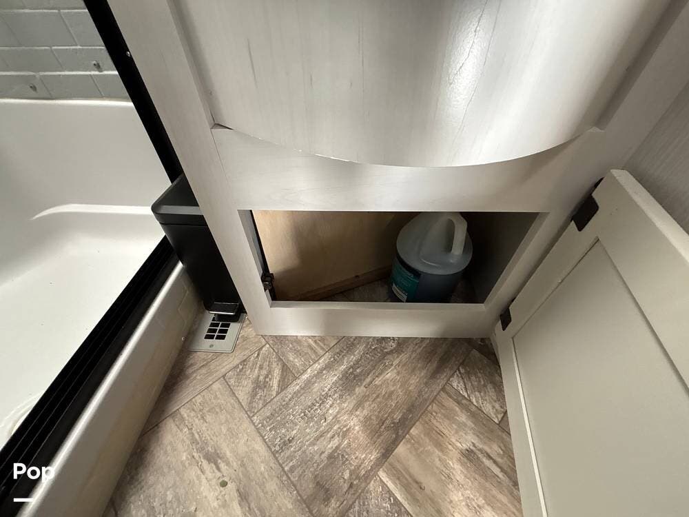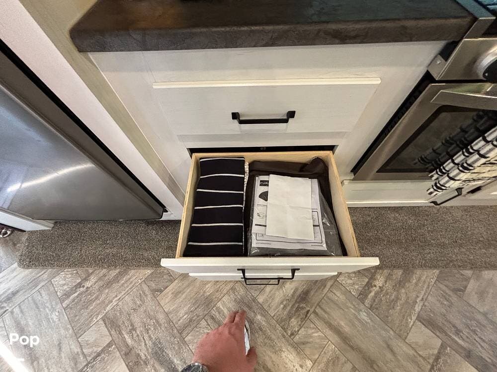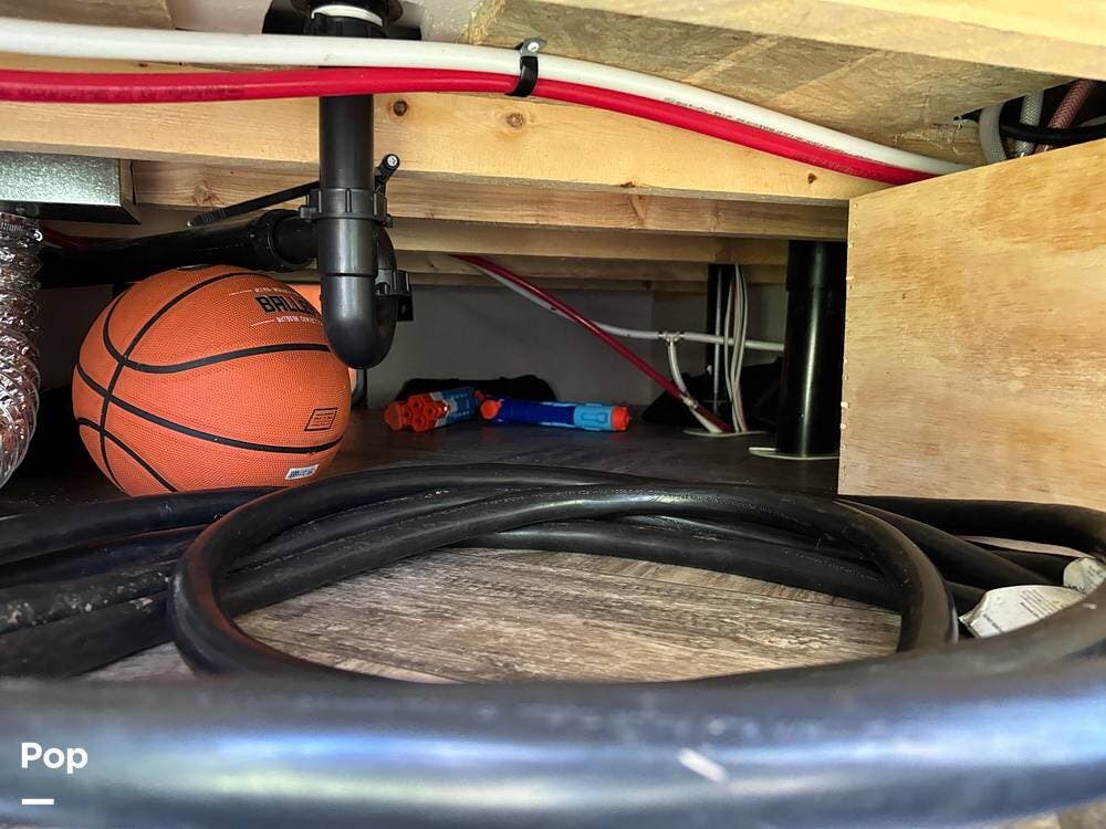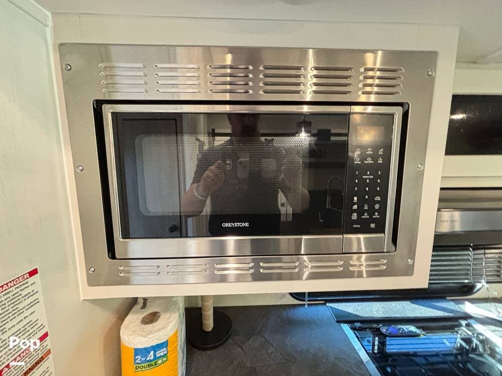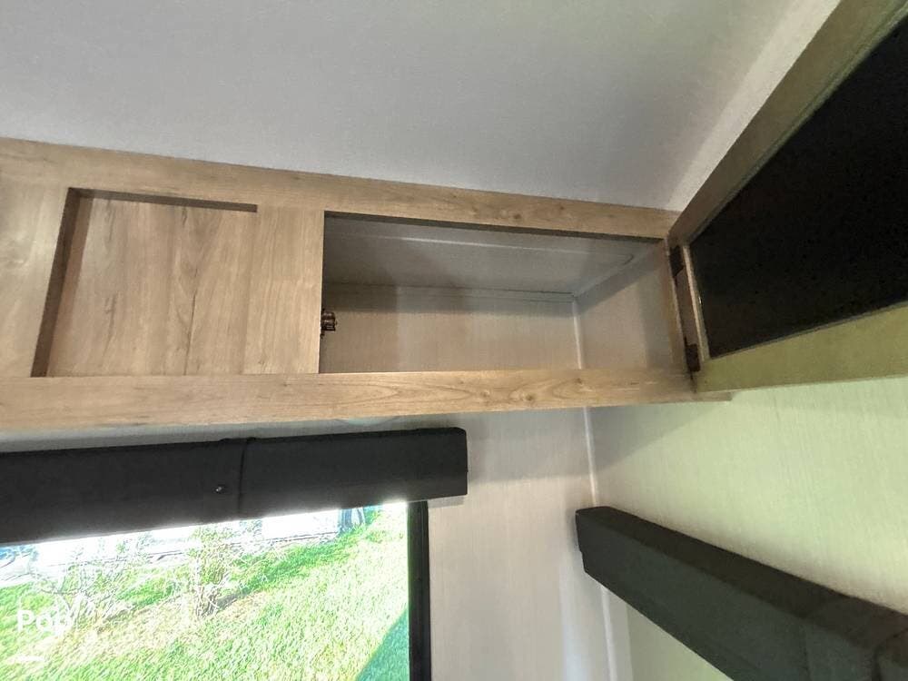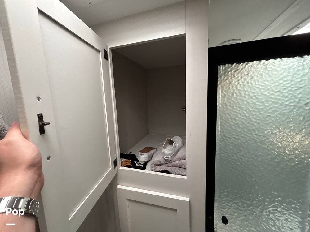 On the exterior, you'll find a sturdy construction with a fiberglass front cap, a large power awning, and pass-through storage for all your gear. The unit is equipped with multiple slide-outs, giving you expanded interior space once you're parked, and an outdoor kitchen that allows you to cook and enjoy meals under the open sky. Easy-to-use electric stabilizer jacks and an enclosed underbelly add both convenience and protection for year-round camping.