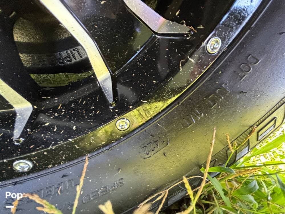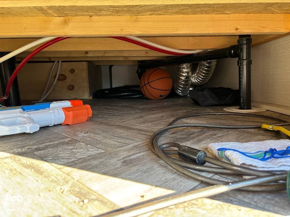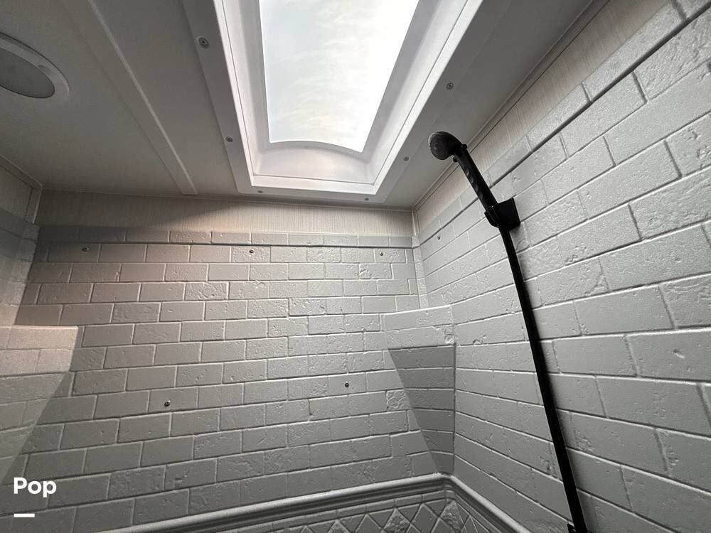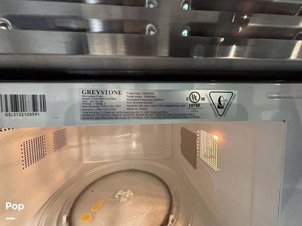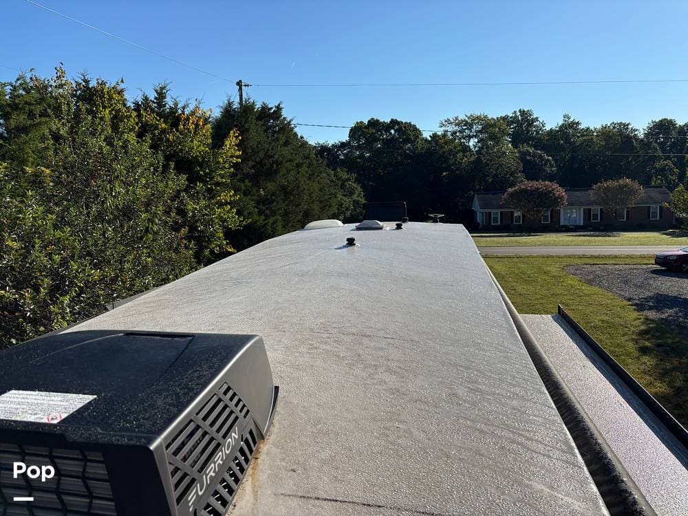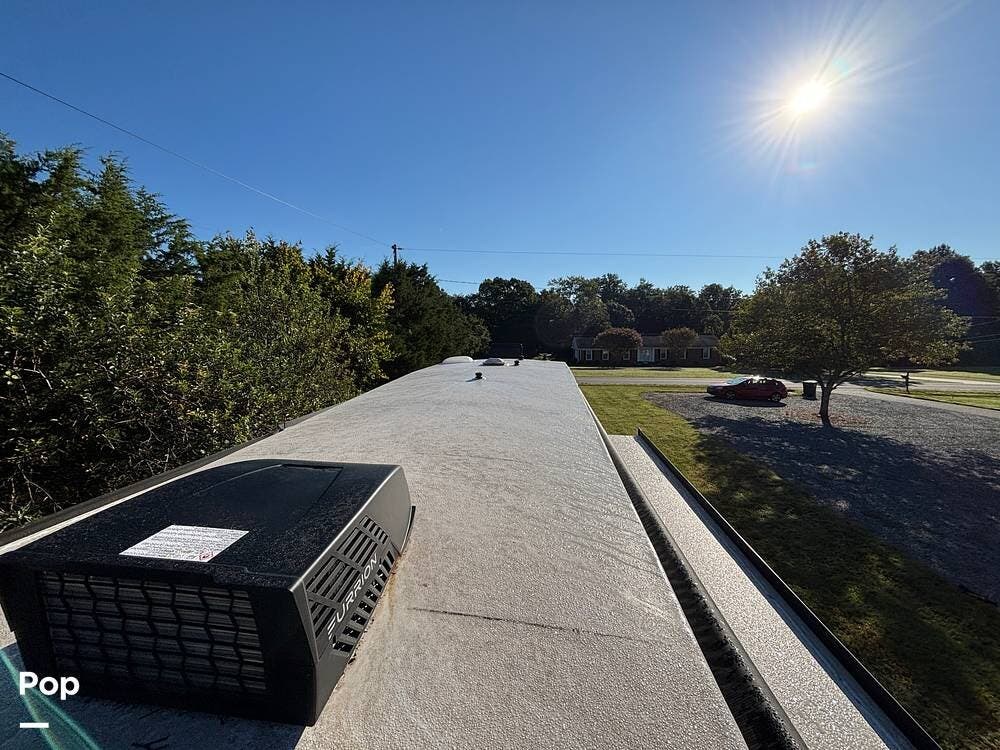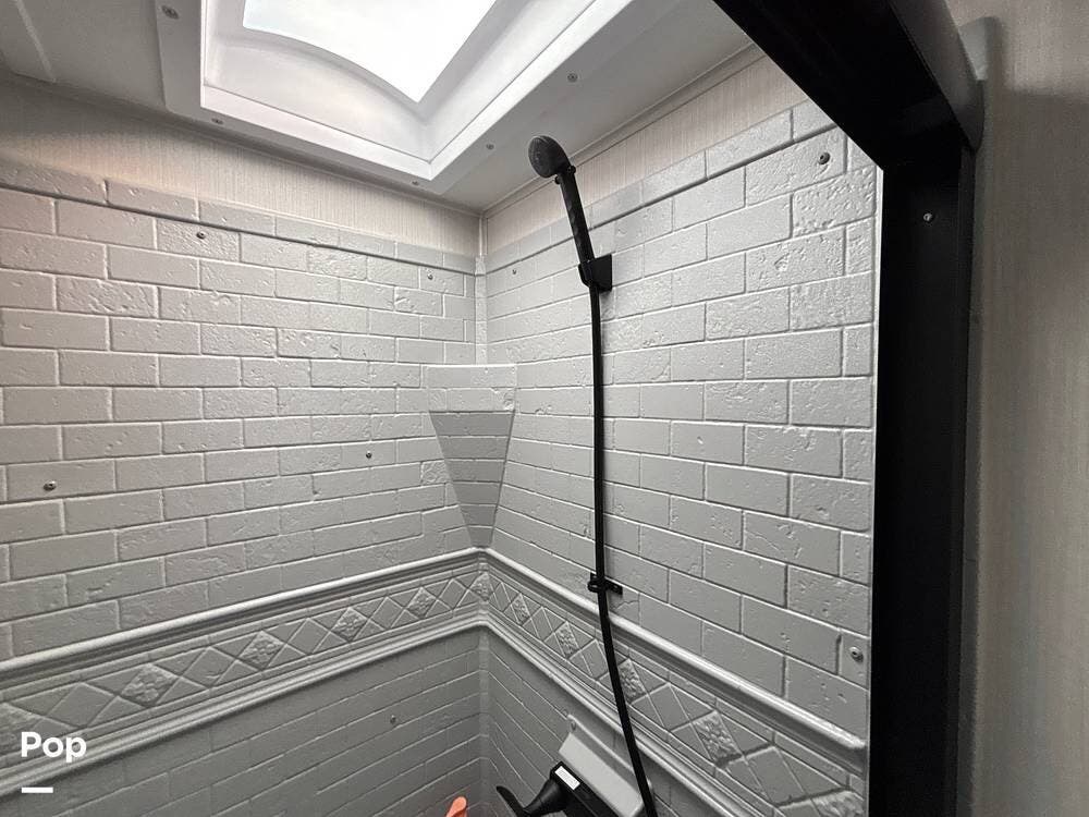 On the exterior, you'll find a sturdy construction with a fiberglass front cap, a large power awning, and pass-through storage for all your gear. The unit is equipped with multiple slide-outs, giving you expanded interior space once you're parked, and an outdoor kitchen that allows you to cook and enjoy meals under the open sky. Easy-to-use electric stabilizer jacks and an enclosed underbelly add both convenience and protection for year-round camping.
