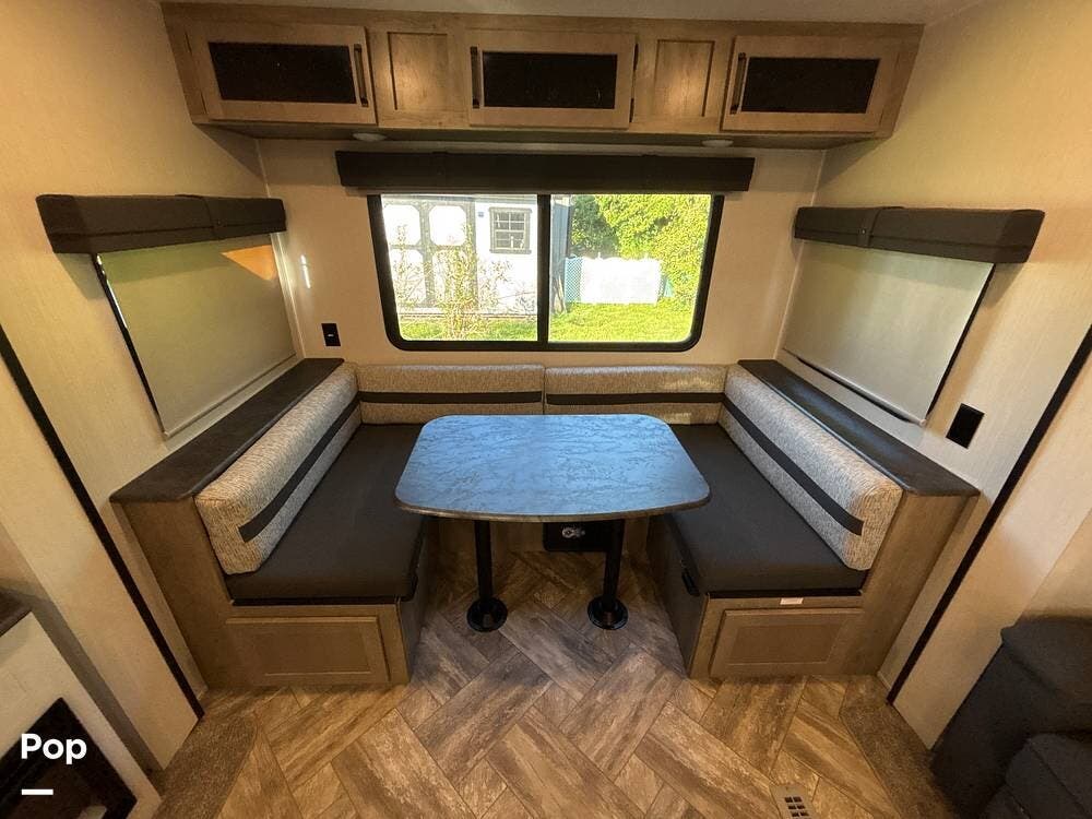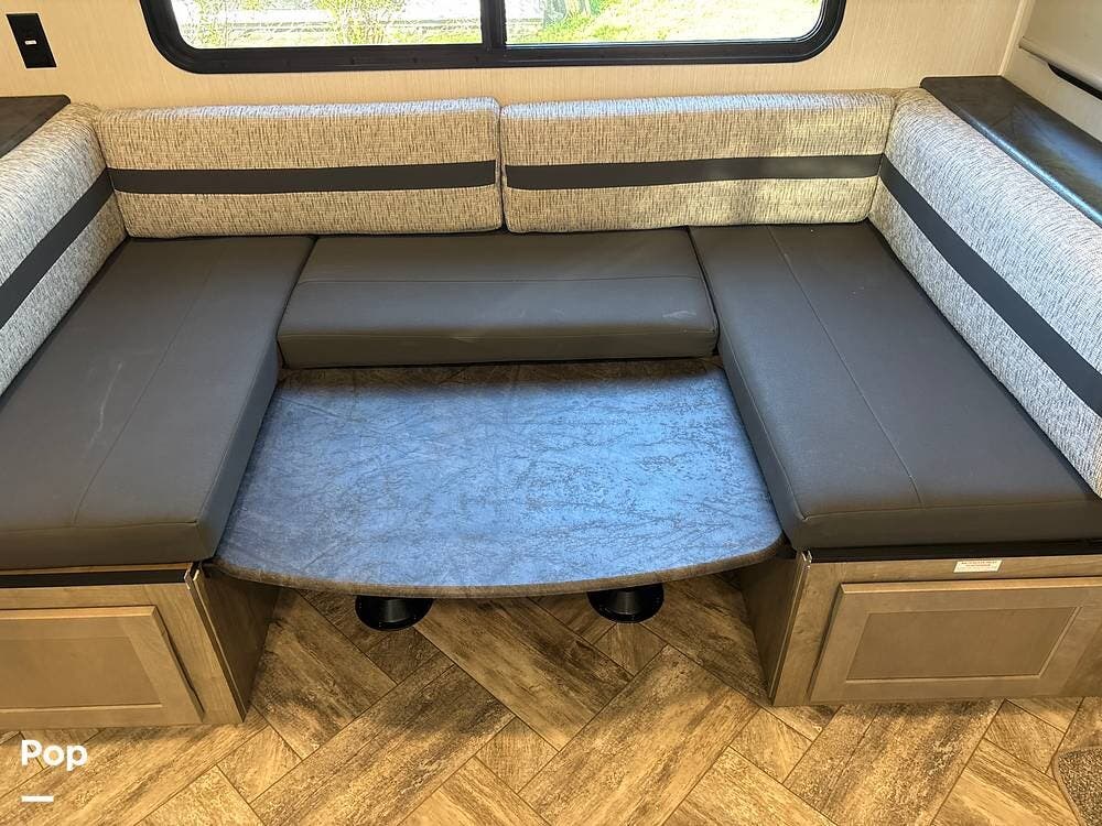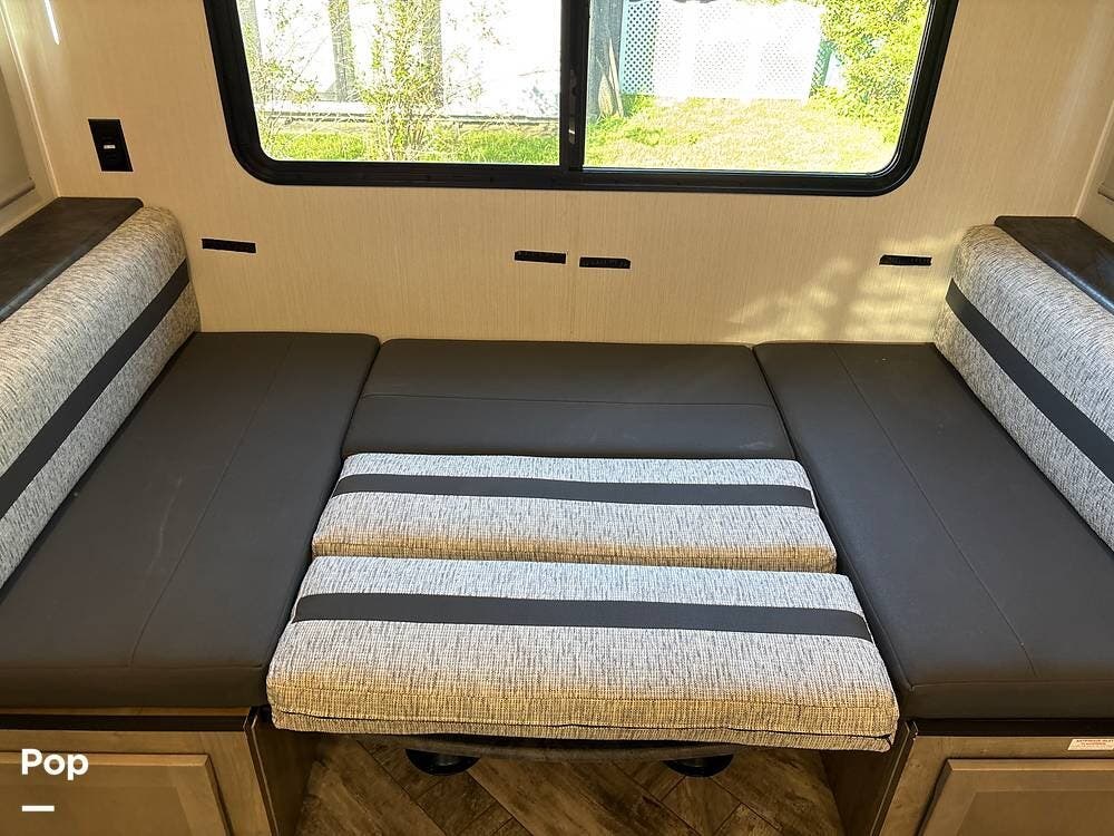Stepping inside, the living area provides a comfortable space to relax and entertain. The large slide creates an open floor plan, where you'll find a sofa and a booth-style dinette, both of which can be converted into additional sleeping areas when needed. Large windows bring in natural light, while the entertainment center is positioned for easy viewing, making evenings inside just as enjoyable as days outside.