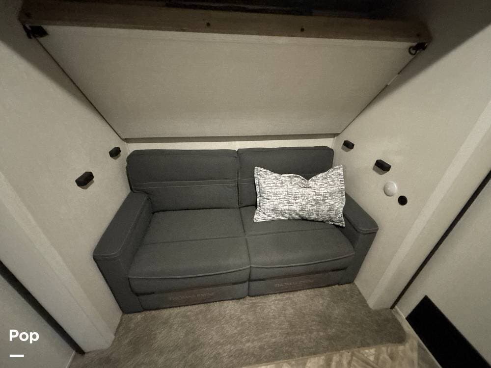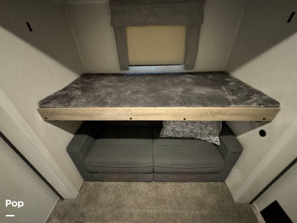 In the rear, the bunkhouse offers a perfect retreat for kids or guests, featuring multiple bunks, a sofa, and its own slide-out, which maximizes floor space.