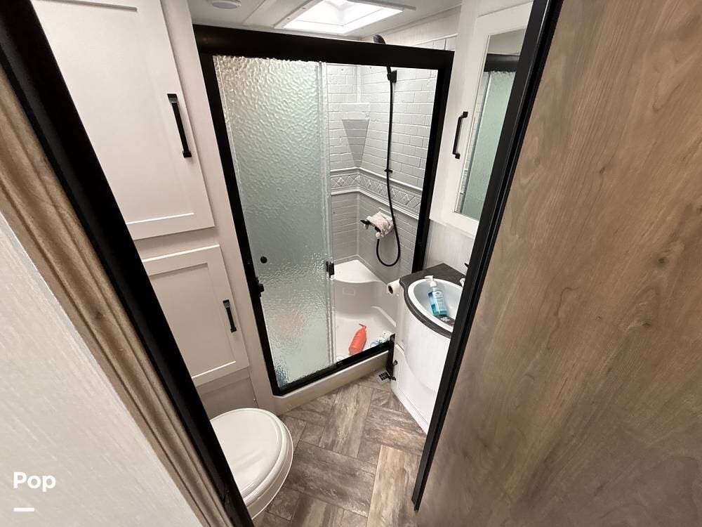 The bathroom is designed with convenience in mind, featuring a radius shower with glass doors, a foot-flush toilet, and a vanity with sink and storage. An exterior entry door from the bathroom adds easy access when spending time outdoors, keeping traffic out of the main living areas.