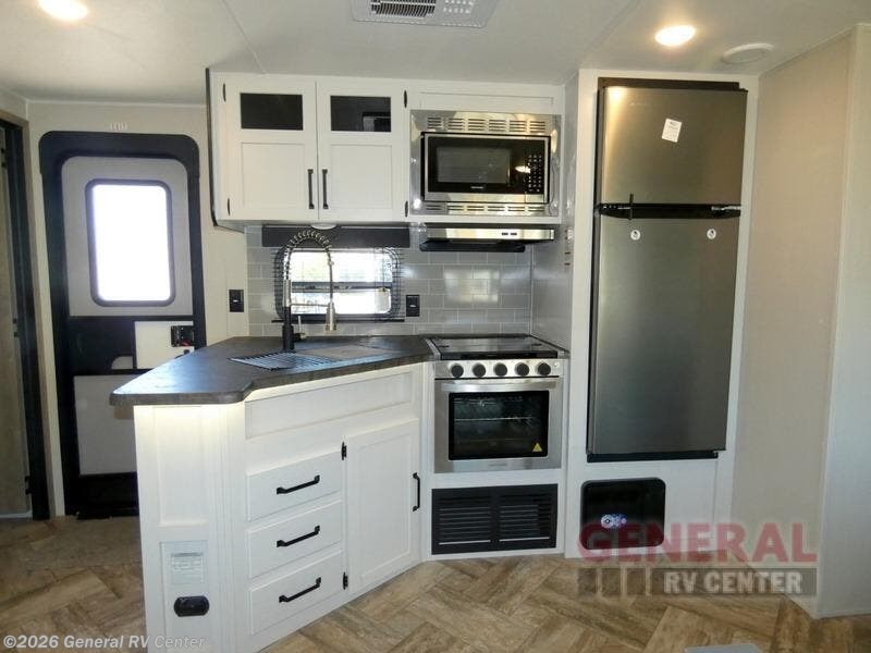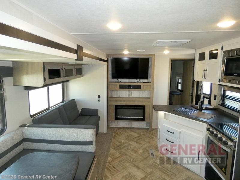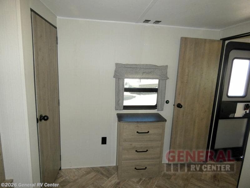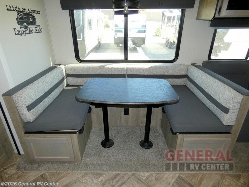 Enjoy your own privacy with two bedrooms in this travel trailer! The front private bedroom has a queen bed slide across from a dresser and a front closet with another closet next to it that is prepped to add a washer and dryer so you can extend your stay with clean clothes, and the rear private bedroom has a 60" x 74" queen bed slide, a dresser, and a closet. Everyone can stay clean in the full bathroom with the 34" x 34" radius shower and their bellies full with a three burner cooktop. Enjoy your meals at the U-shaped dinette then relax on the sofa while watching your favorite movies with the entertainment center.