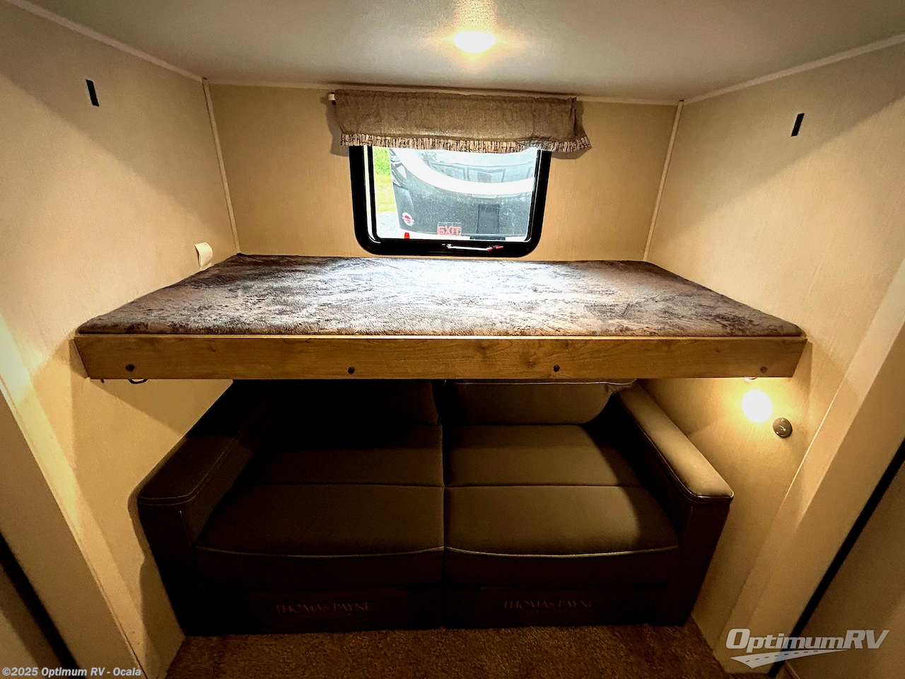 Everyone will want to join you when you head back out to the lake to stay in this trailer! With the middle bunkhouse that includes a bunk above a jiffy sofa and a closet, this can be your kids room or guests headquarters. You will have your own privacy when needed in the front bedroom which includes a queen bed slide and two closets. There is also a dresser and a space within a closet for a washer/dryer option. The full bathroom is conveniently located between the two rooms, and the rear of the destination trailer offers a combined living and kitchen area. The dual slides give you lots of floor space around the kitchen island to relax on the booth dinette or sofa, and the cook will have full kitchen amenities including a residential style refrigerator.