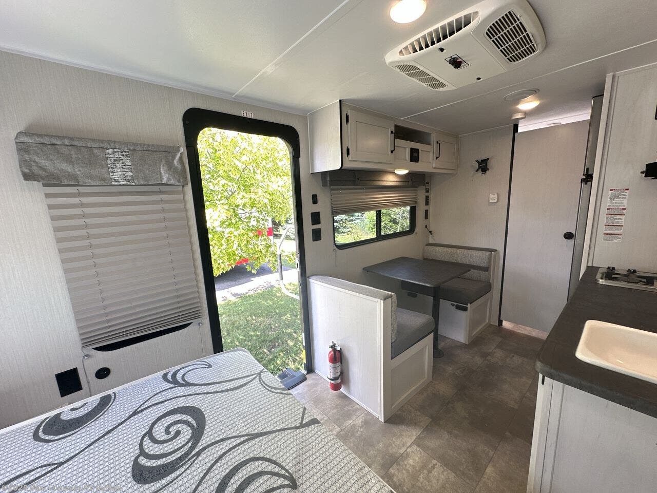 You are going to love this trailer with its rear full bathroom and front walk-around RV queen bed. This is the perfect couple's trailer or smaller family get-away! You will find storage on each side of the bed for your clothing as well as a place to put your cellphone and keys, and overhead storage for blankets and such. The booth dinette for two also offers overhead storage for your dry goods, plates and games. The kitchen provides a stainless steel microwave, two-burner cooktop and a residential refrigerator. And the reason you might have purchased this trailer, the rear full bathroom that offers everything you need and a spacious room to change in.