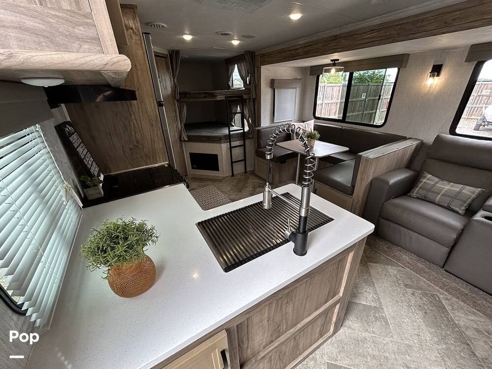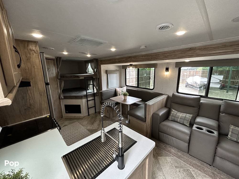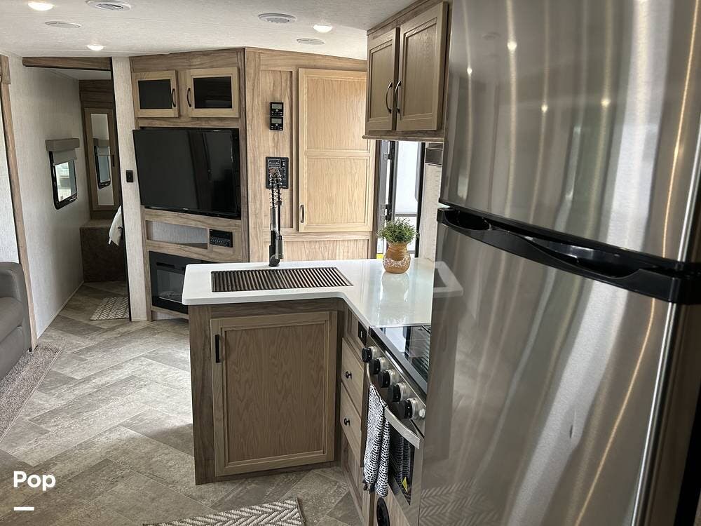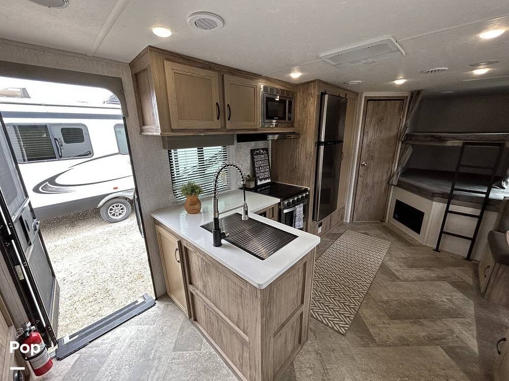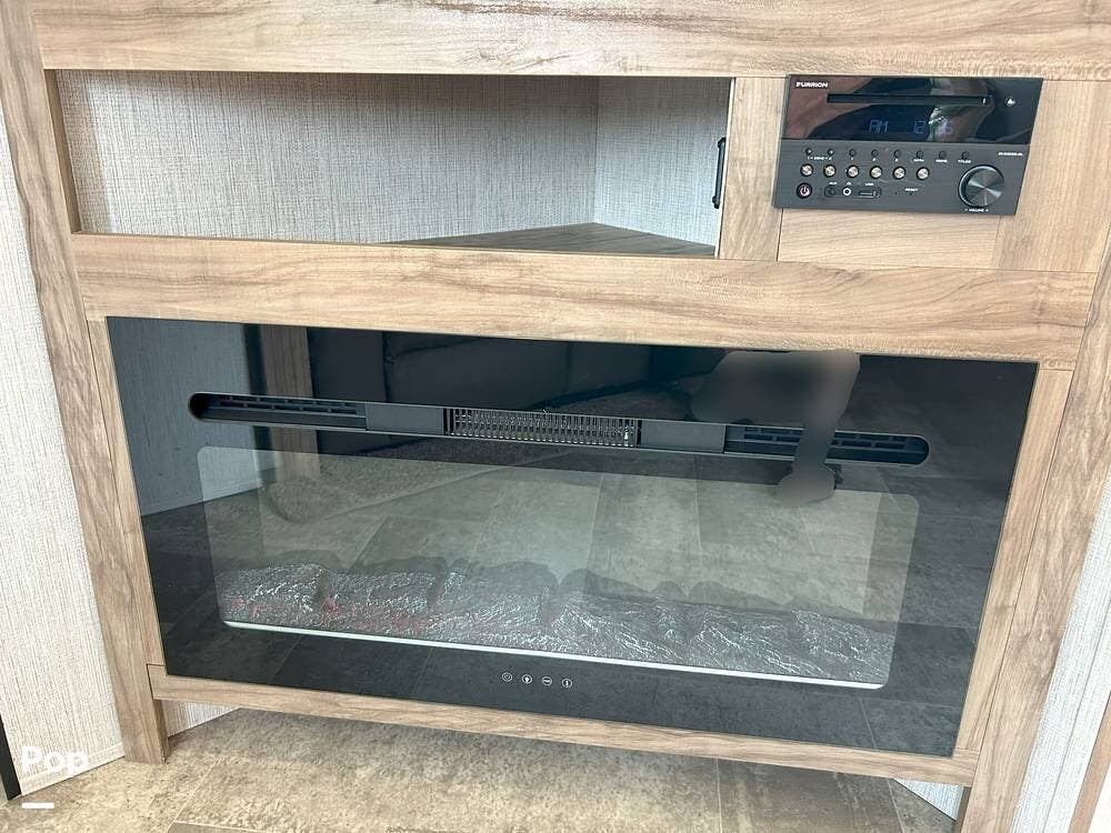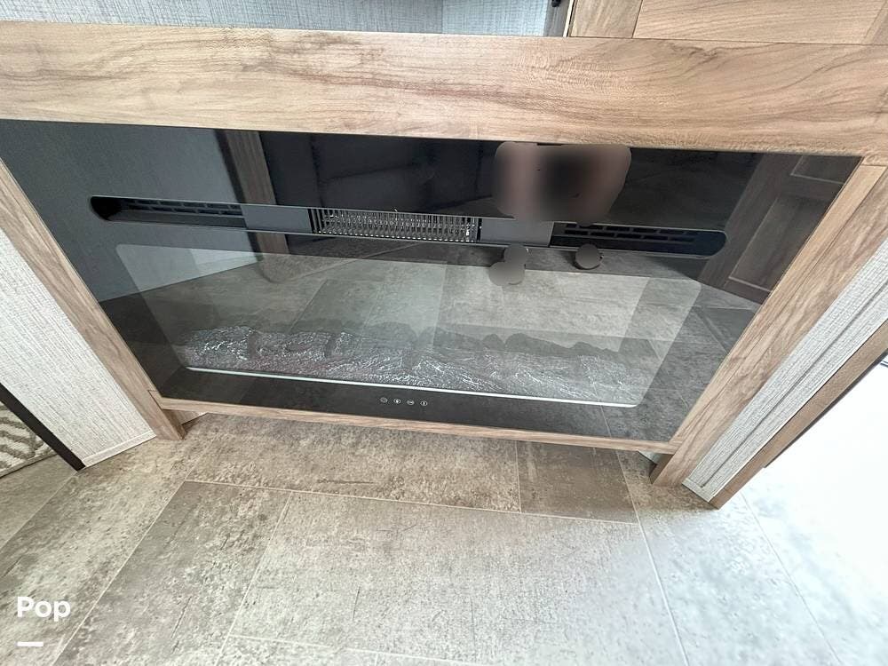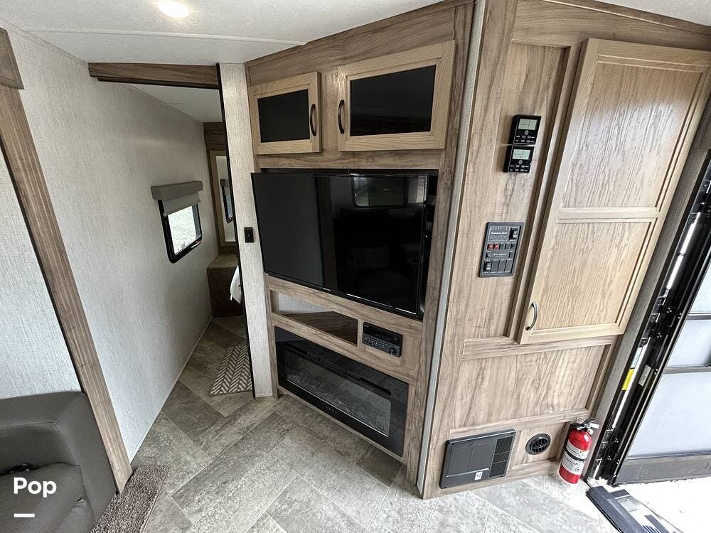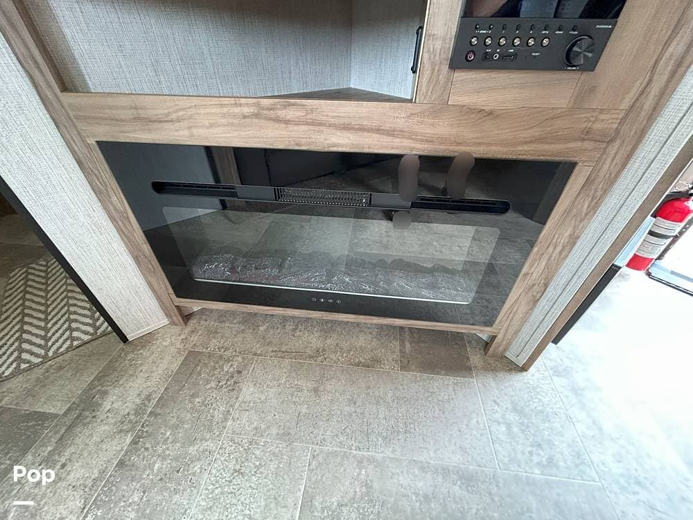 The main living area is both functional and welcoming, featuring a spacious dinette alongside a well-equipped galley kitchen--ideal for family meals, game nights, or relaxing indoors. Entertainment is easy with a large TV, stereo system, and a cozy fireplace that adds both warmth and ambiance.