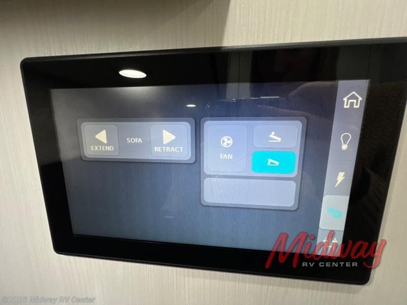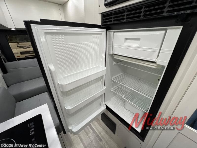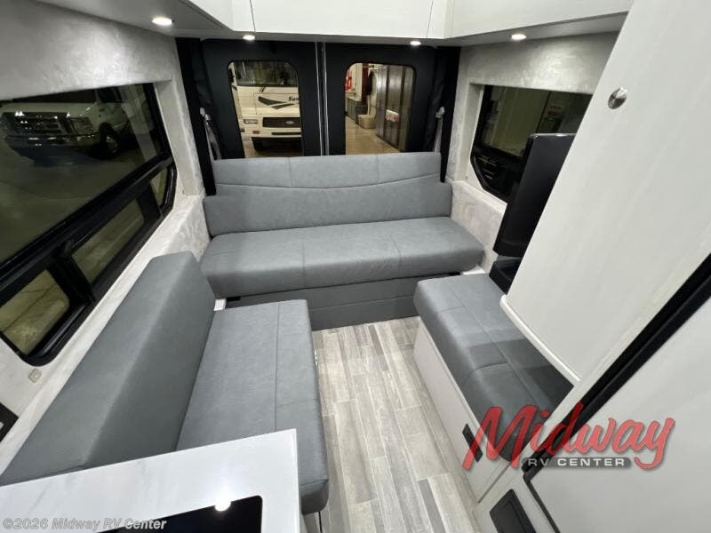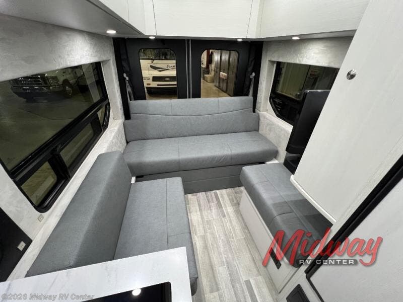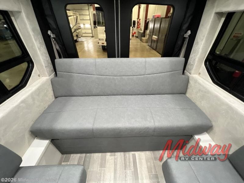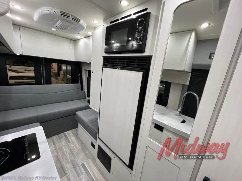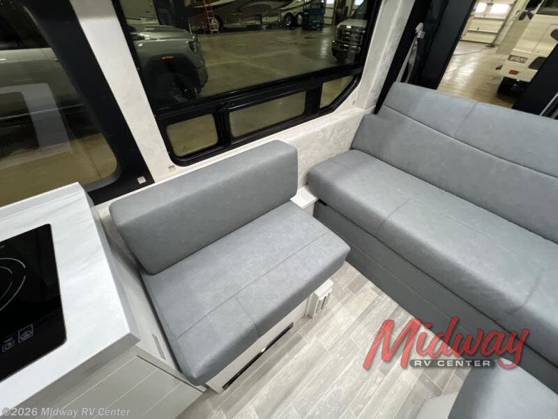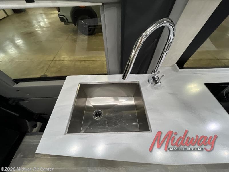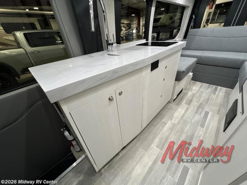 This 2.2 Ontour model is similar to model 2.0, but with a larger refrigerator, and more storage space in the bath. The rear power sofa converts to a 68" x 76" queen-sized bed with memory foam cushions for all-around comfort and the wet bath allows you to clean up each day. There is also a vanity with storage, a sink, and a Corian countertop in the bath for added convenience. Prepare meals either on the one burner induction stove top or in the convection microwave oven and clean up will be a breeze with a stainless steel sink that includes a high-arc faucet.