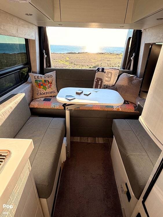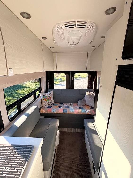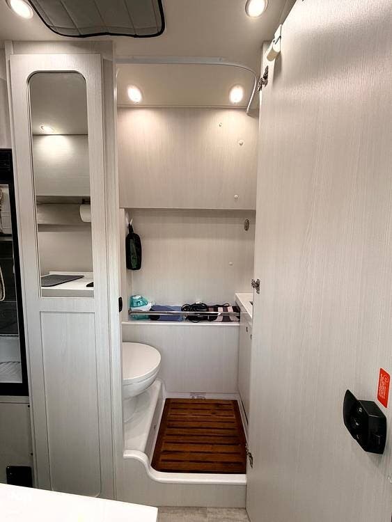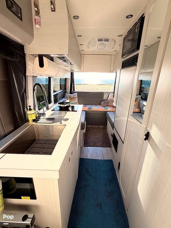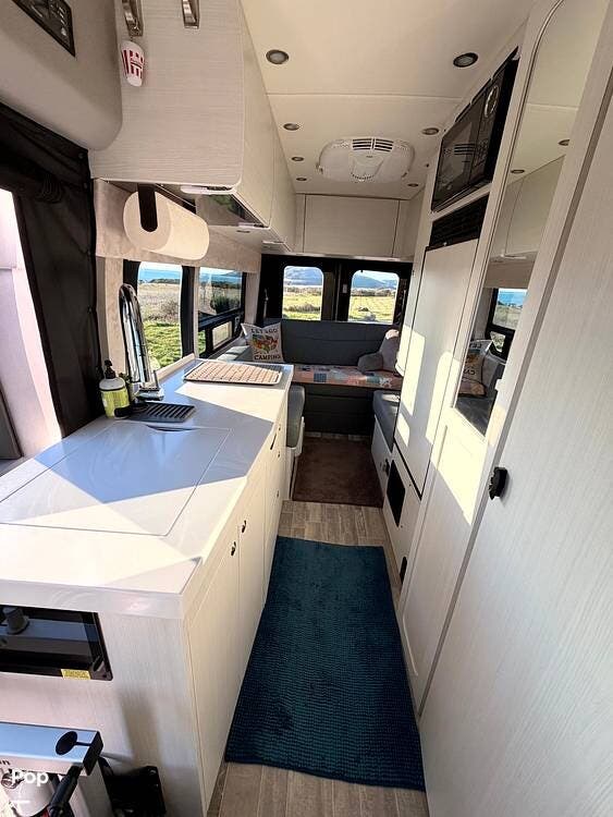 The well-planned galley includes a 12V compressor refrigerator, an induction cooktop, a microwave, and solid-surface countertops, so you can prepare real meals on the road rather than settle for basic camping fare.