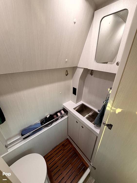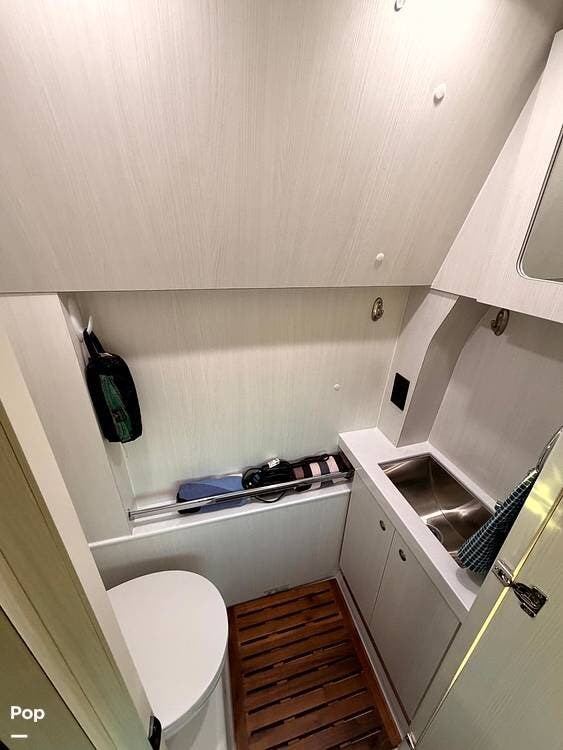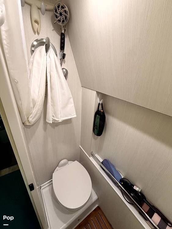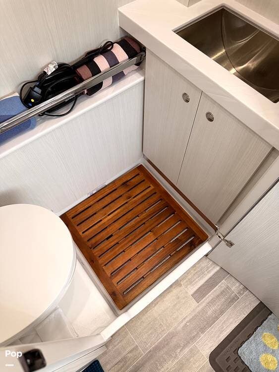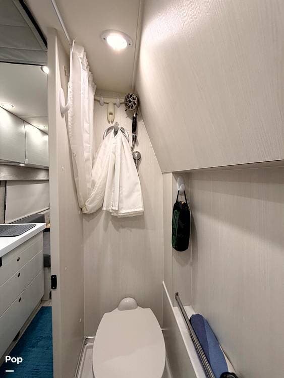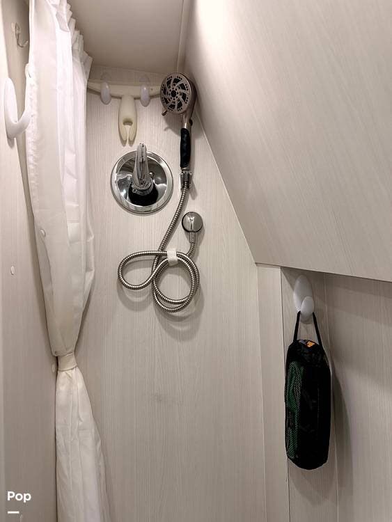 A fully enclosed wet bath with toilet, sink, and shower makes this coach completely self-contained, perfect for boondocking or overnight stops without hookups.