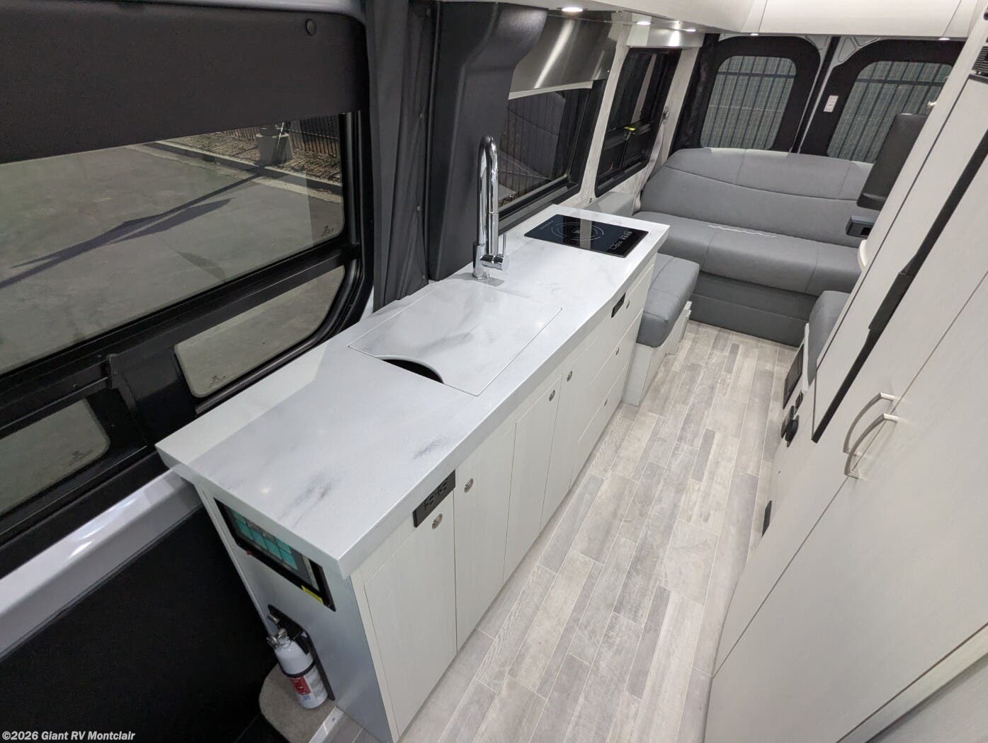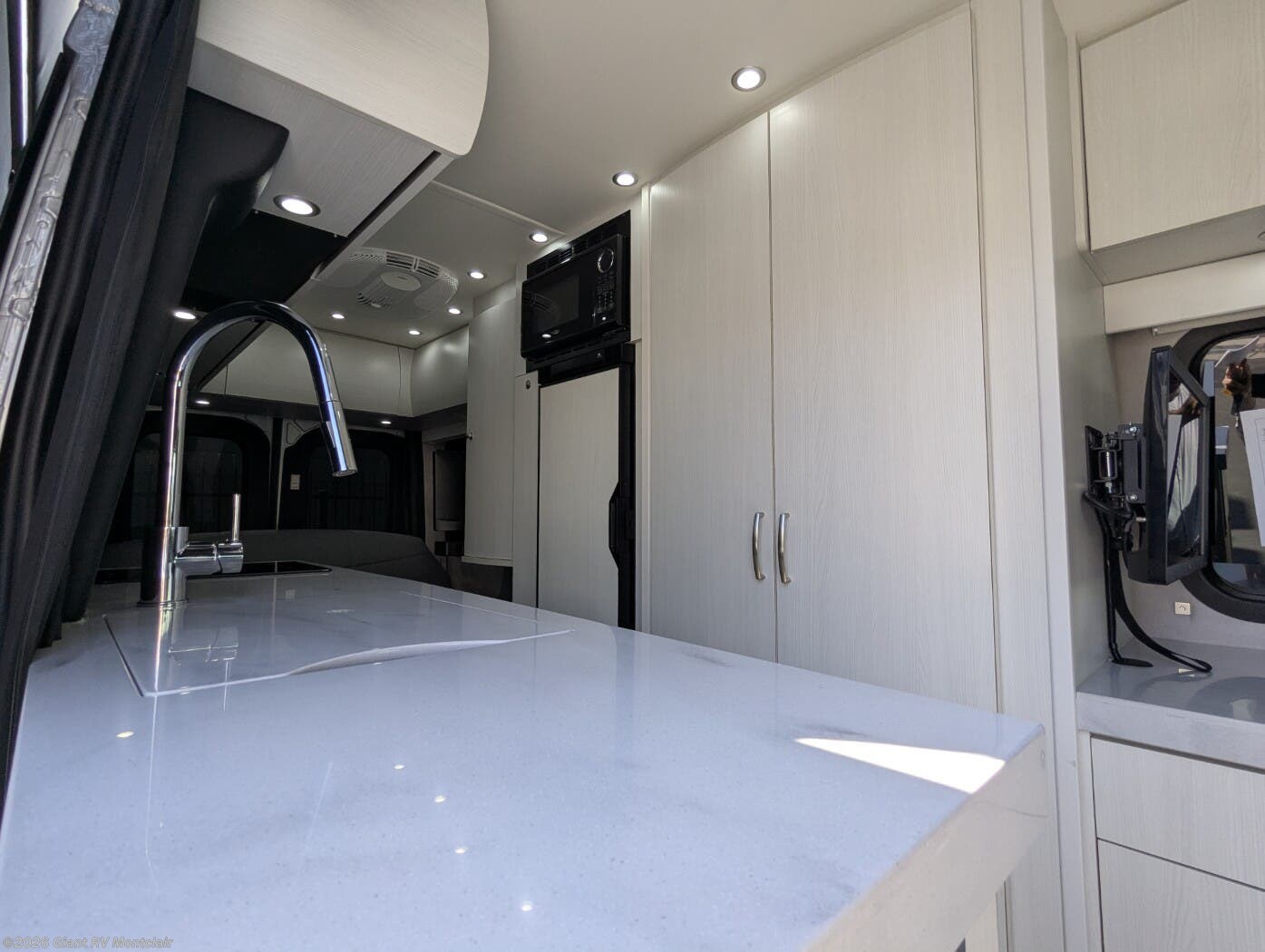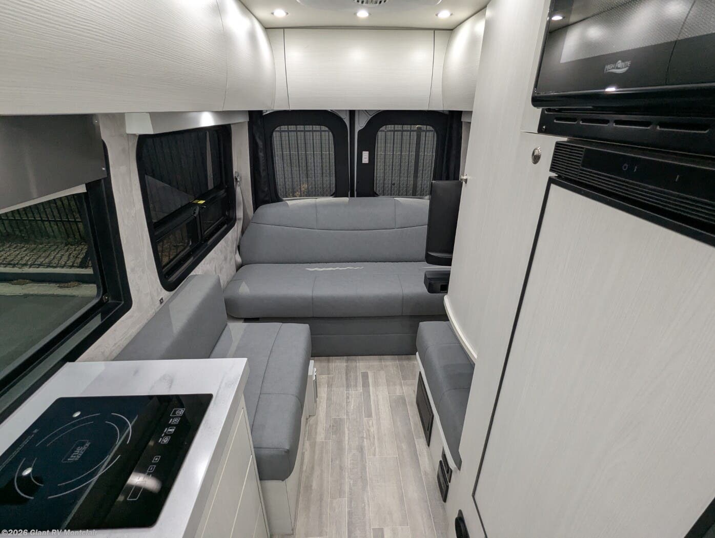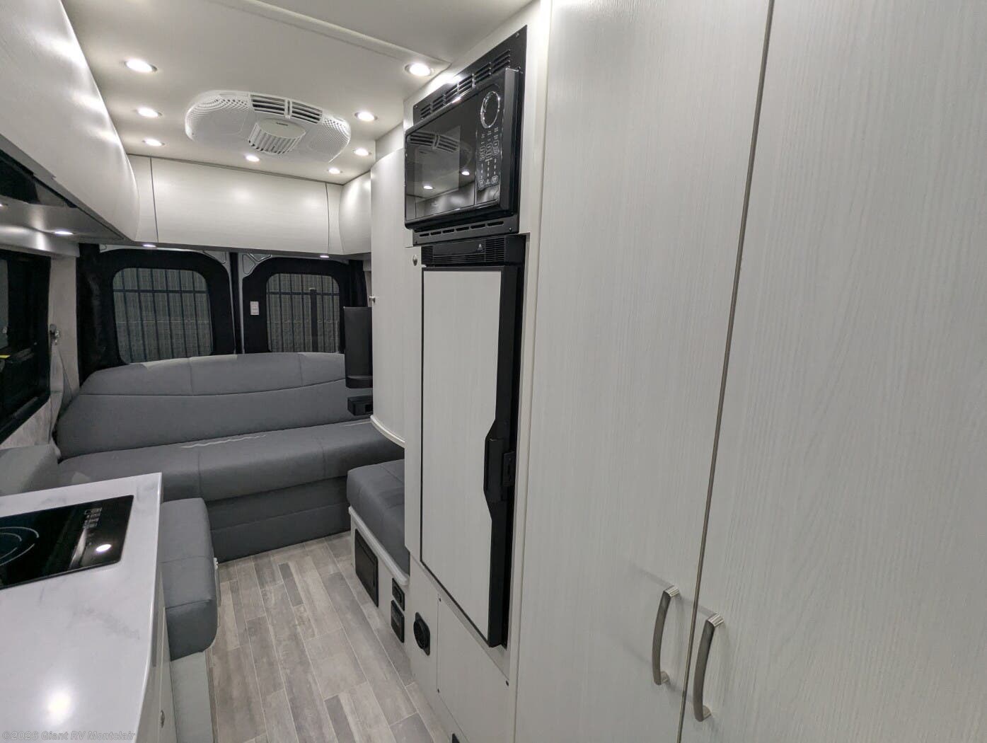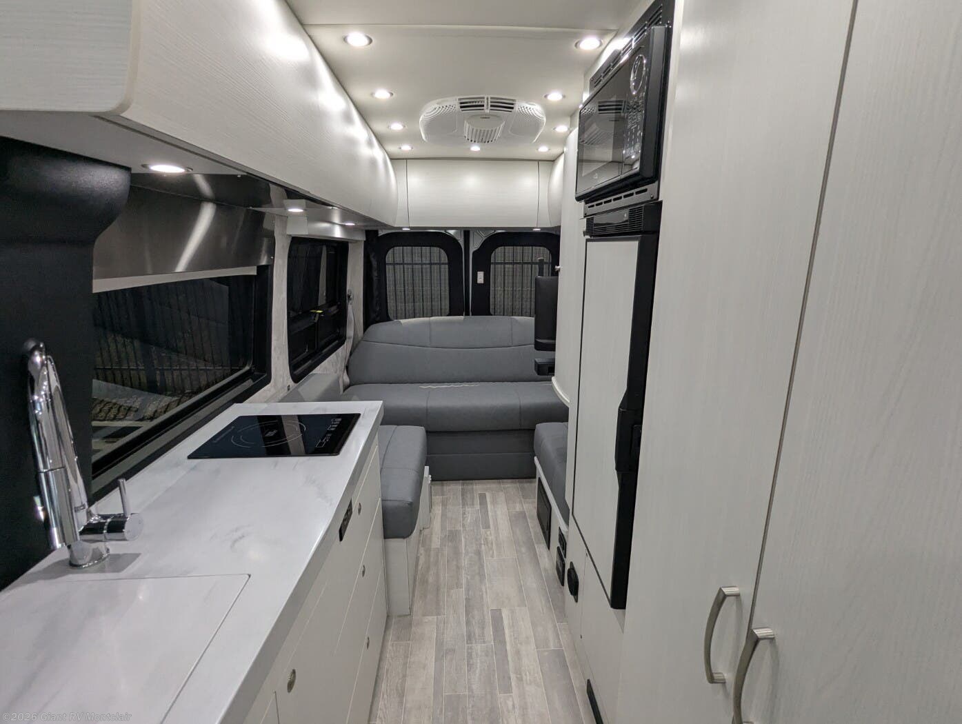 - Modern Kitchen: Galley with a 12V refrigerator, 2-burner cooktop, microwave, and Corian countertops for meal prep.