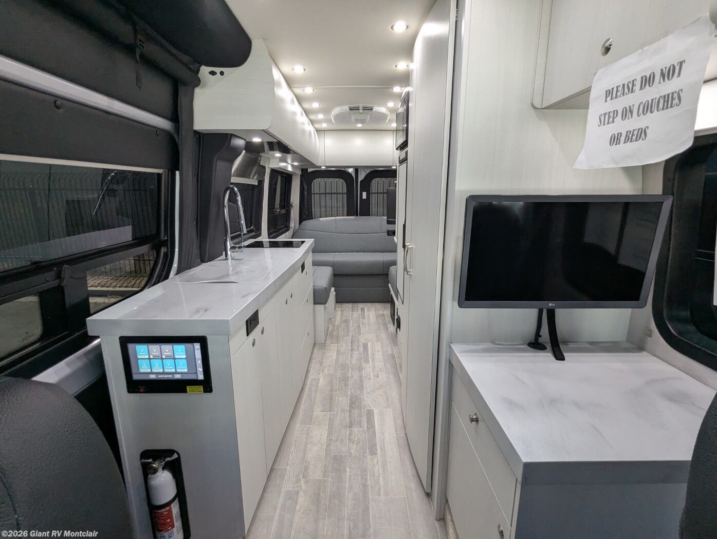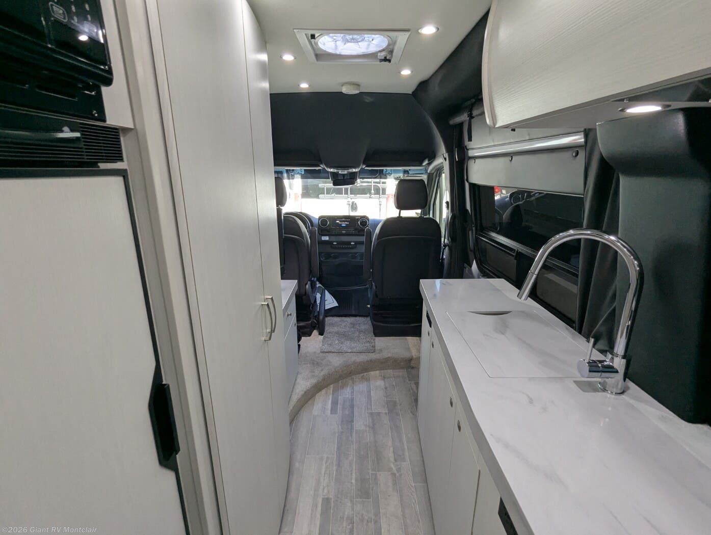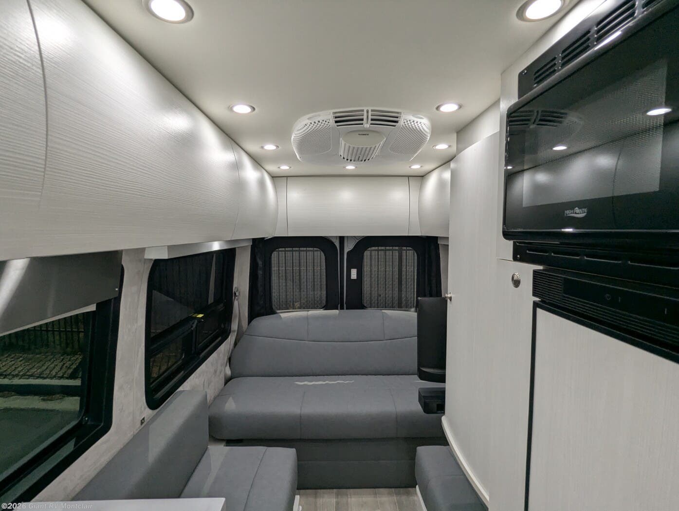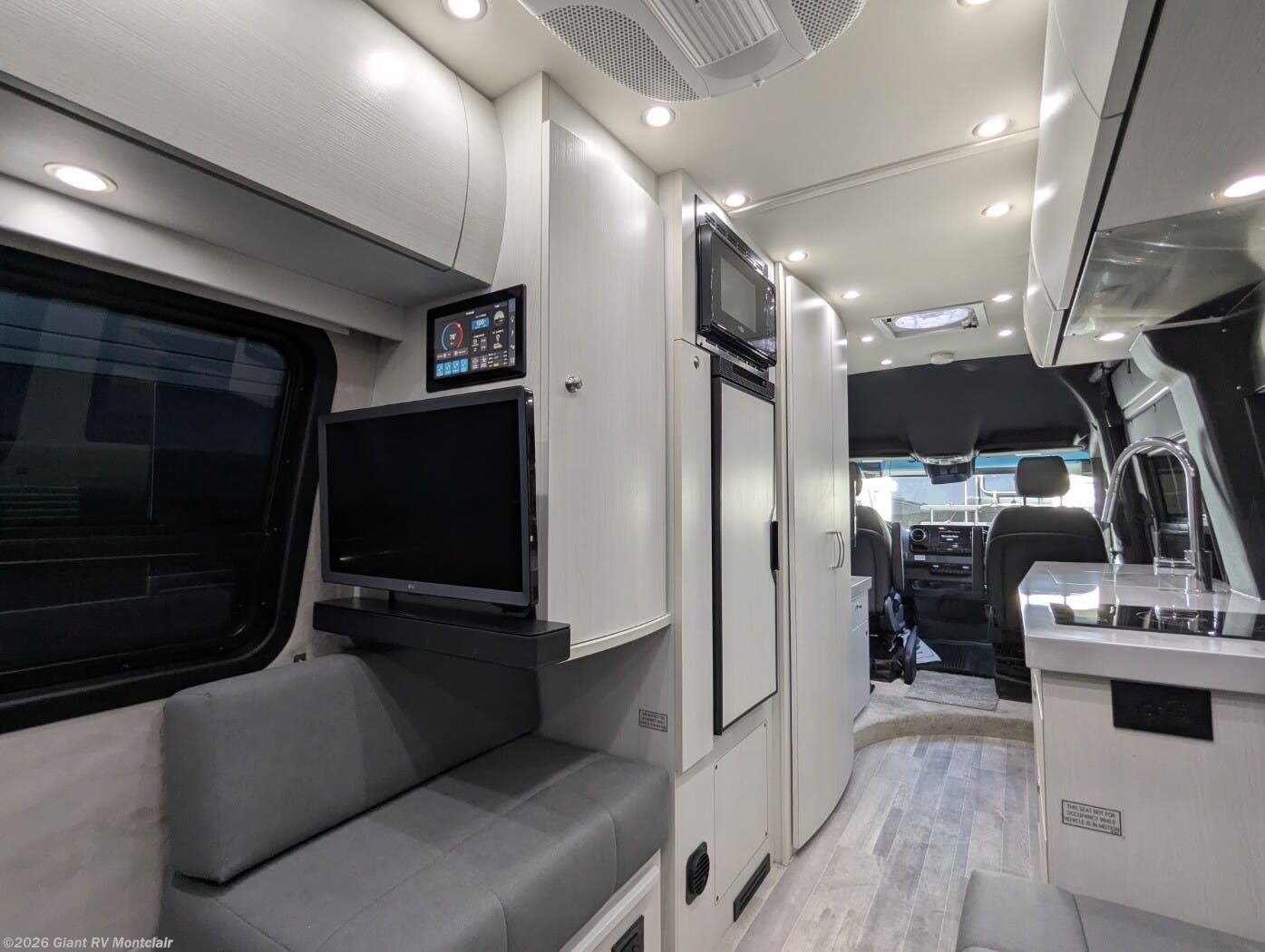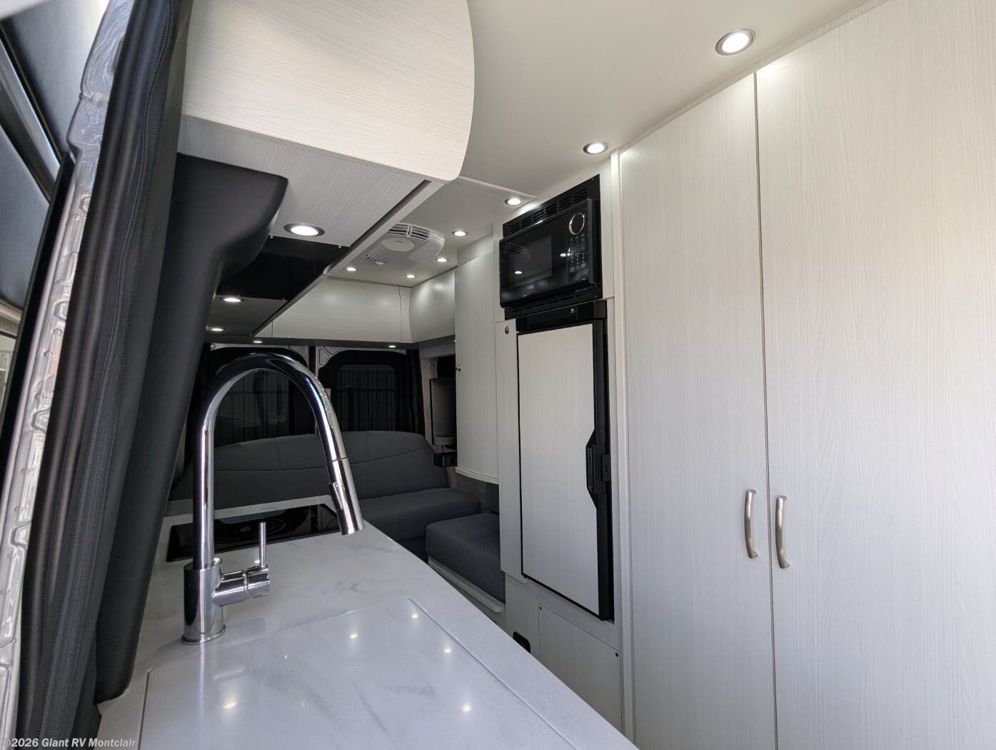 - Modern Kitchen: Galley with a 12V refrigerator, 2-burner cooktop, microwave, and Corian countertops for meal prep.