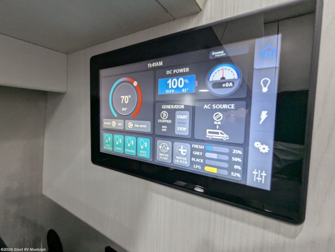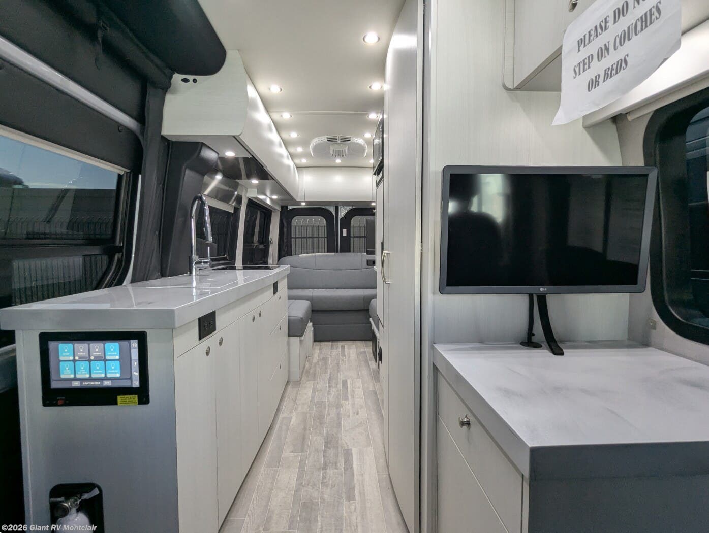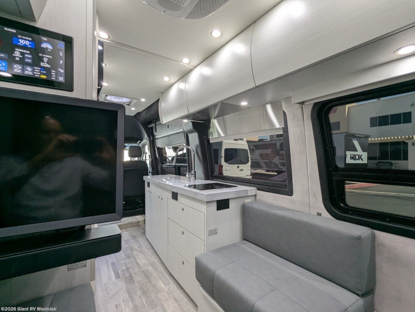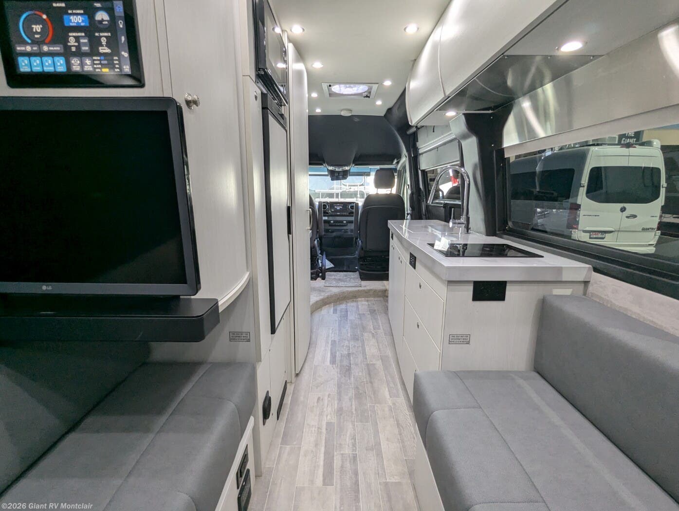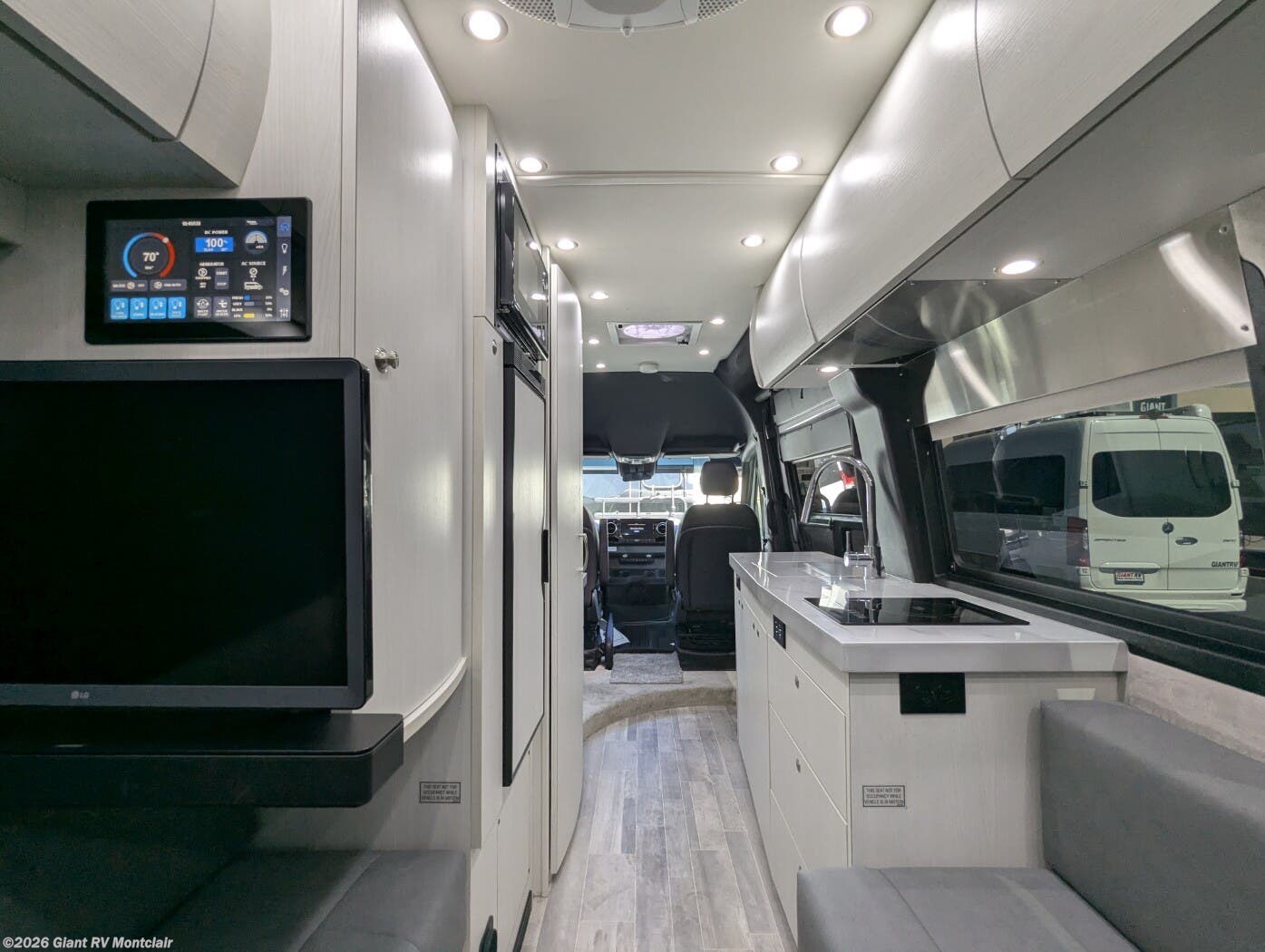- Swivel Seating Lounge: Front captain’s chairs swivel to create a flexible lounge with a touchscreen control panel for versatile use.