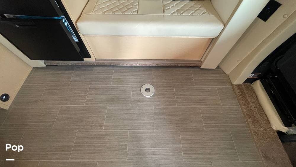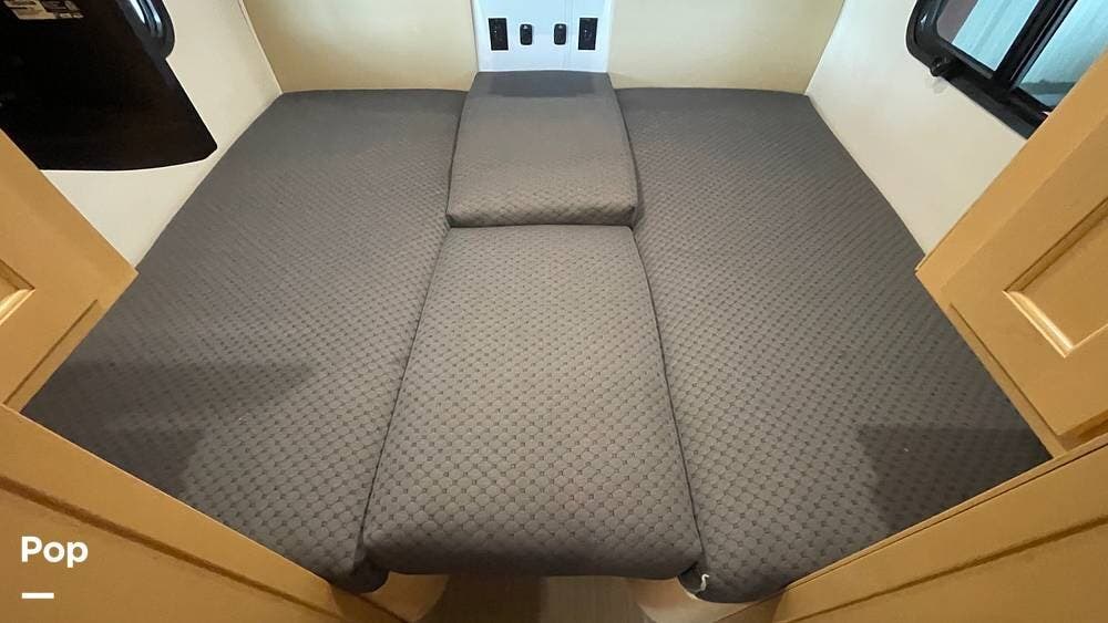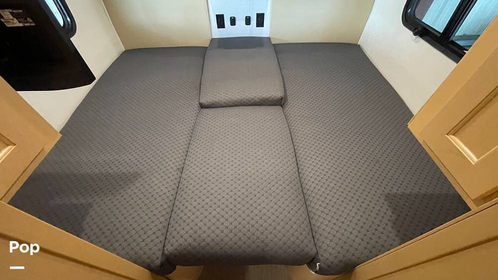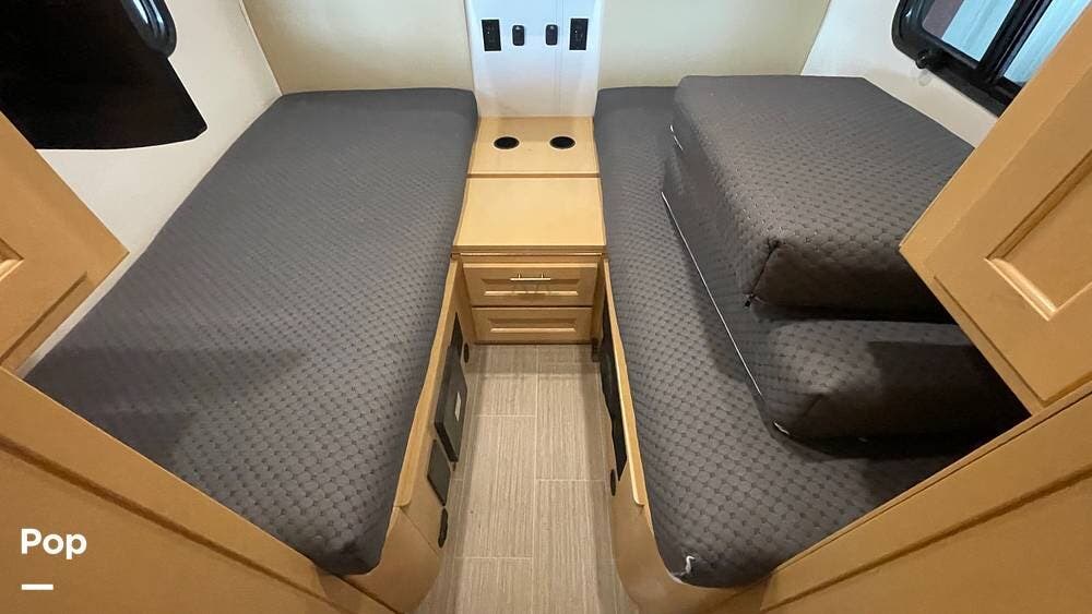 The spacious rear twin bed slide-out creates a private bedroom with two comfortable twin beds separated by a convenient nightstand, easily converting to a king-size sleeping area using the included extra cushion filler. Up front, the power sofa comfortably seats four in soft leather-touch upholstery with elegant double diamond stitching, reclining for ultimate relaxation, while adjustable tables provide the perfect surface for dining, games, or work.