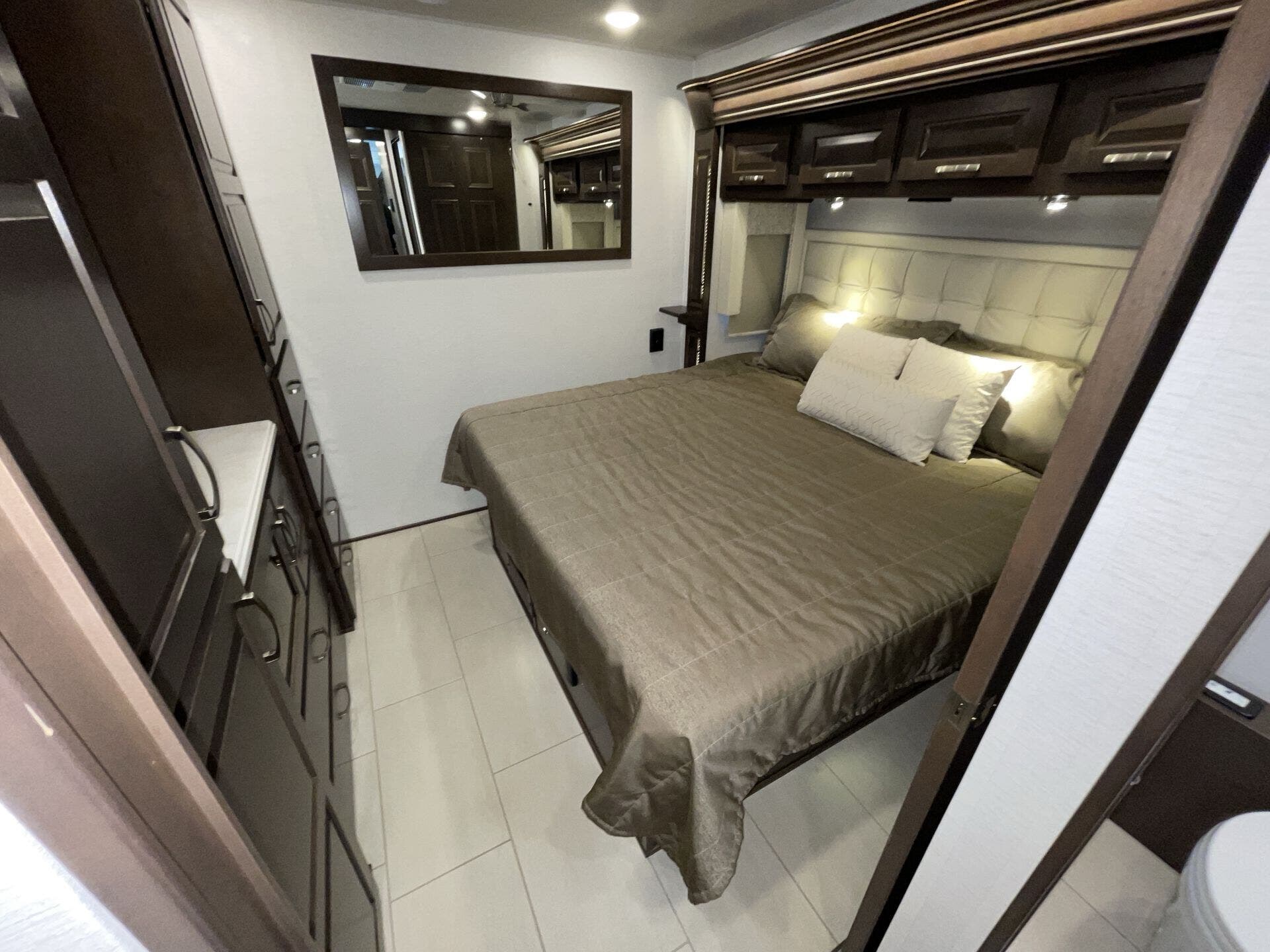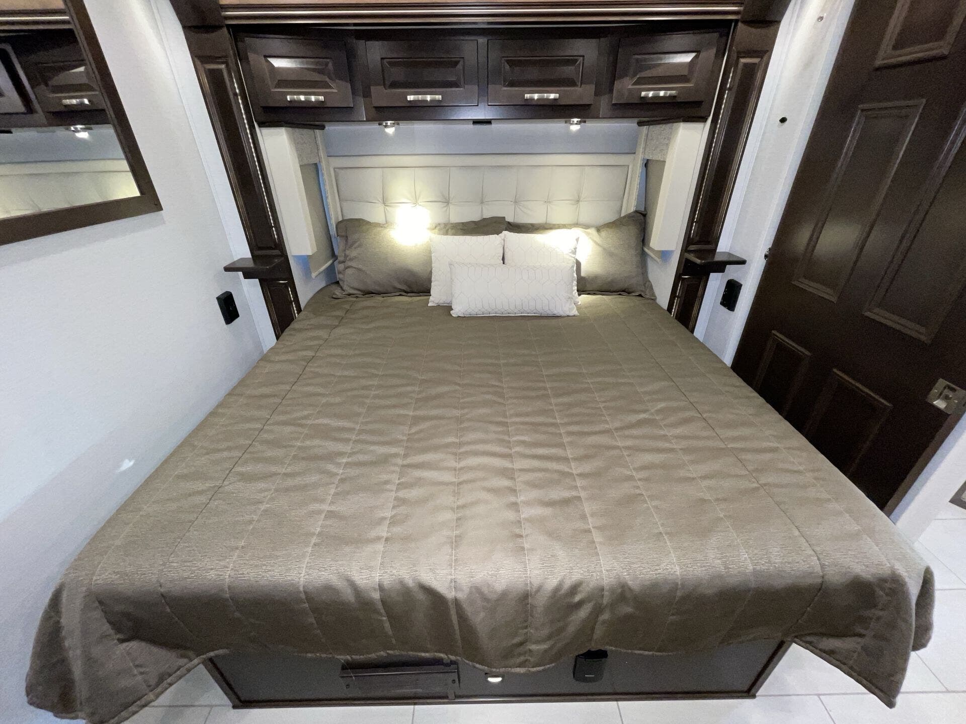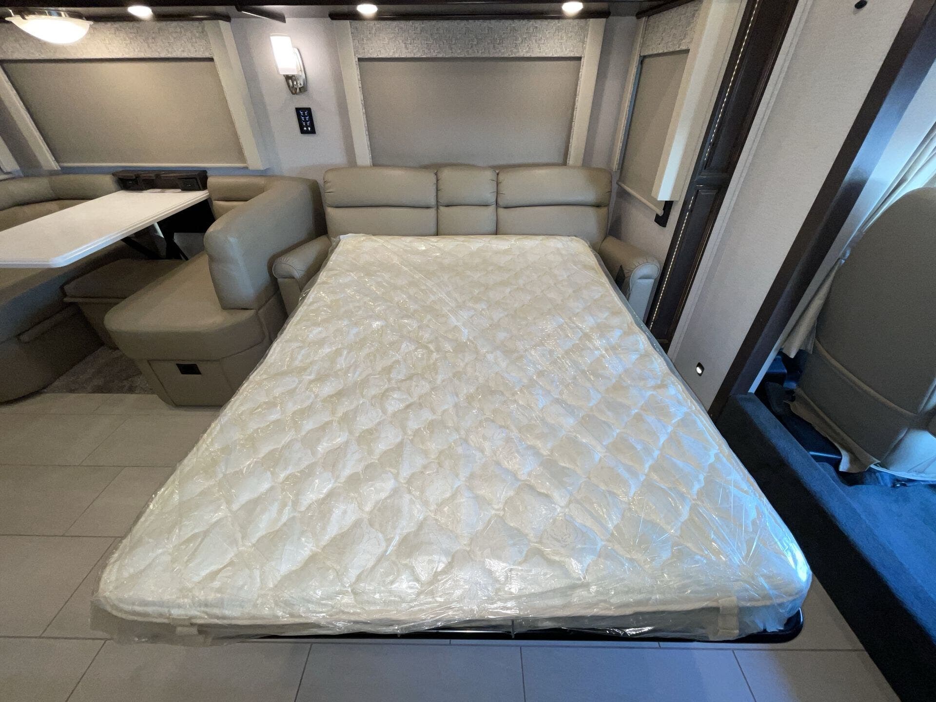 You’ve got a private master suite that feels like a bedroom, complete with good storage and a real mattress you’ll actually sleep well on. At the front, the kitchen is laid out smartly with plenty of counter space and room to cook meals without feeling squeezed. Across from that, the living room area has a sofa bed, so you can actually sit, relax, and hang out or take a nap.