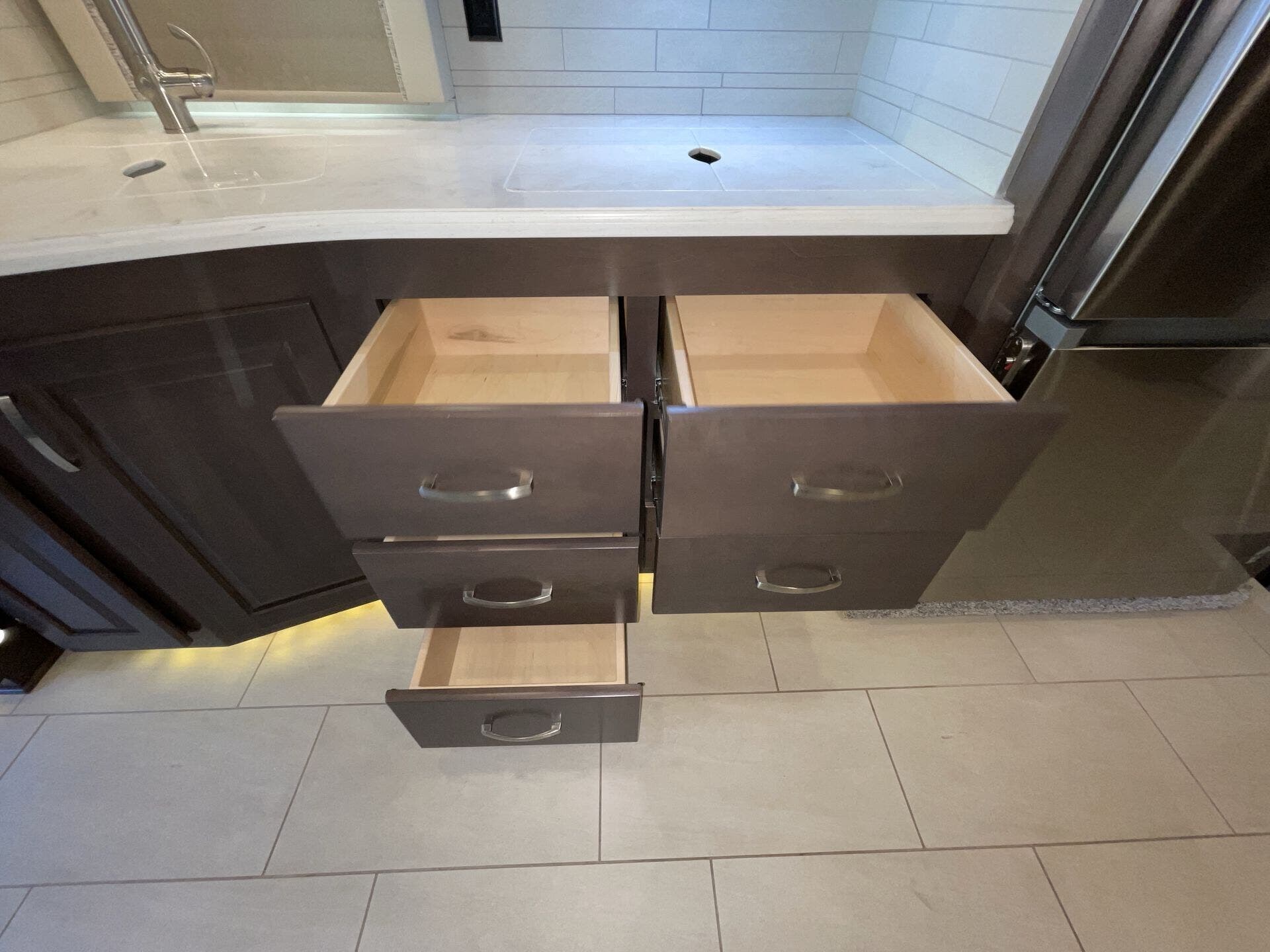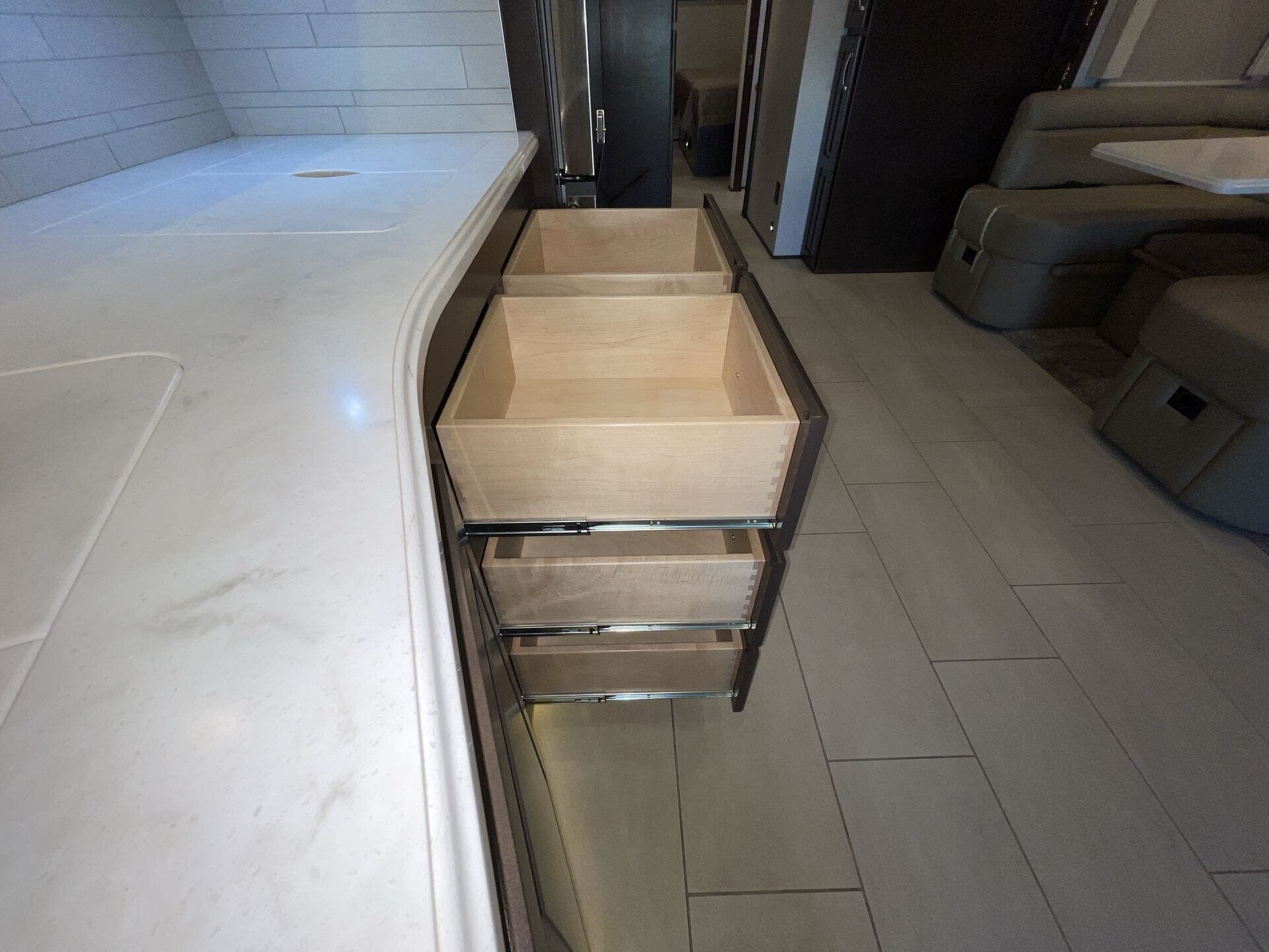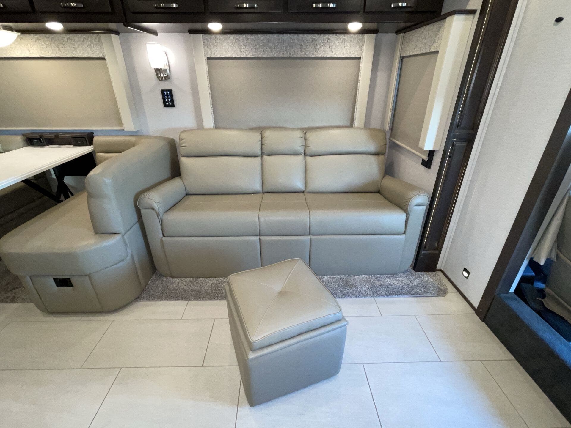 You’ve got a private master suite that feels like a bedroom, complete with good storage and a real mattress you’ll actually sleep well on. At the front, the kitchen is laid out smartly with plenty of counter space and room to cook meals without feeling squeezed. Across from that, the living room area has a sofa bed, so you can actually sit, relax, and hang out or take a nap.