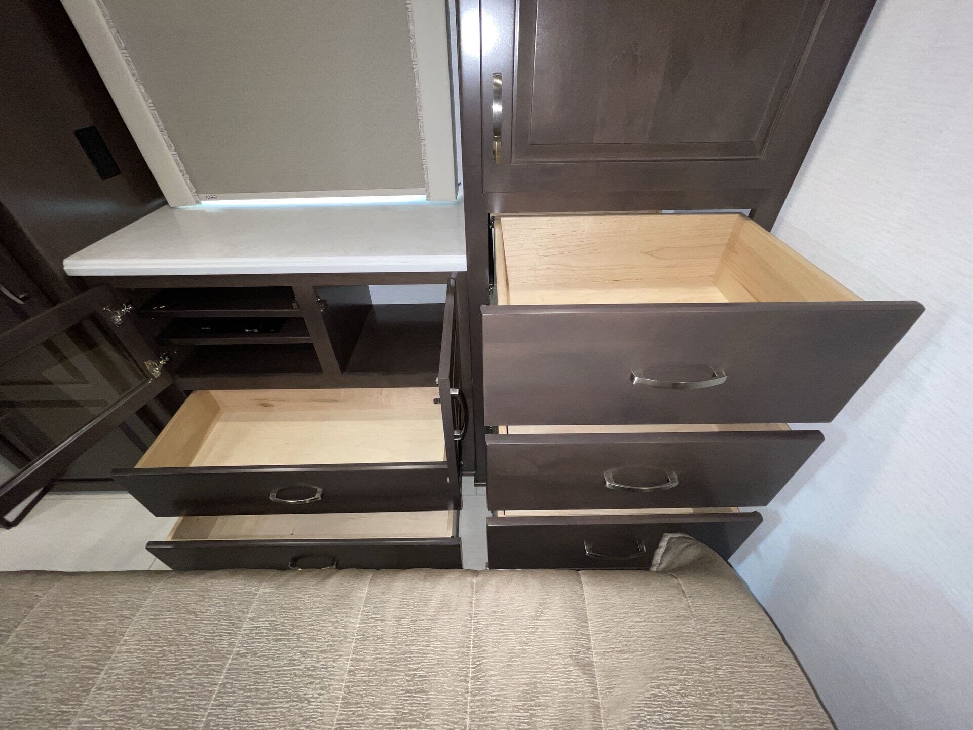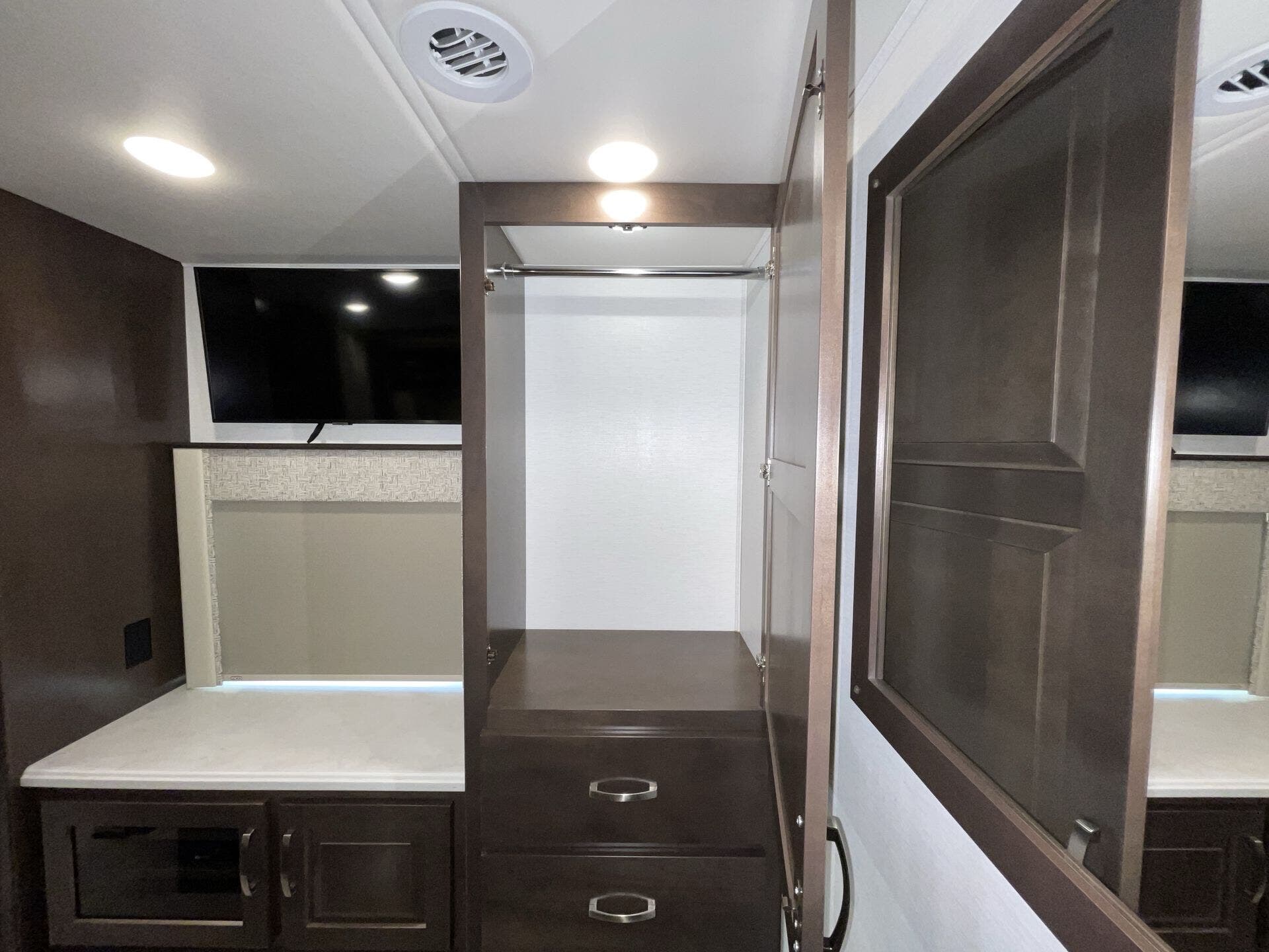 Ceiling Fan, Day/Night Shades, Dinette, Dinette Bed, Hide-A-Bed, Kitchen Sink, Leather Furniture, Medicine Cabinet, Overhead Cabinetry, Pantry, Roof Vents, Shower, Sofa Bed, Toilet, Wardrobe(s), Washer/Dryer Prep