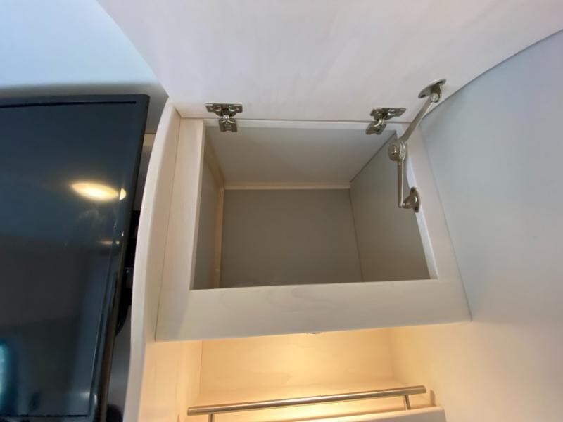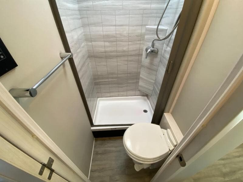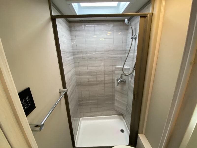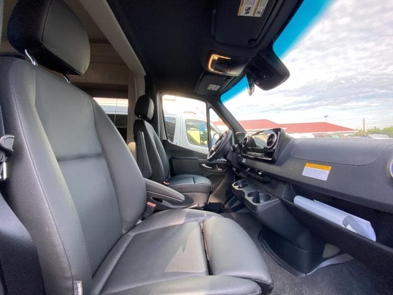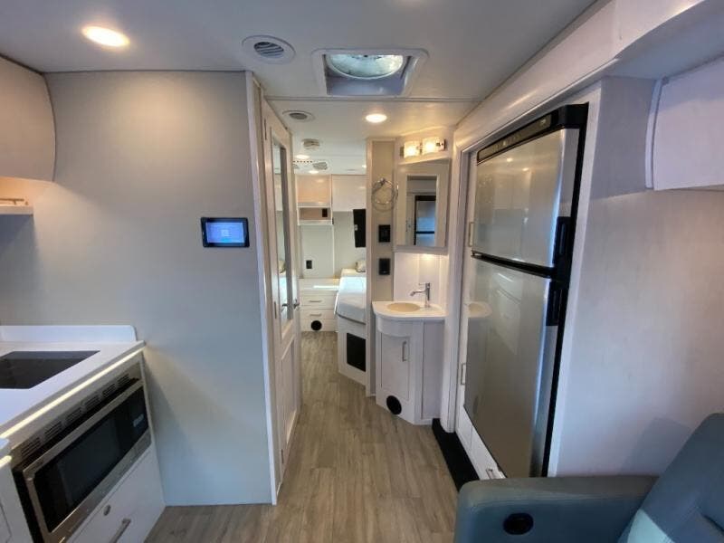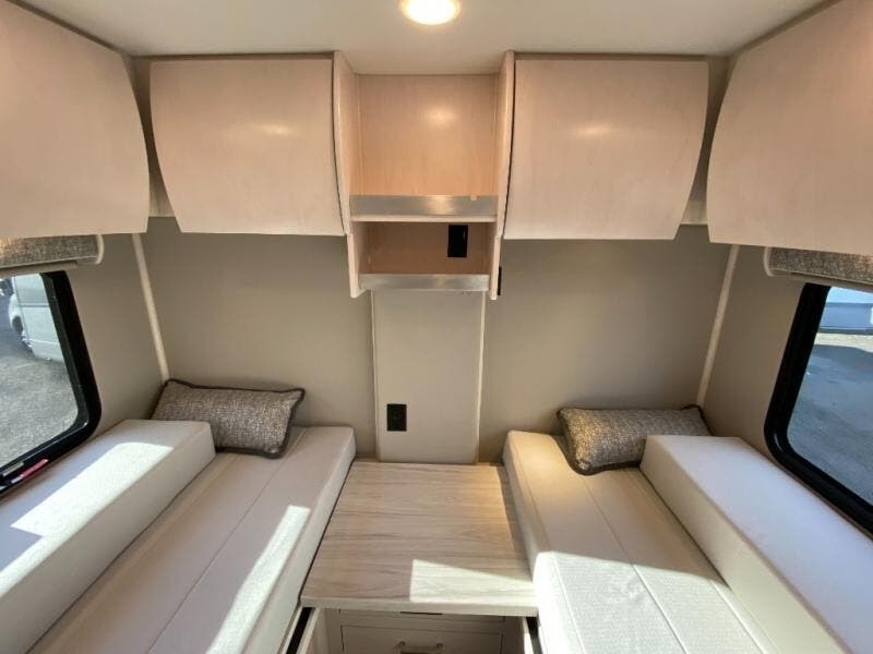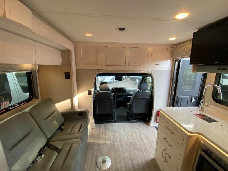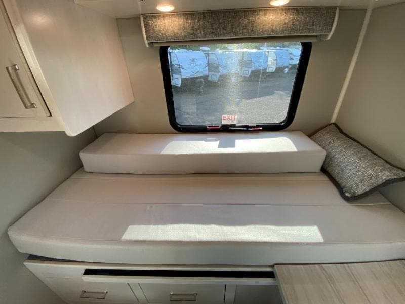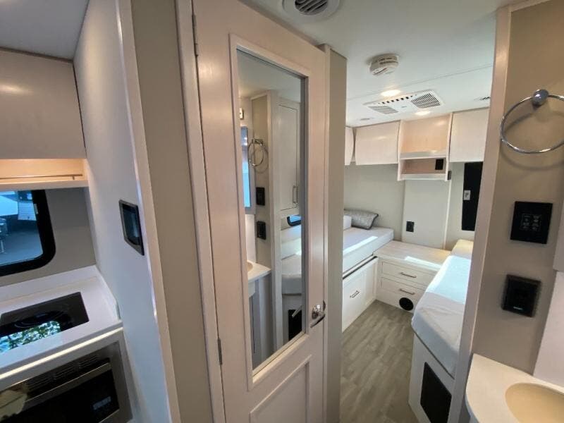 Adventure near and far in this easy to drive coach for two! You will appreciate the storage throughout for your belongings, so no worries about leaving anything behind. The single slide out along the driver's side adds more walking around space inside, and the table in front of the sofa can easily be removed giving you even more floor space if you wish. Prepare light meals and snacks with ease while you travel with a two-burner cooktop and round sink for cleaning up. There is cupboard storage in the overhead areas for your dishes, and the refrigerator/pantry is located opposite within the sofa slide. The onboard bathroom features a private toilet and 24" x 36" shower area with a separate sink just opposite the door. In the rear of the coach, there are two twin 75" x 32" mattresses, a 24" TV and overhead storage along each side and rear of the coach, plus more storage can be found at the foot of each bed.