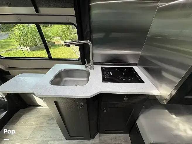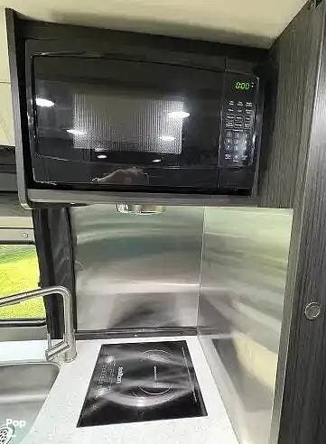The well-appointed kitchen features a wide one-burner induction stove, microwave, and a 5.3 cu. ft. compressor fridge, so you can whip up meals anywhere.