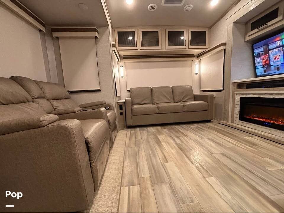 This RV features opposing slides in the living area/kitchen, which really opens up the floor plan. Standard features include an entertainment center with a fireplace, theatre seating, a sleeper sofa for guests, an island kitchen with a double stainless steel sink, microwave, residential refrigerator/freezer, and a conventional oven.