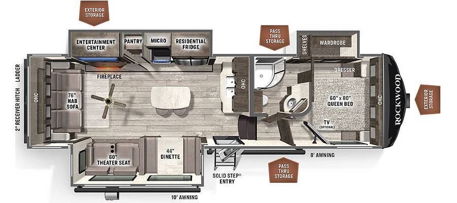 Outside, you'll find leveling jacks, pass-through storage, heated holding tanks, two power awnings, and exterior stereo speakers.