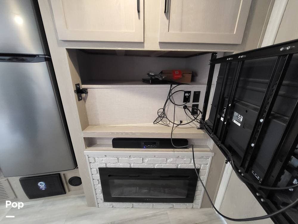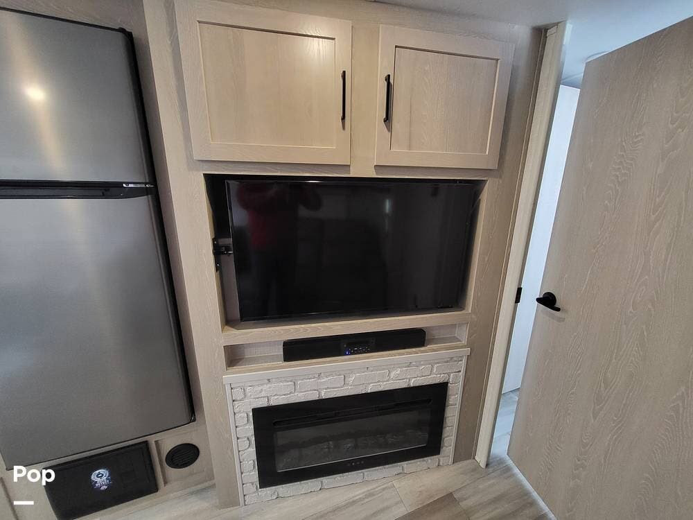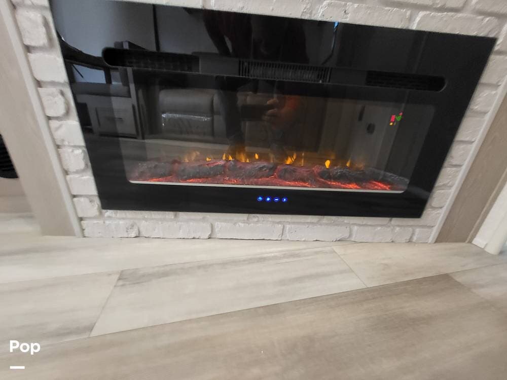 When you step inside, you'll find the living areas with a sleeper sofa across from an entertainment center with an electric fireplace and the kitchen with a dinette booth that can convert to a bed, double kitchen sink, fridge/freezer, microwave, 3-burner stove with oven, and pantry.