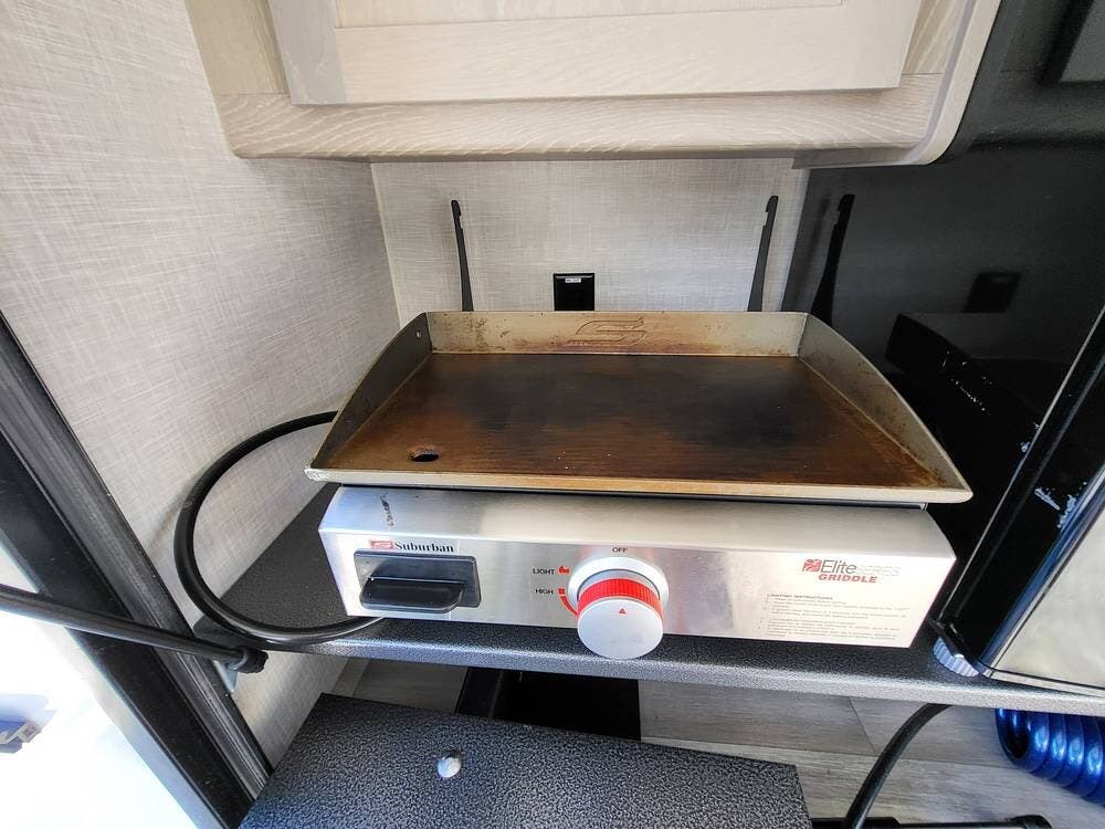 When you are outside, it has an outdoor kitchen with a mini fridge, flat-top grill, and gas burner stove.