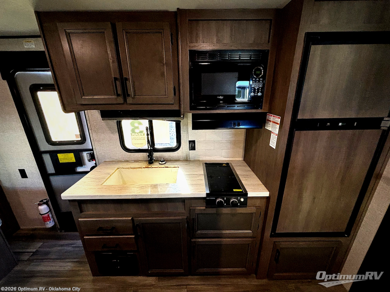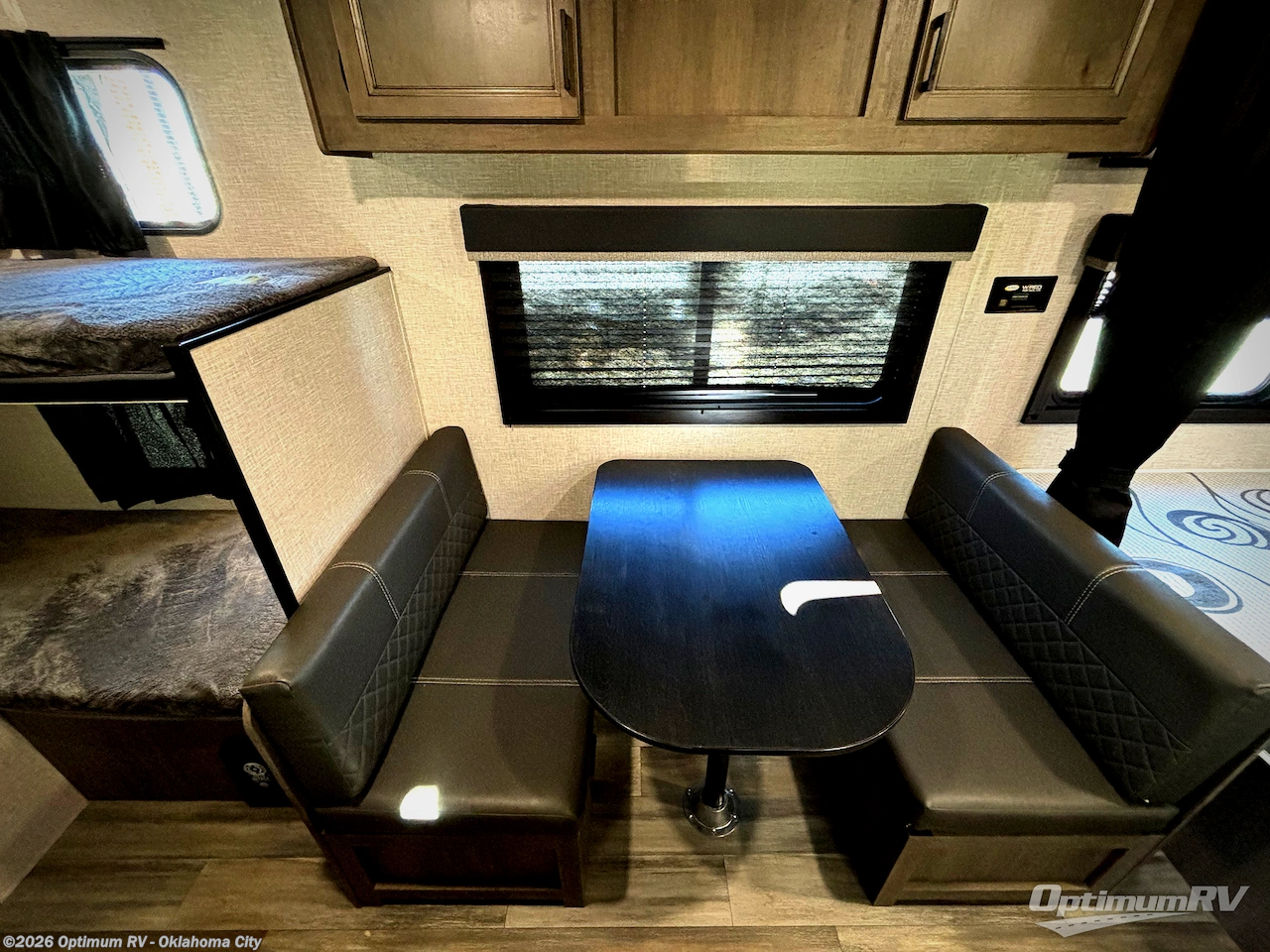 If you're in the market for a lightweight single axle travel trailer with bunk beds, you're in luck with this unit! You will have the front bed all to yourselves, and there is a wardrobe here to store your clothes. The chef can whip up lunch on the two burner cooktop, and you can dine at the booth dinette. If the weather is nice, you may just want to sit outdoors under the 13' power awning with LED lights. The rear corner bath includes a foot flush toilet and a tub/shower, and you'll find plenty of storage space throughout this model, including outside storage for charcoal, tackle boxes, and tools!