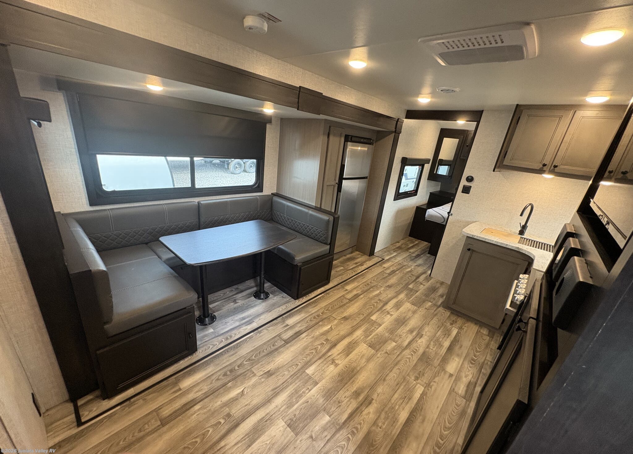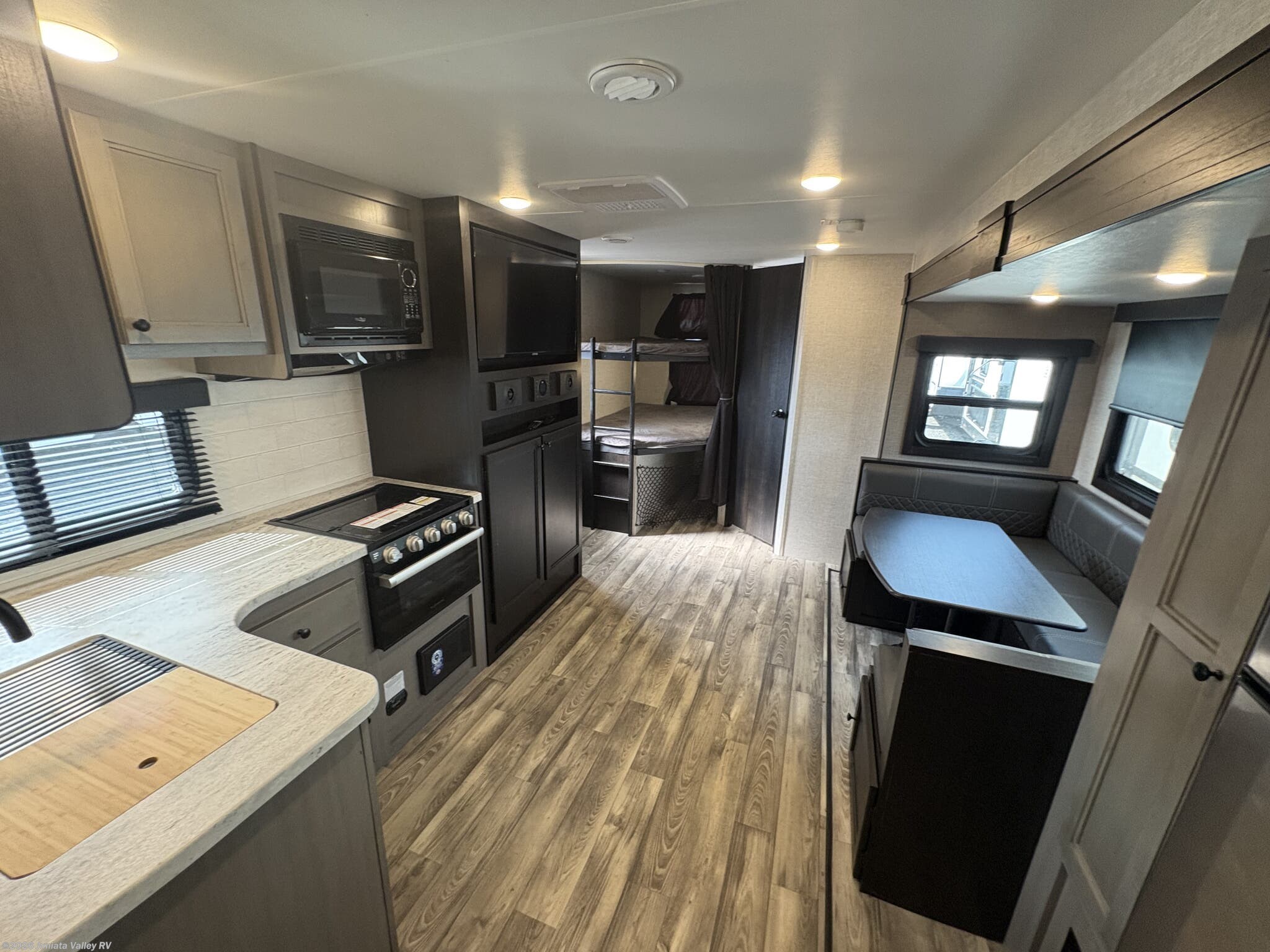 This model offers a thoughtful layout with a Front Bedroom, Bunk Beds, and a U-Shaped Dinette that can convert to a bed for additional sleeping space. Inside, you’ll find solid surface countertops, a kitchen sink, pantry, medicine cabinet, and extensive overhead cabinetry, delivering a tidy, home-like feel. The interior is designed to feel spacious, leveraging one slide to expand the living area while keeping essential features within easy reach.