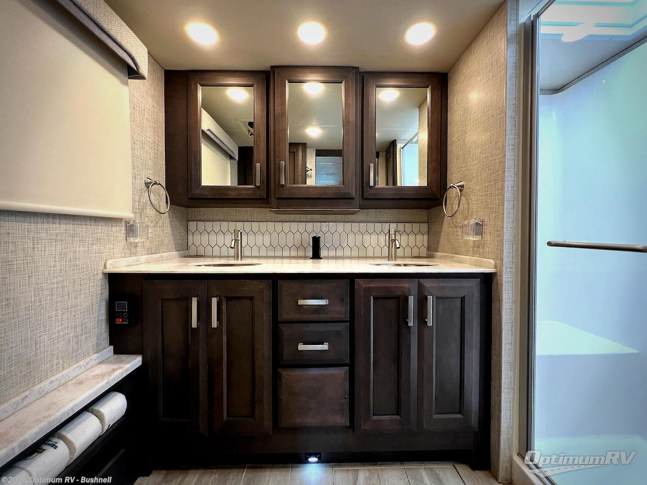 With any Aria Class A diesel motorhome by Thor Motor Coach, experience RV living with all the luxurious amenities you are accustom to, command the roadways with improved handling from the l-beam front axle with a 55-degree wheel cut, and enjoy a smooth ride thanks to the Air-Ride suspension and Sachs shock absorbers. The driver will also appreciate the 10.1" touchscreen dash radio with Bluetooth, navigation, and Sirius/XM prep when navigating the roads, and the comfort of the leatherette reclining/swivel adjustable captain's chairs. The bathroom provides an oversized full height shower with a glass door and a designer backsplash, while the kitchen provides solid surface countertops and a dinette. You'll also enjoy designer tile backsplash, a large double bowl stainless steel sink with a single handle faucet, a pull-down sprayer, plus full kitchen amenities. More standout features include the Studio Collection cabinetry with rake style doors and matte finish, living room pin-up lights, and polished porcelain tile flooring, plus much much more depending on the Aria you take on the road!
