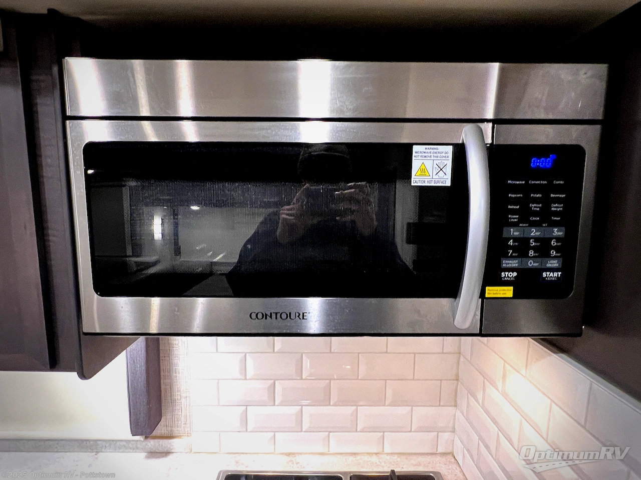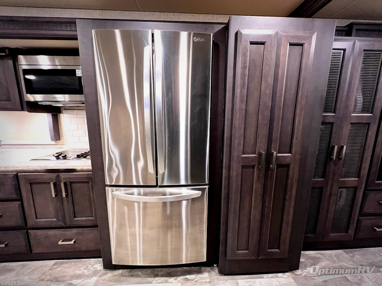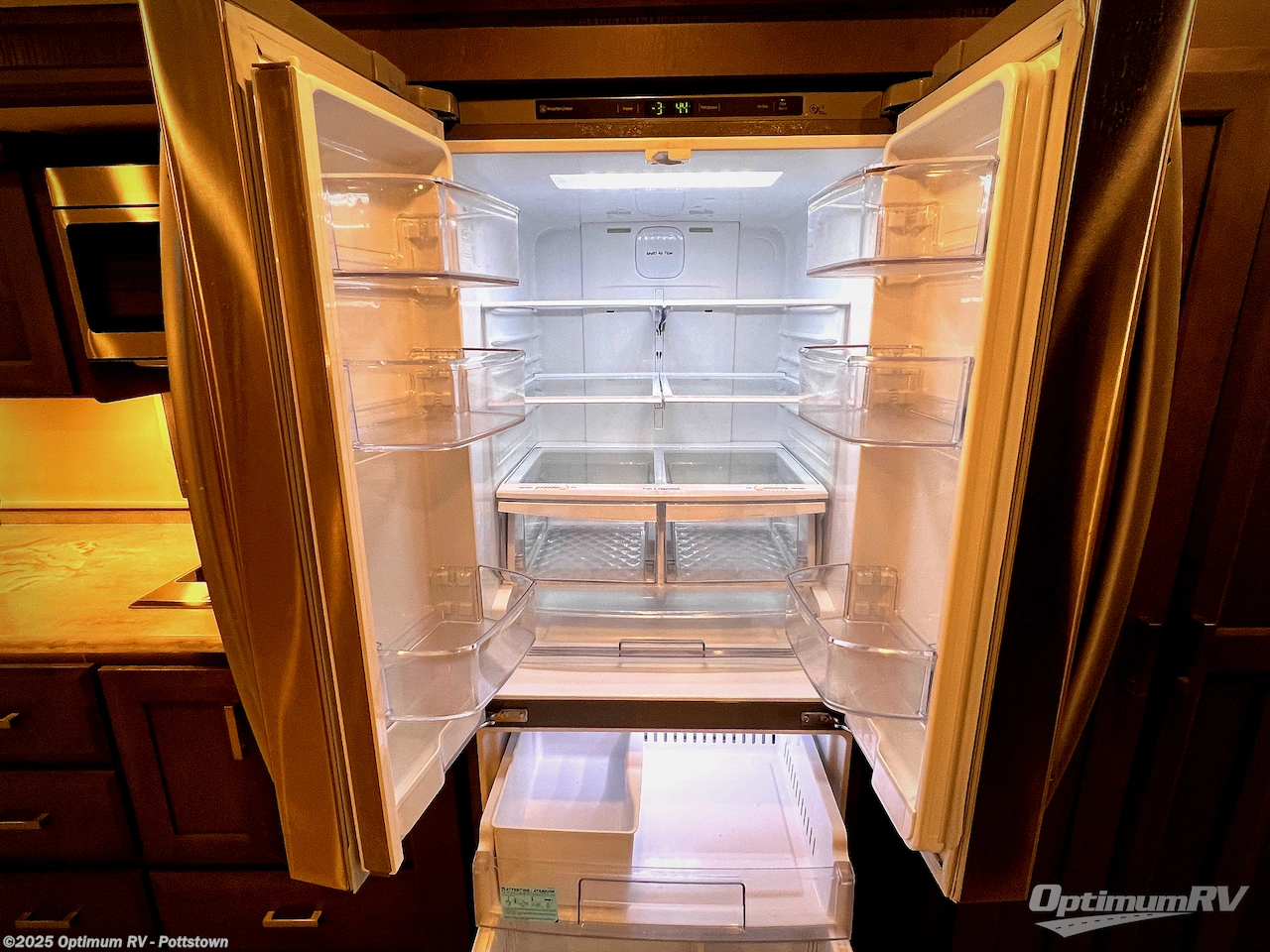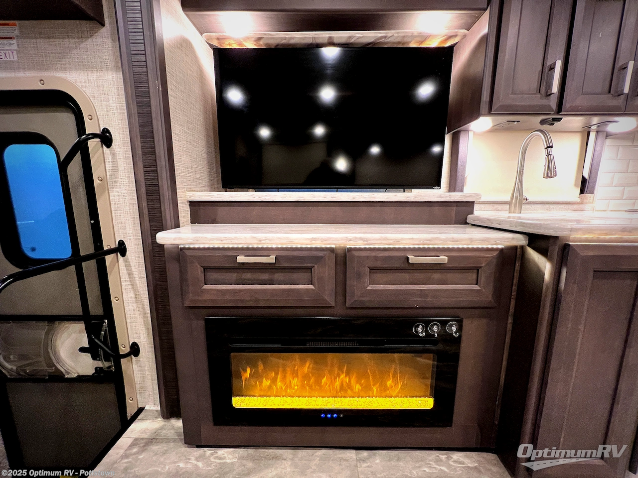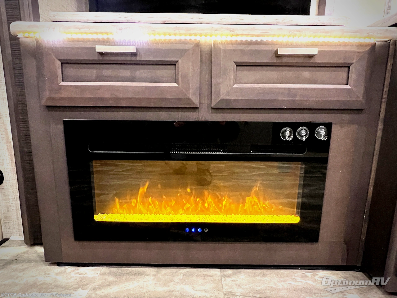 This motorhome features a full-wall slide, plus two additional slides for maximum space and comfort. You can sleep seven people thanks to the drop-down overhead bunk, the king bed slide out, and the furniture in the main living area. The fireplace and retractable 50" TV will make it feel a little more like home, and the residential kitchen is any chef's dream. Since this model includes a bath and a half, your guests won't have to wait in line, and you'll find plenty of storage space throughout for everyone's belongings.