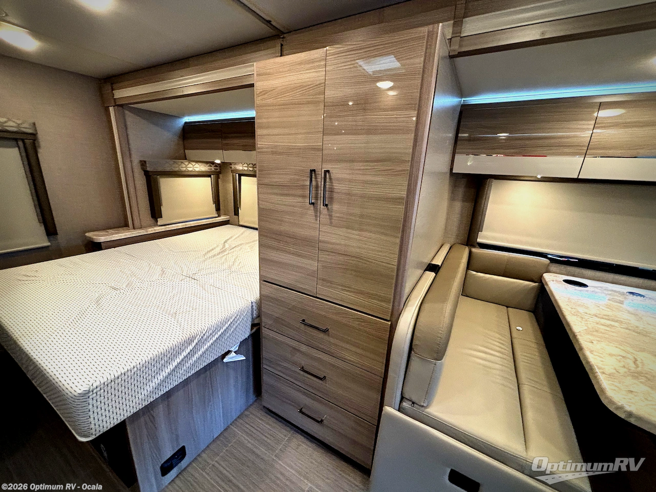 Luxury comes standard in the Delano Sprinter Class C diesel motorhomes by Thor Motor Coach. You will find it so easy to maneuver the road with the Mercedes-Benz Safety package that includes features such as active braking assist and distance regulator distronic plus that will help keep a safe distance from vehicles in front of you. The frameless windows and the full-body paint package with gel coated sidewalls is sure to be eye-catching, plus there is invisible front paint protection for added defense against the elements. Each model includes the Rapid Camp+ multiplex wiring control system that will make set-up easier than ever, a Winegard ConnecT 2.0 WiFi/4G/TV antenna to keep you connected to the outside world, and a whole coach water filtration system for fresh H2O day or night. The Delano Sprinter also includes many interior comforts, like the easy-to-clean residential vinyl flooring, the high-gloss Euro-style cabinetry, and the Leatherette furniture!