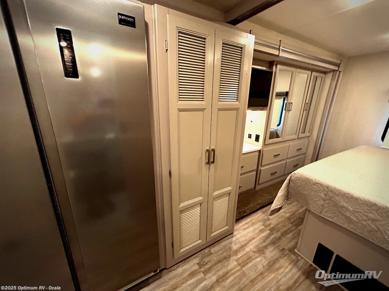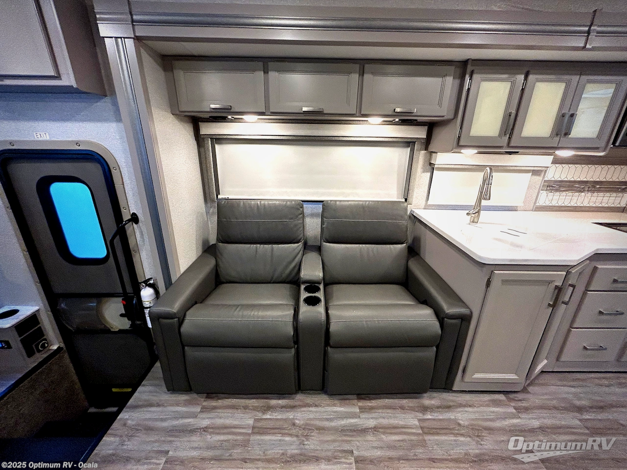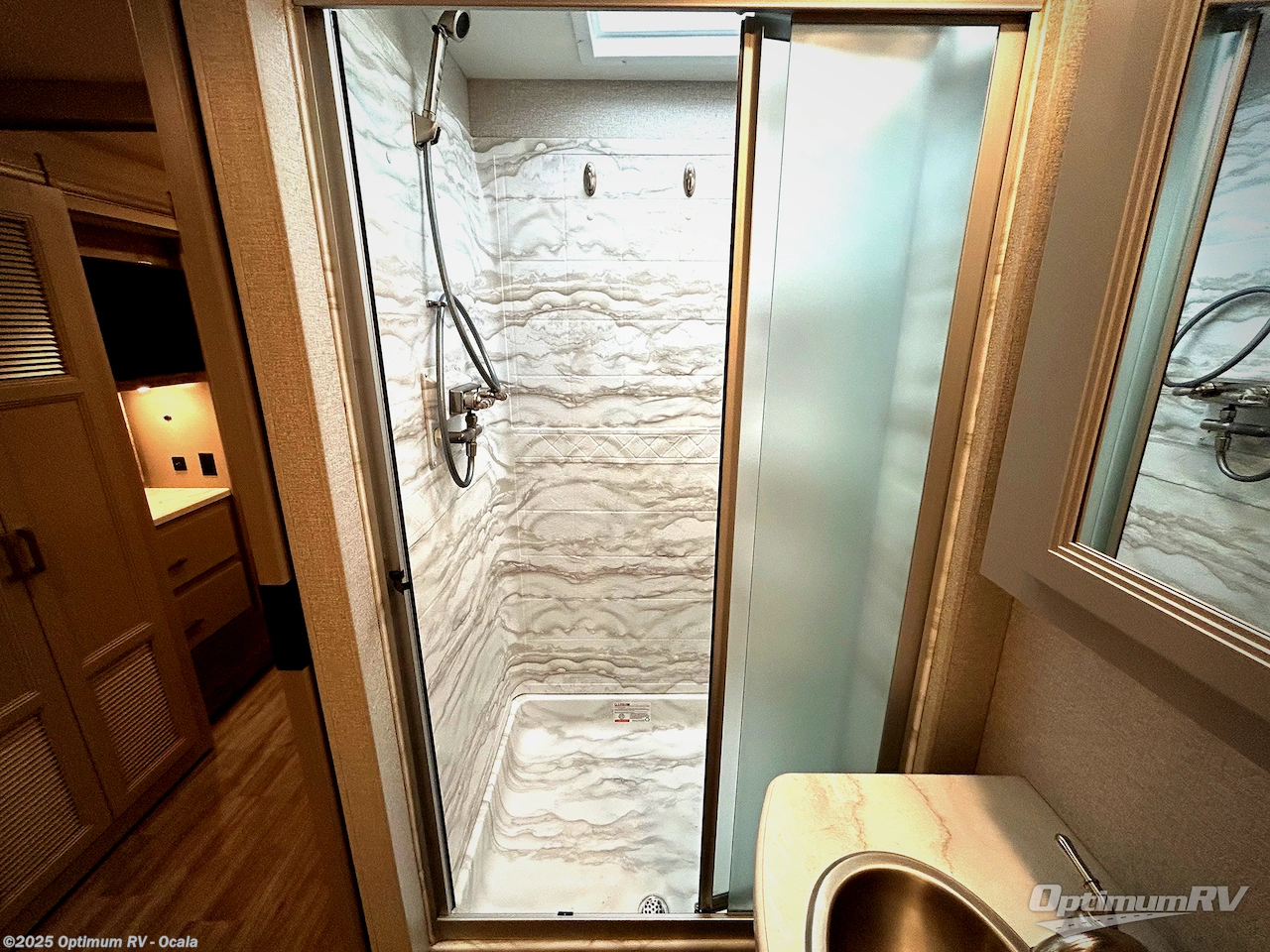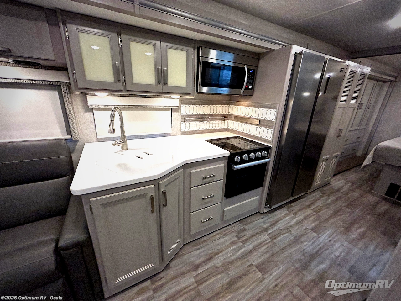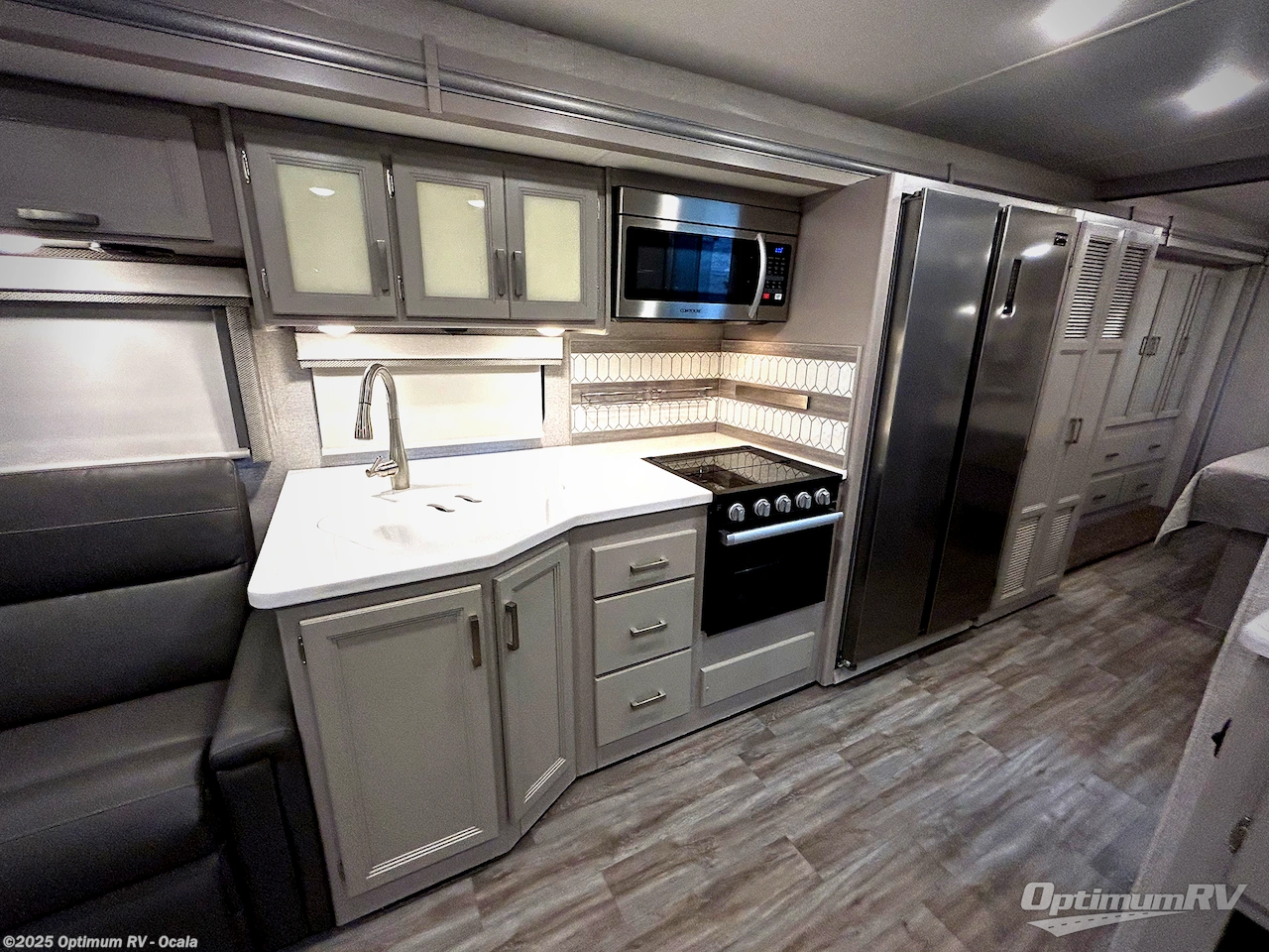 This spacious Class A motorhome has room to sleep eight! Enjoy the privacy of the rear king bedroom which has a spacious closet and a 32" LED TV. Extra guests can utilize the dream dinette, the sofa bed, or the drop-down overhead bunk which has a Cotton Cloud mattress for comfort. As if that's not enough, there's a pair of leatherette theater seats with footrests so you can kick back and watch either of the two living room TVs. You'll also find another TV outside. A full bath with 30" x 36" shower is conveniently located in the center so everyone has access, and the glass shower door and skylight make it feel roomy. The kitchen features a three-burner gas cooktop and oven, refrigerator, stainless steel convection microwave, and pantry.