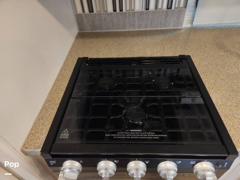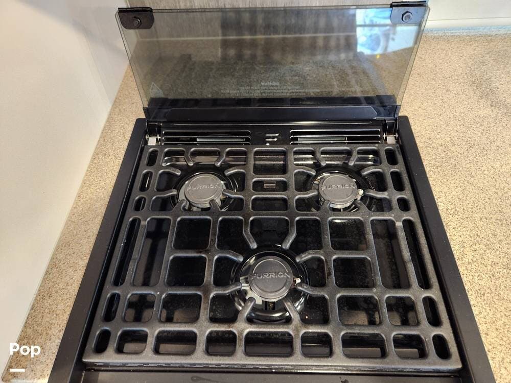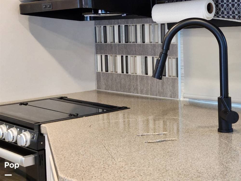 The kitchen offers plenty of space to move around and prepare any meals or snacks. It contains a solid surface countertop with a double stainless steel sink, a three-burner cooktop and oven with a microwave/exhaust combo just overhead. A refrigerator/freezer is just to the other side. There are ample storage cabinets and drawers for all your kitchen needs and more.