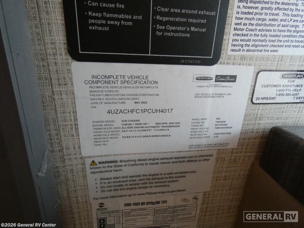 Step into the luxurious world of the 2023 Thor Motor Coach Aria 4000, where elegance meets functionality. This impressive diesel pusher is built on the reliable Freightliner XC-Series chassis and powered by a robust Cummins I6 engine, delivering 360 horsepower and 800 lb-ft of torque. With its sleek exterior and 41-foot length, the Aria 4000 is designed to turn heads while providing a smooth and powerful ride. The spacious interior features a front living area with a 70" sofa bed and an 88" dream dinette, perfect for entertaining or relaxing with family and friends. The tilt-a-view king bed in the center bedroom offers a restful retreat, while the bunk beds and convertible sleeping areas accommodate up to 10 guests comfortably. The Aria 4000 is equipped with modern conveniences to enhance your travel experience. The center kitchen boasts a full-size residential refrigerator, convection cooking, and a two-burner cooktop, making meal preparation a breeze. Enjoy the convenience of a stackable washer and dryer, ensuring you're always ready for the next adventure. The thoughtfully designed floorplan includes a rear and center bath with a tub shower and a separate shower area, offering flexibility and comfort. Outside, the 20-foot powered retractable awning provides the perfect shaded spot for outdoor enjoyment. With a 100-gallon fuel capacity and a towing capacity of 10,000 pounds, the Aria 4000 is ready to take you wherever the road leads. For more details or to experience this remarkable RV in person, visit your nearest General RV dealership.