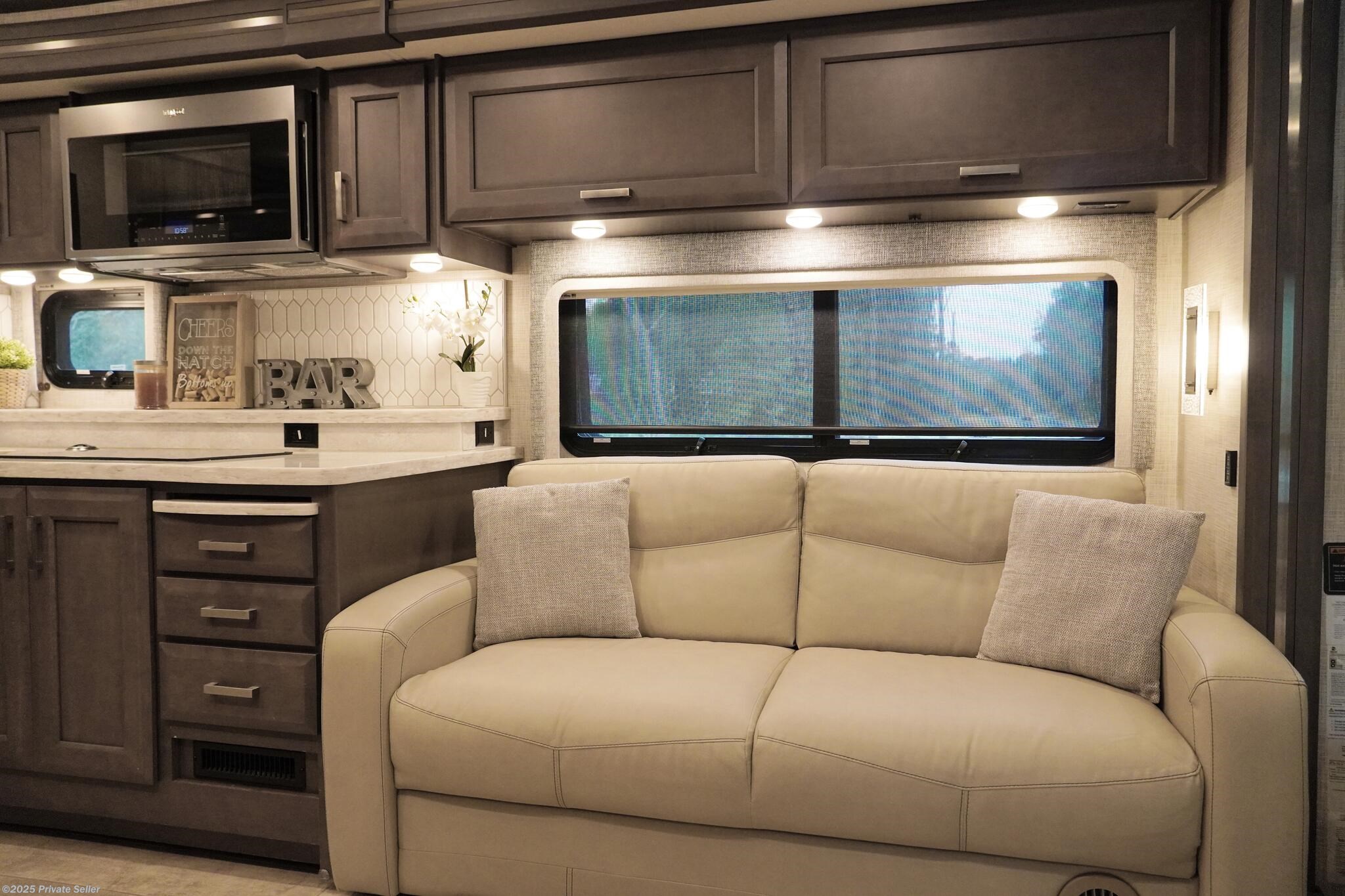 Step into the spacious living area and you’ll find a 70” trifold sofa, Dream dinette, and swivel captain’s chairs – plenty of room to stretch out or entertain. A sleek 49” TV and upgraded sound system set the stage for movie nights, while the full kitchen with pull-out countertop, solid surface counters, and designer finishes makes cooking on the road a pleasure.