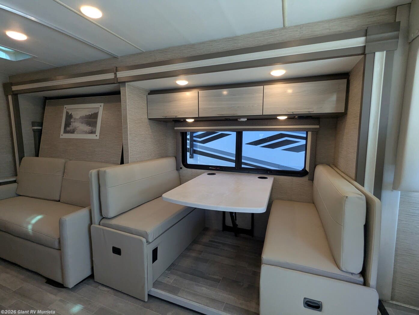 - Full-Wall Slide: Spacious living area with a 75" booth dinette, 32" TV, and power drop-down bunk, sleeping up to 5.