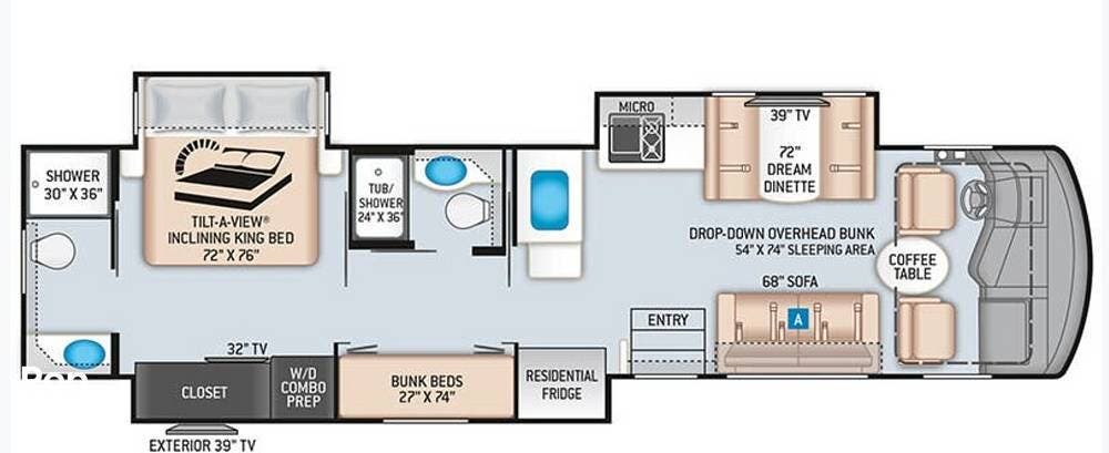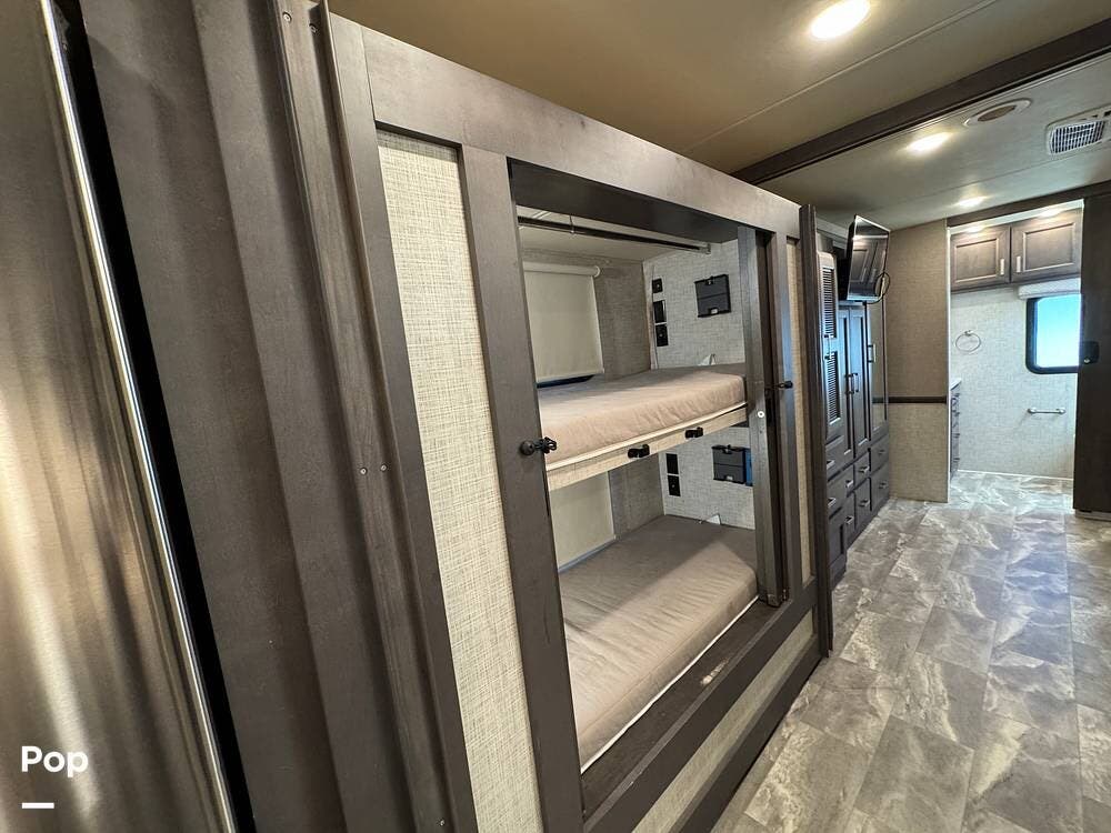 Designed for large families or travel groups, the 37DS comfortably sleeps up to 10 with a layout that includes a king-size Tilt-A-View bed, bunk beds, a sleeper dinette, a sleeper sofa, and an overhead drop-down bunk.