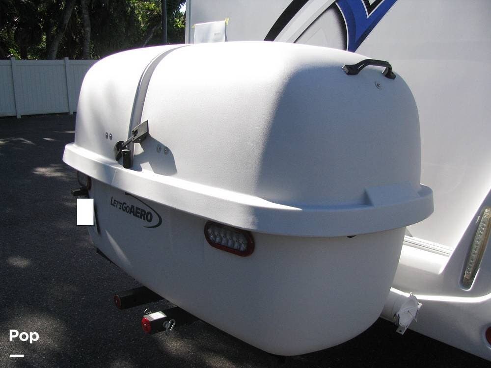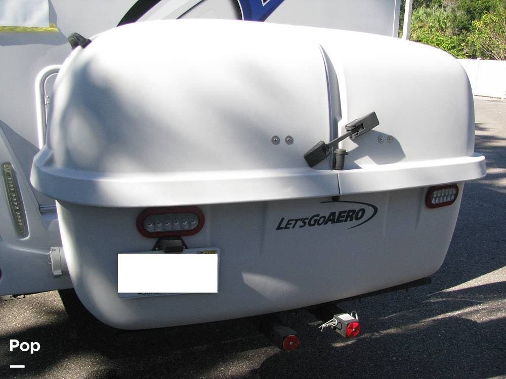 The RV comes with a really nice cargo box that connects to the rear hitch for extra storage and features lights.