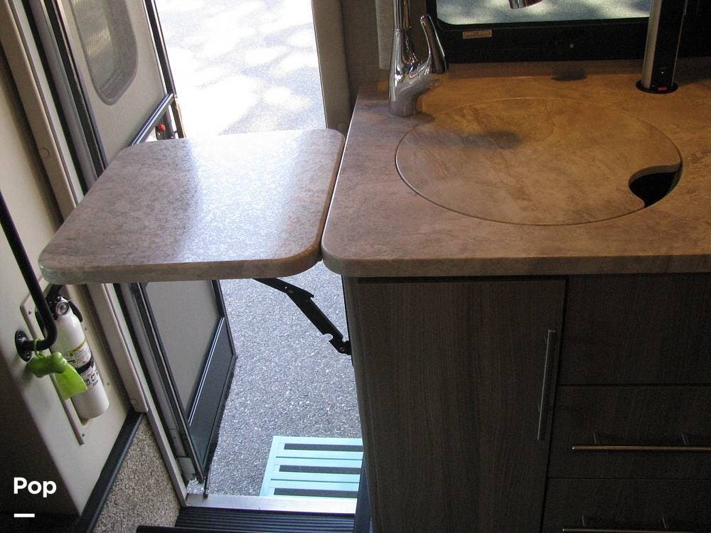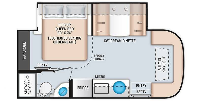 The RV's design offers ease of use and comfort throughout. It has easy access from the cab all the way through the RV with the galley and bathroom on the passenger side and the dining and bed on the driver's side.