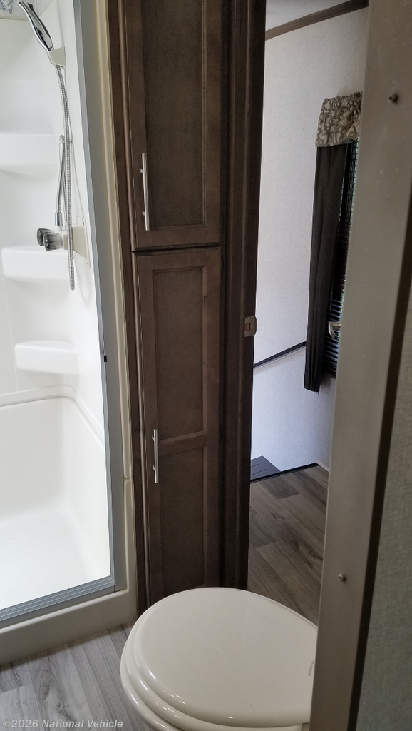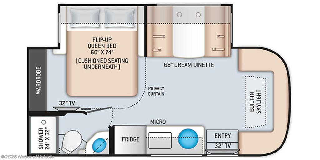 You can tour a local winery or trek up north to find a cozy and secluded camping spot with this Compass AWD Class C gas motorhome! All of your needs will be met with the excellent features and amenities included on this coach, like the full bathroom complete with a 24" x 32" shower, three robe hooks, a shower skylight, a foot-flush toilet, and a power bath vent. The kitchen is ready to help you make mobile meals, and the 68" Dream Dinette is the perfect place for eating those meals or playing a game later on. At the dinette table top, you'll find a wireless phone charger with USB plug so that you can charge your phones. There is a privacy curtain that sections off the flip-up RV queen bed, and you'll also find a 32" TV in the bedroom. The second 32" TV is located out in the main living area for everyone else to watch.