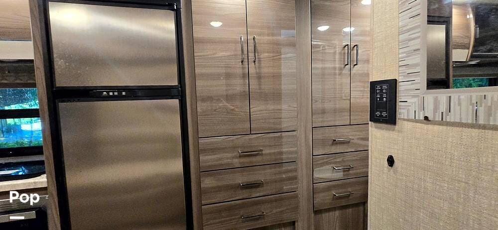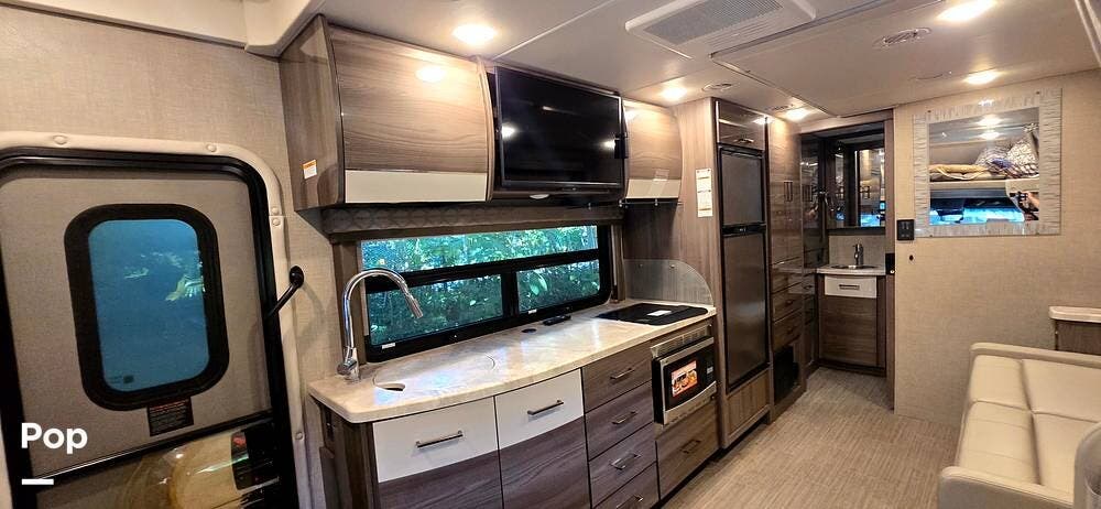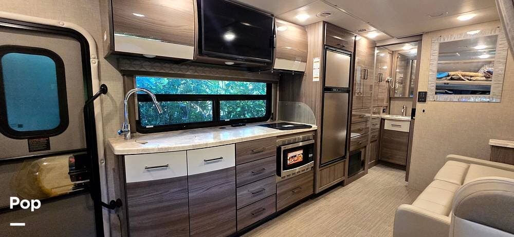 Step inside, and a spacious, beautifully appointed interior greets you with 80-inch ceilings and a soft-touch vinyl finish. LED lighting and high-gloss Euro-style cabinetry accent the open floor plan, while residential vinyl flooring provides durability and easy maintenance.