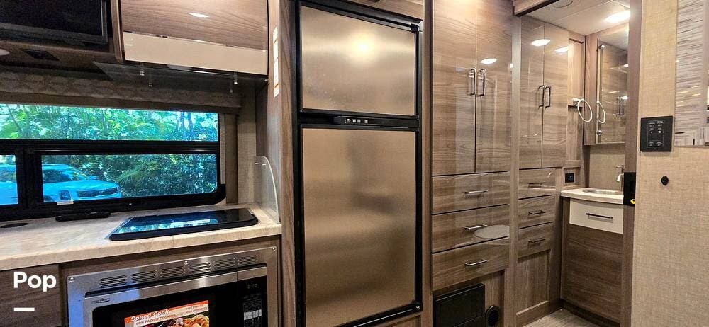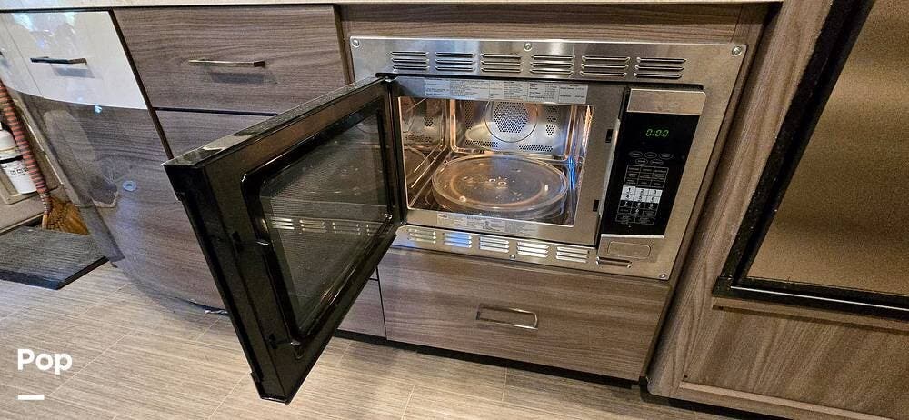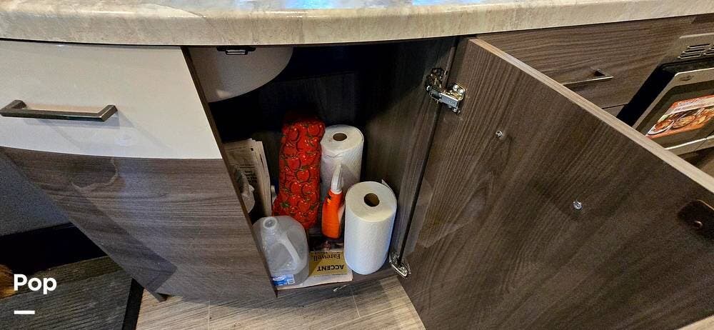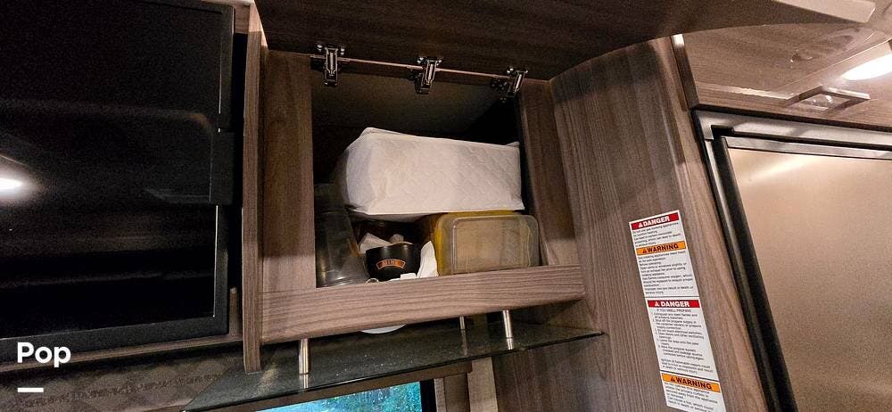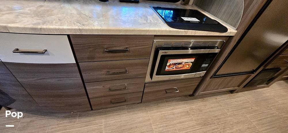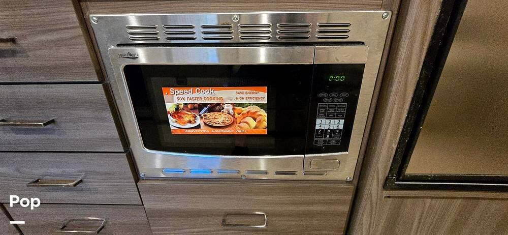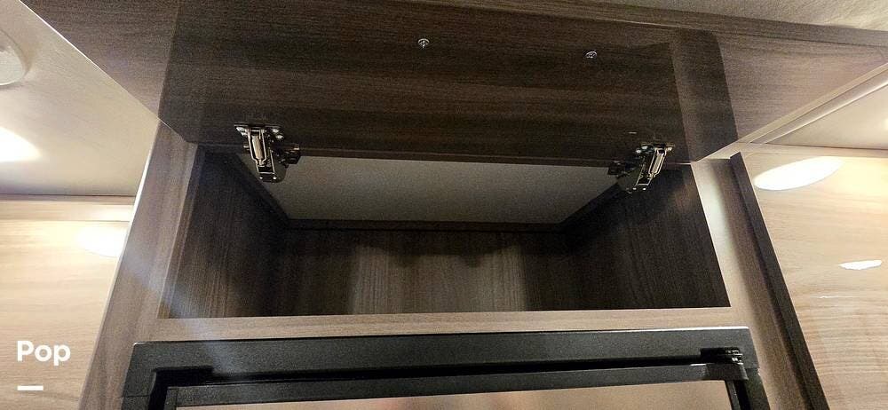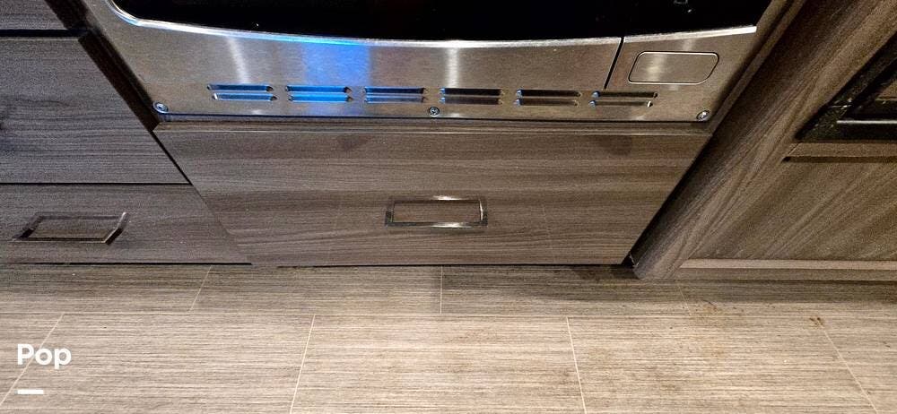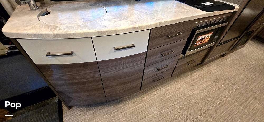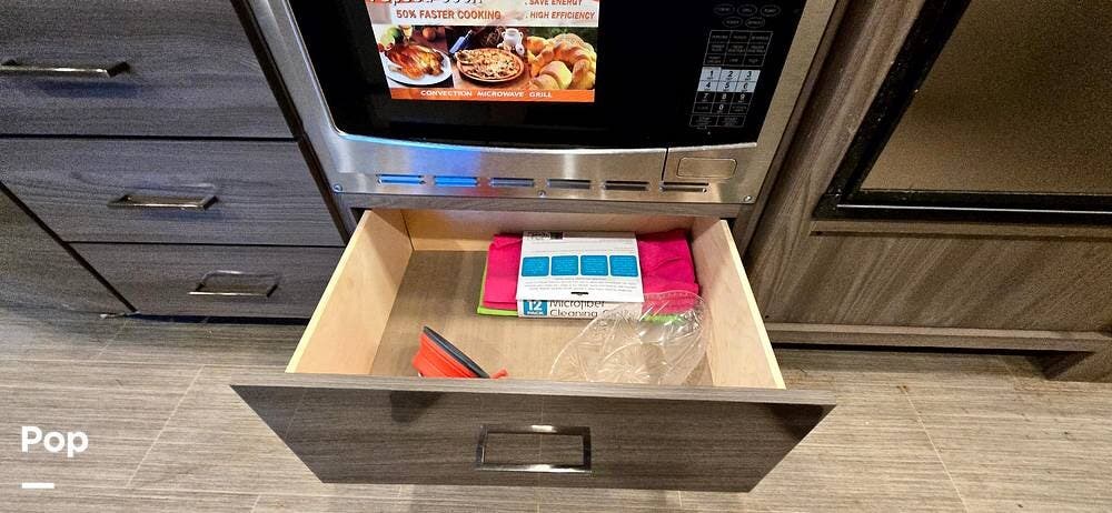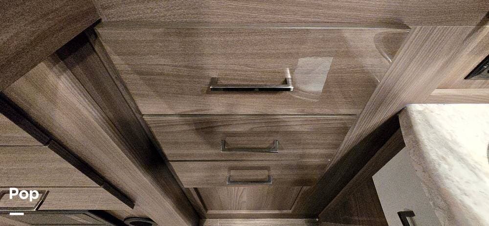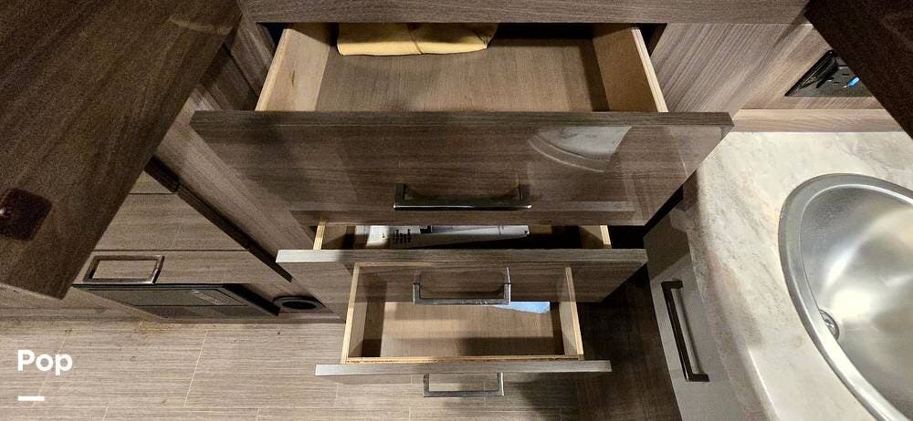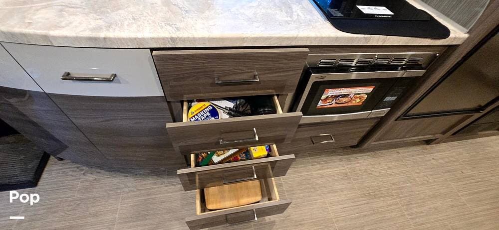 The kitchen is fully equipped for on-the-go meals and houses a 32" LED TV on a swing mount that opens to a cabinet. Appliances a Dometic two-burner LP cooktop with a glass cover, stainless-steel High Point microwave convection oven, Norcold 7 cu./ft. dual power double-door refrigerator, deep stainless sink, and pressed laminate countertops with ample workspace. Soft-close drawers and pantry storage maximize every inch of the galley.