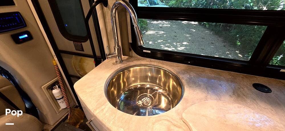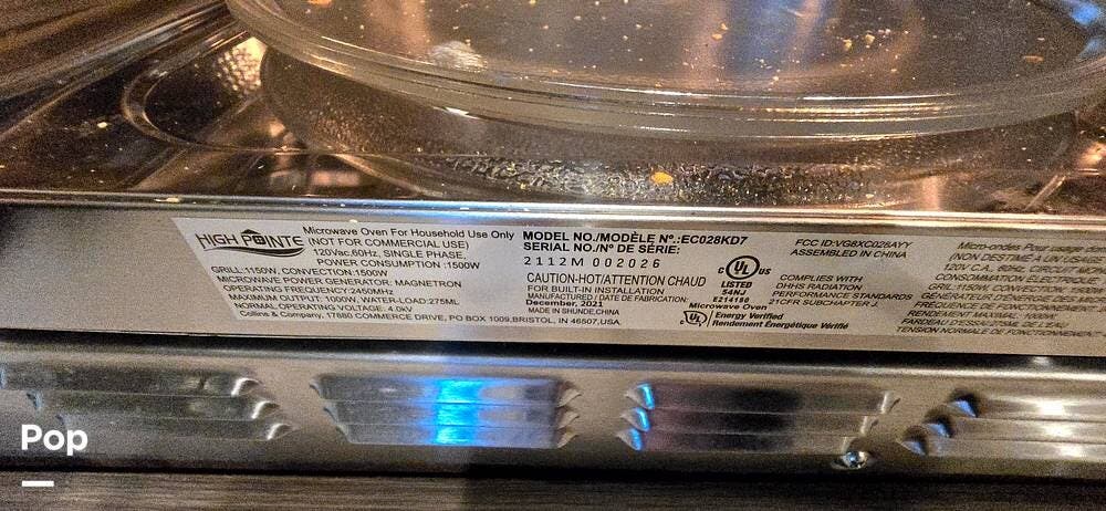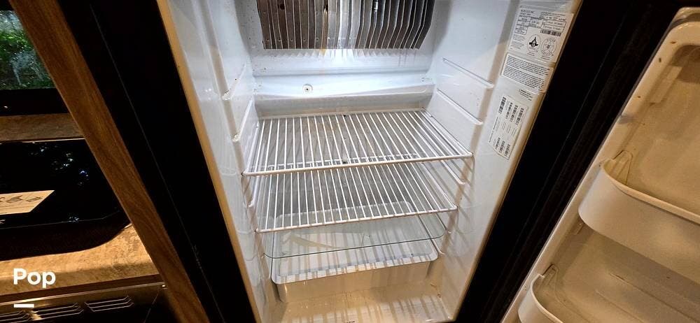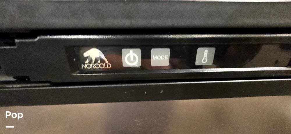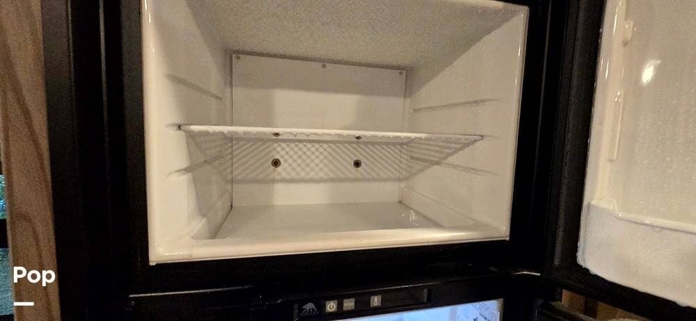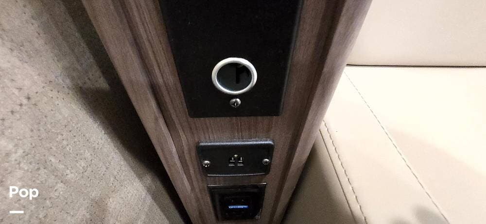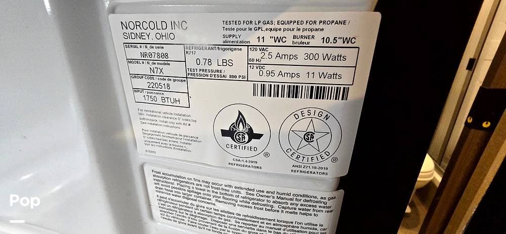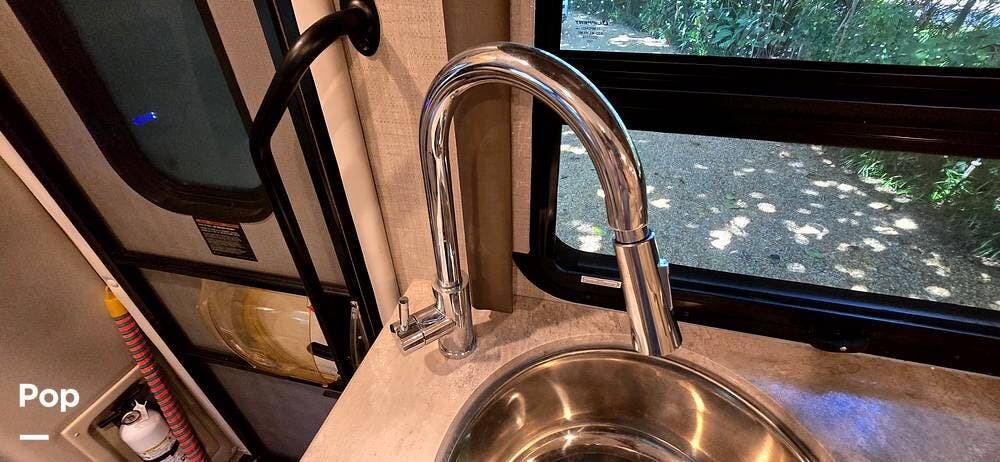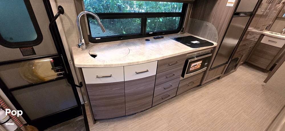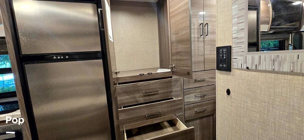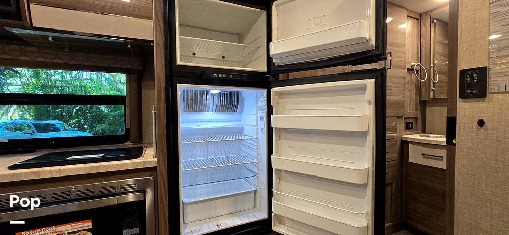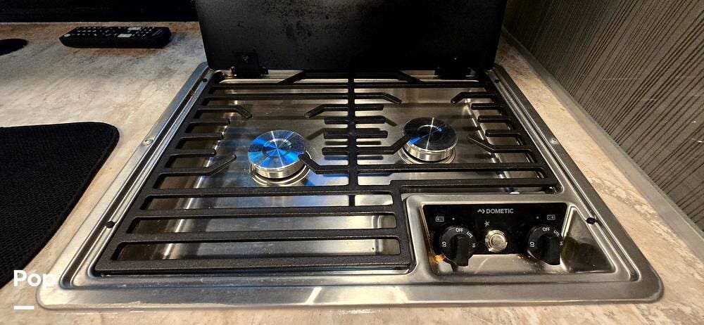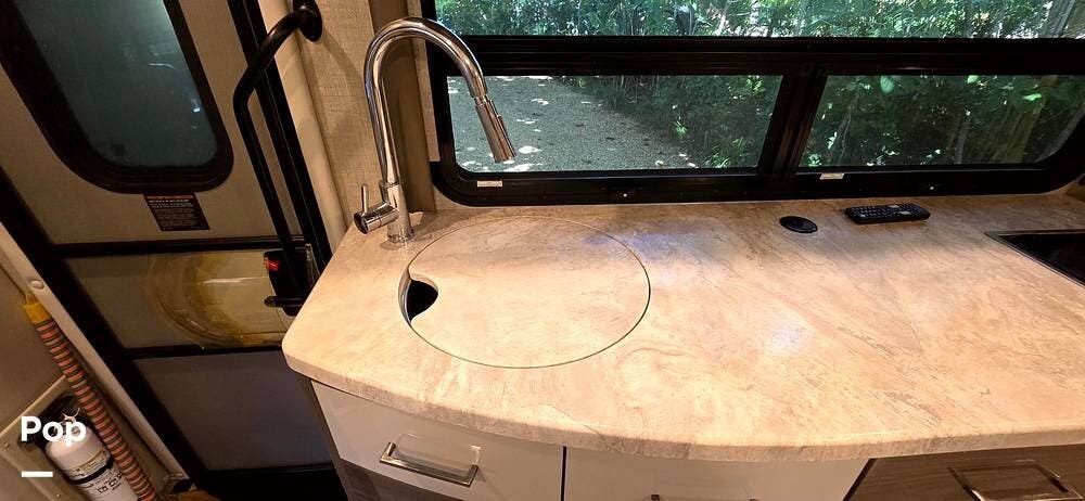 The kitchen is fully equipped for on-the-go meals and houses a 32" LED TV on a swing mount that opens to a cabinet. Appliances a Dometic two-burner LP cooktop with a glass cover, stainless-steel High Point microwave convection oven, Norcold 7 cu./ft. dual power double-door refrigerator, deep stainless sink, and pressed laminate countertops with ample workspace. Soft-close drawers and pantry storage maximize every inch of the galley.