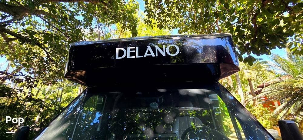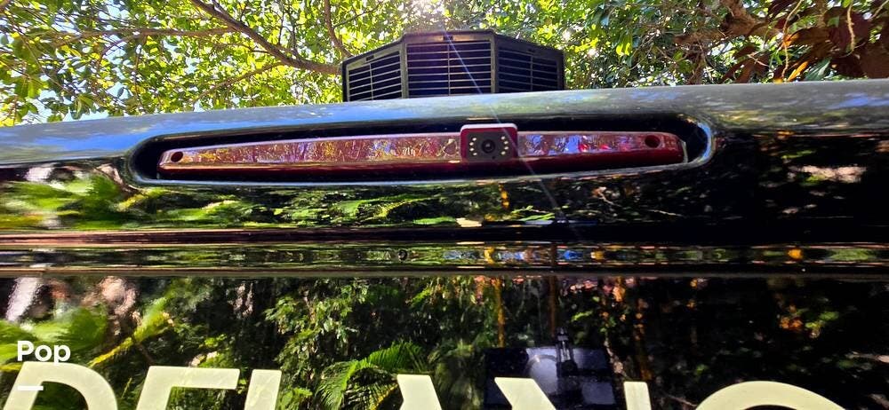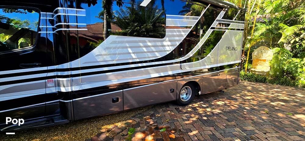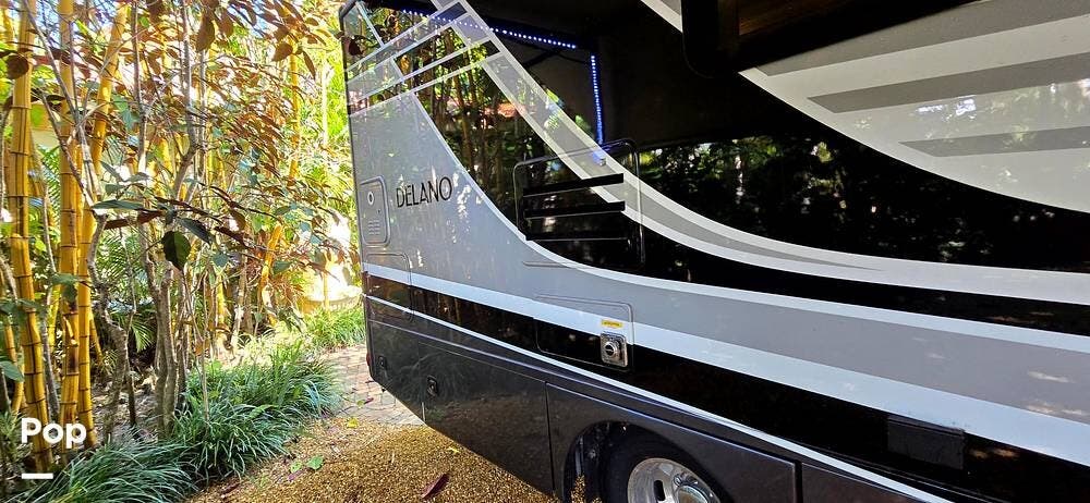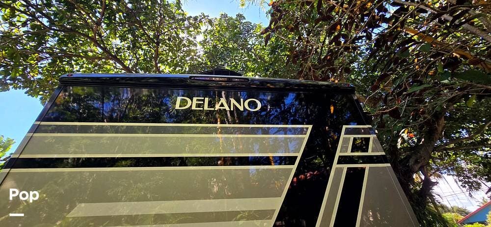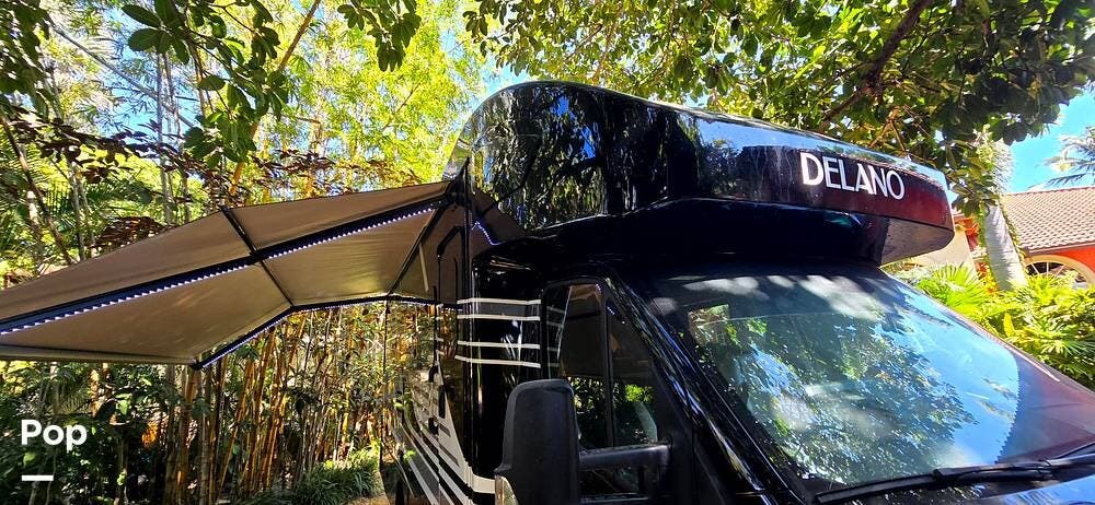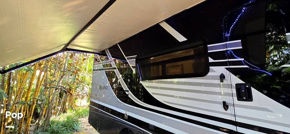 Ease of use is a hallmark of the Delano's design, featuring lighted Rotocast storage bays with side-hinged doors for quick access to gear. A two-stage, armless power patio awning with integrated LED lighting provides generous shade and an ideal outdoor entertainment space. The automatic electric entry step and keyless entry system make setup simple and secure at every destination.