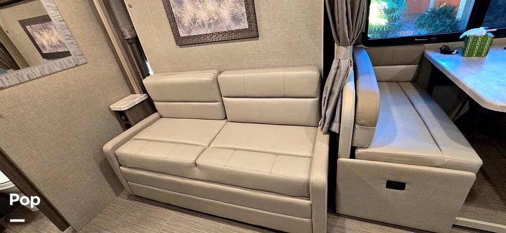 Across from the kitchen, the living area features a dream dinette that offers a relaxing spot to dine or converts into an additional sleeping space. The living area features a comfortable sofa with a queen-size Murphy bed that folds down when it's time to rest.
