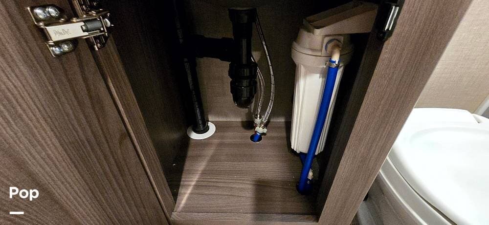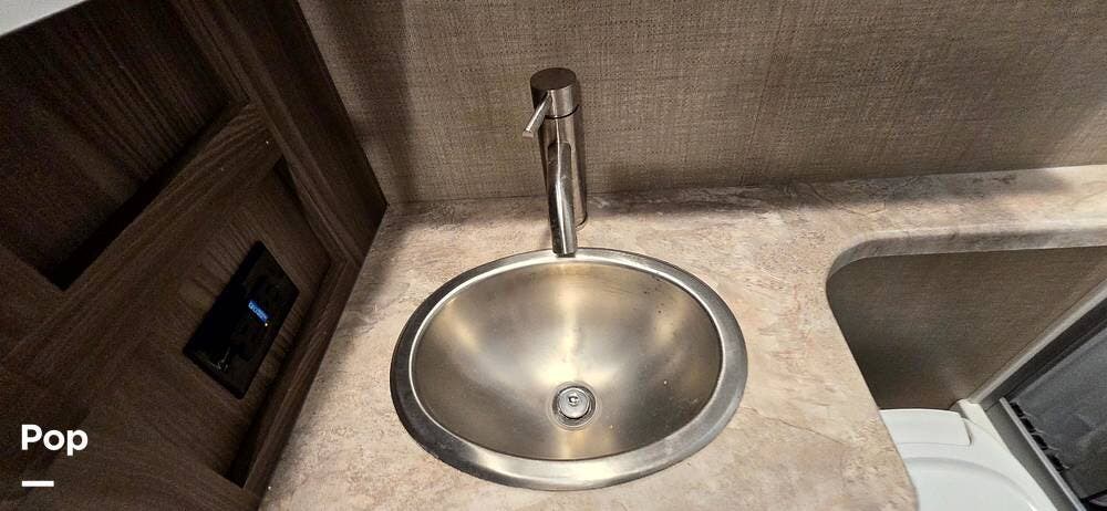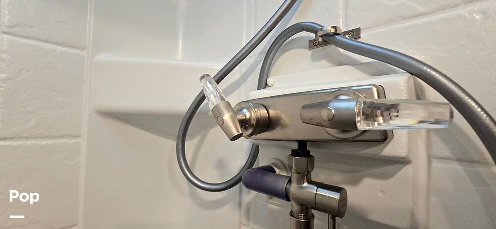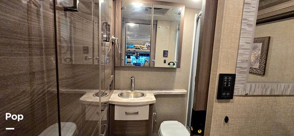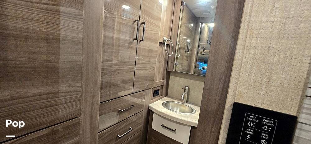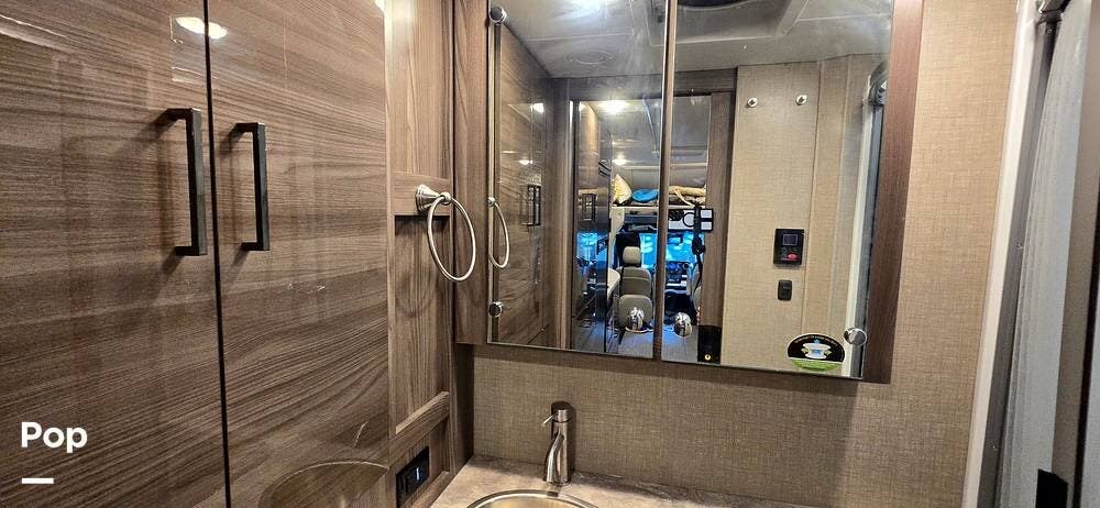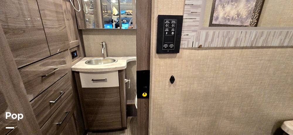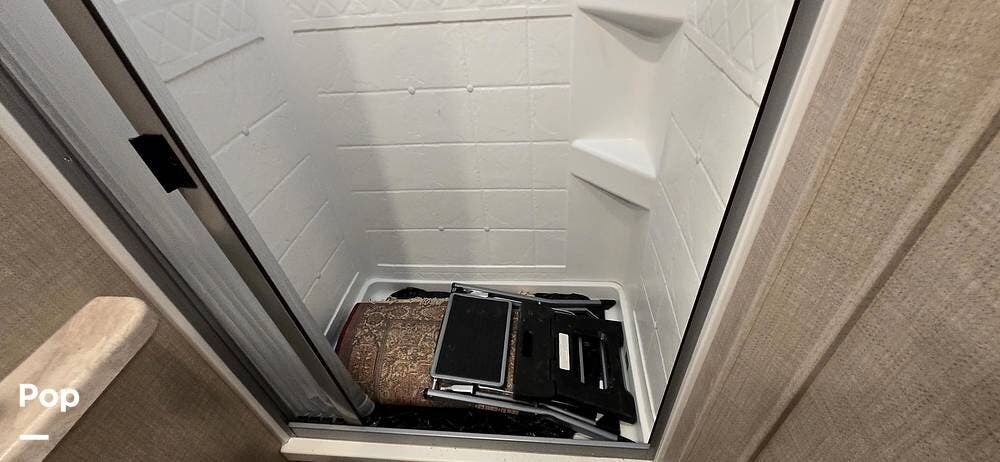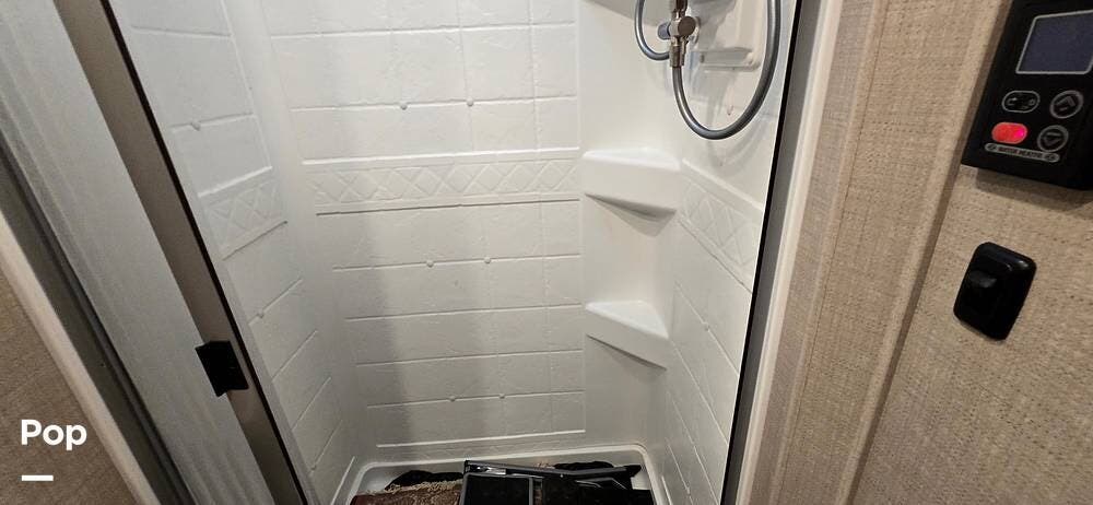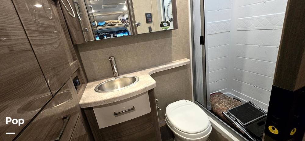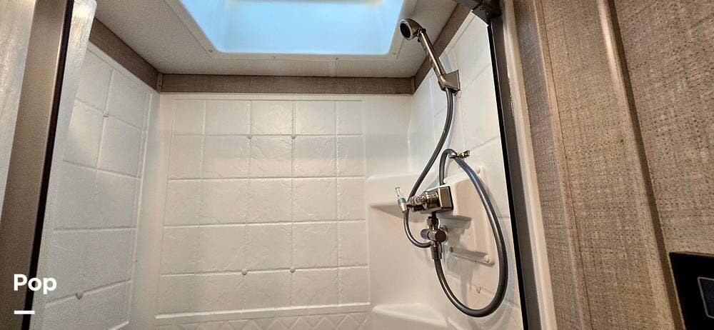 The bathroom offers a residential feel, with a spacious shower featuring an antimicrobial curtain, a foot-flush porcelain toilet, and a vanity with sink and storage. A 12-volt vent fan and tankless water heater ensure fresh air and continuous hot water on demand.